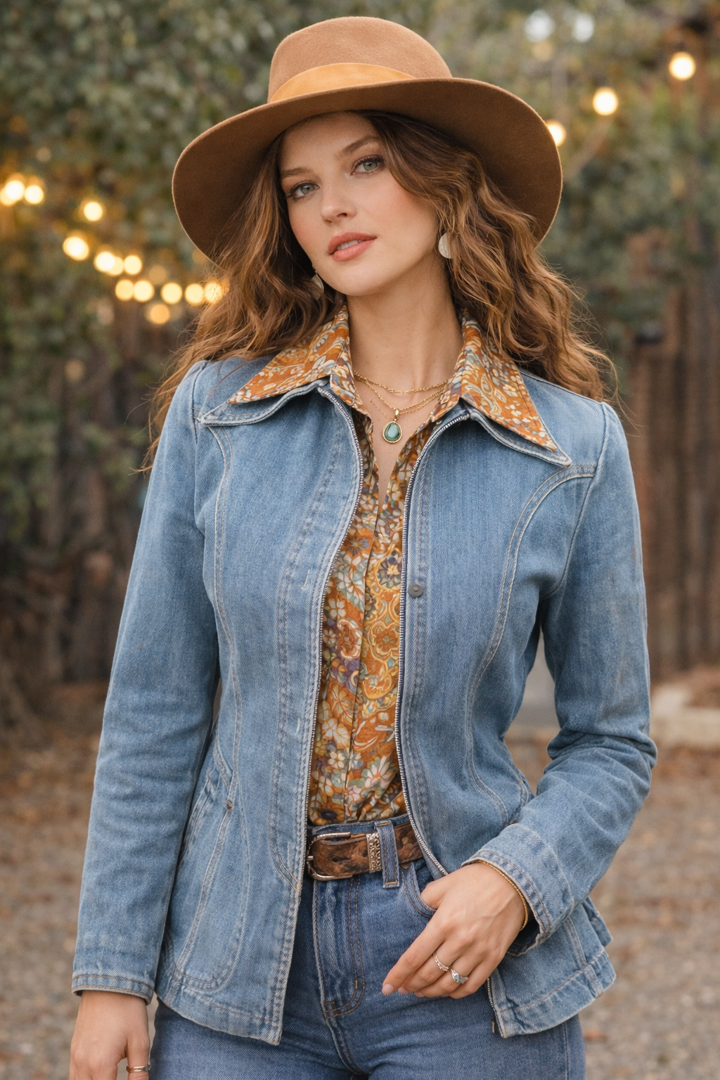 A collectible vintage denim jacket with authentic wear and character, perfect for layering or styling with your favourite flares.