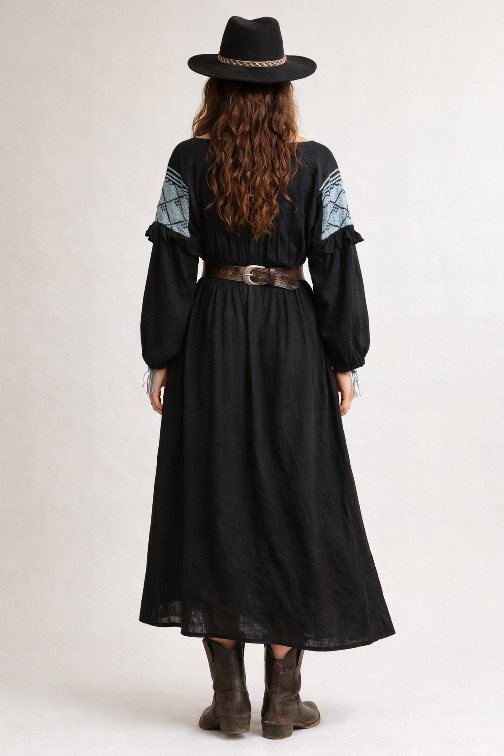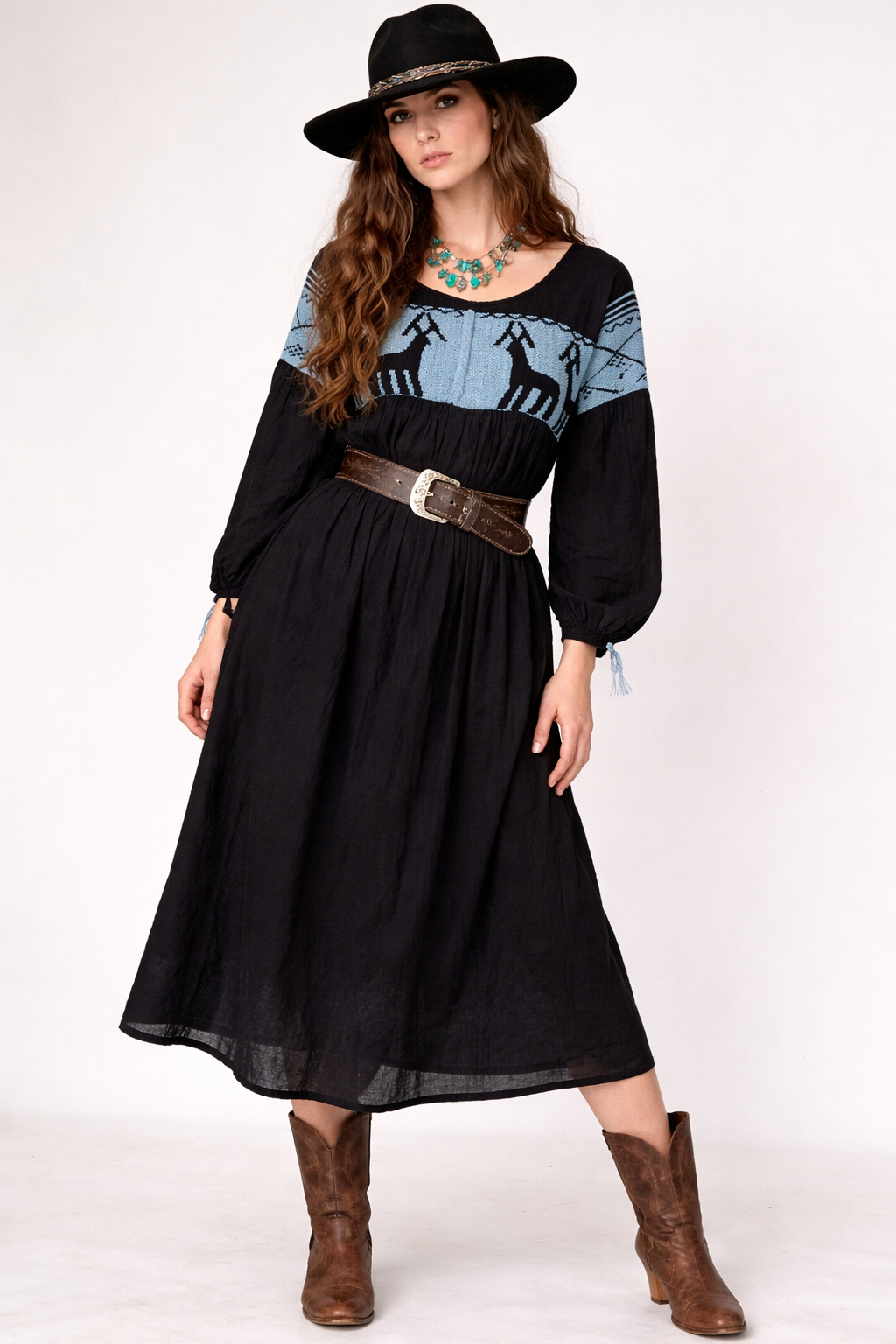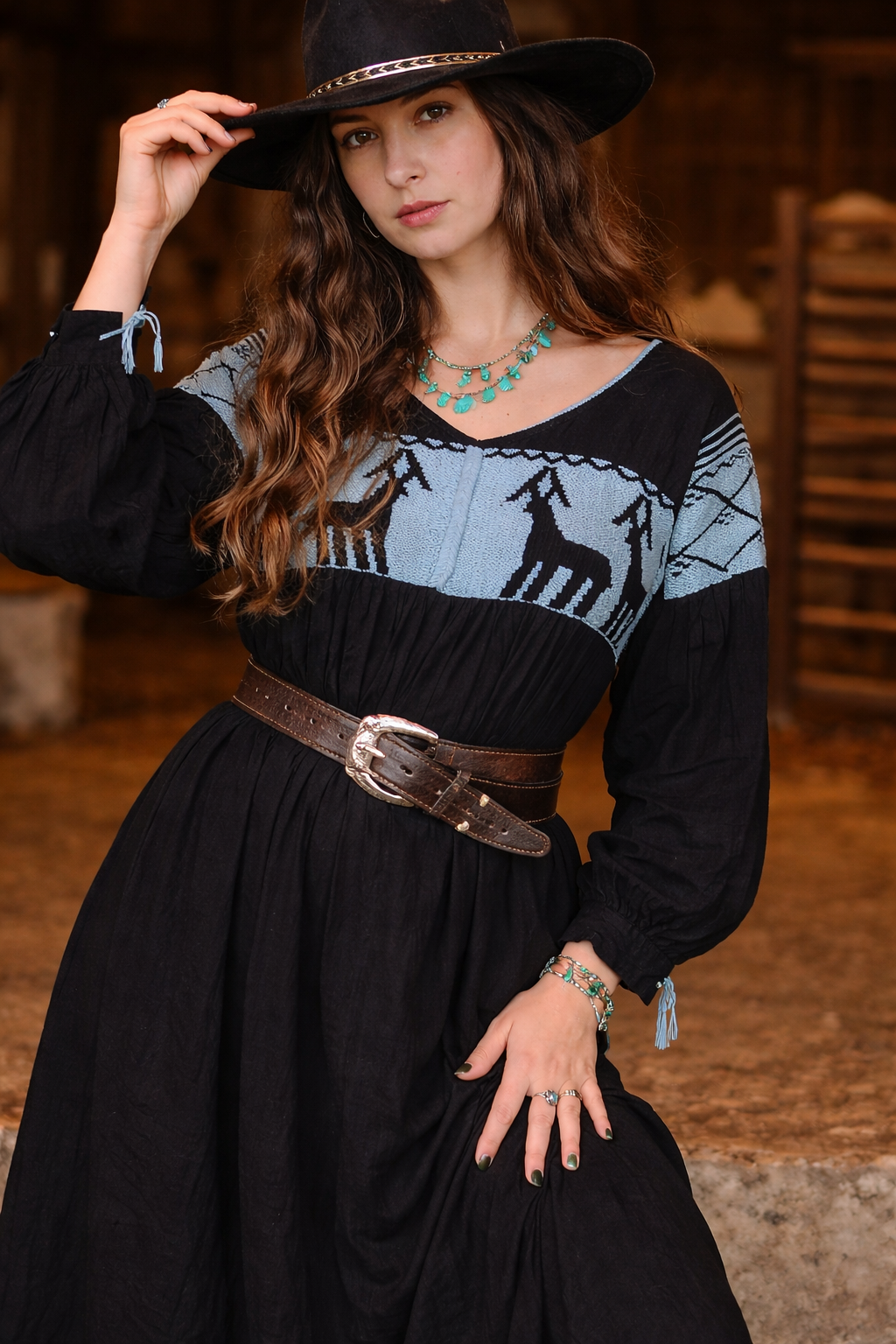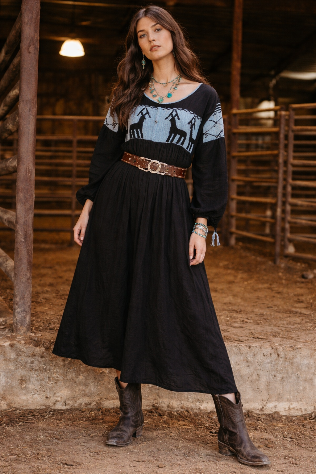 A rare vintage Mexican cotton dress, crafted in soft black cotton with striking handwoven blue embroidery. The bodice features an intricate pattern of deer and geometric motifs, bringing a folkloric, artisanal touch. Long sleeves finish with tie cuffs, and the relaxed cut flows into a full-length silhouette.