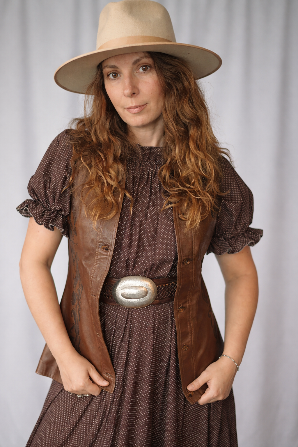 This rare Cannibal leather vest is a total heart-stealer—crafted in buttery soft brown leather with inky black embossed scrollwork dancing down each side. She’s fitted through the waist with a subtle flare at the hips, creating that longline silhouette we all crave. Finished with classic tortoiseshell buttons, she pairs effortlessly with prairie dresses, denim flares, or worn open over a floaty blouse.