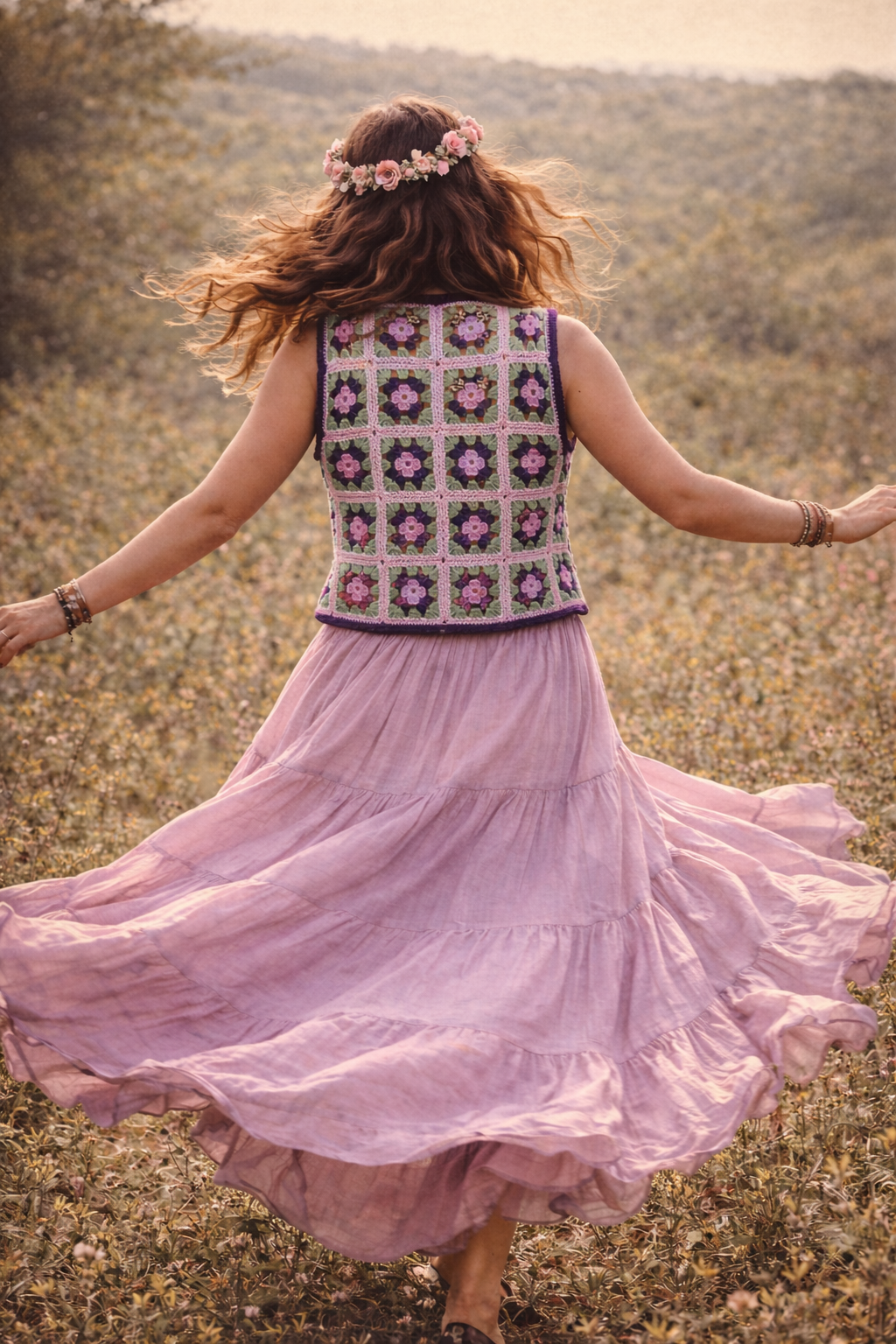 Bring true boho festival vibes with this one-of-a-kind 70’s handmade crochet vest. Designed from classic granny-square motifs in purple, lilac, and green, it features a lace-up front and fitted cut that flatters the waist. Perfect styled over flares, dresses, or layered with your favourite boho pieces.