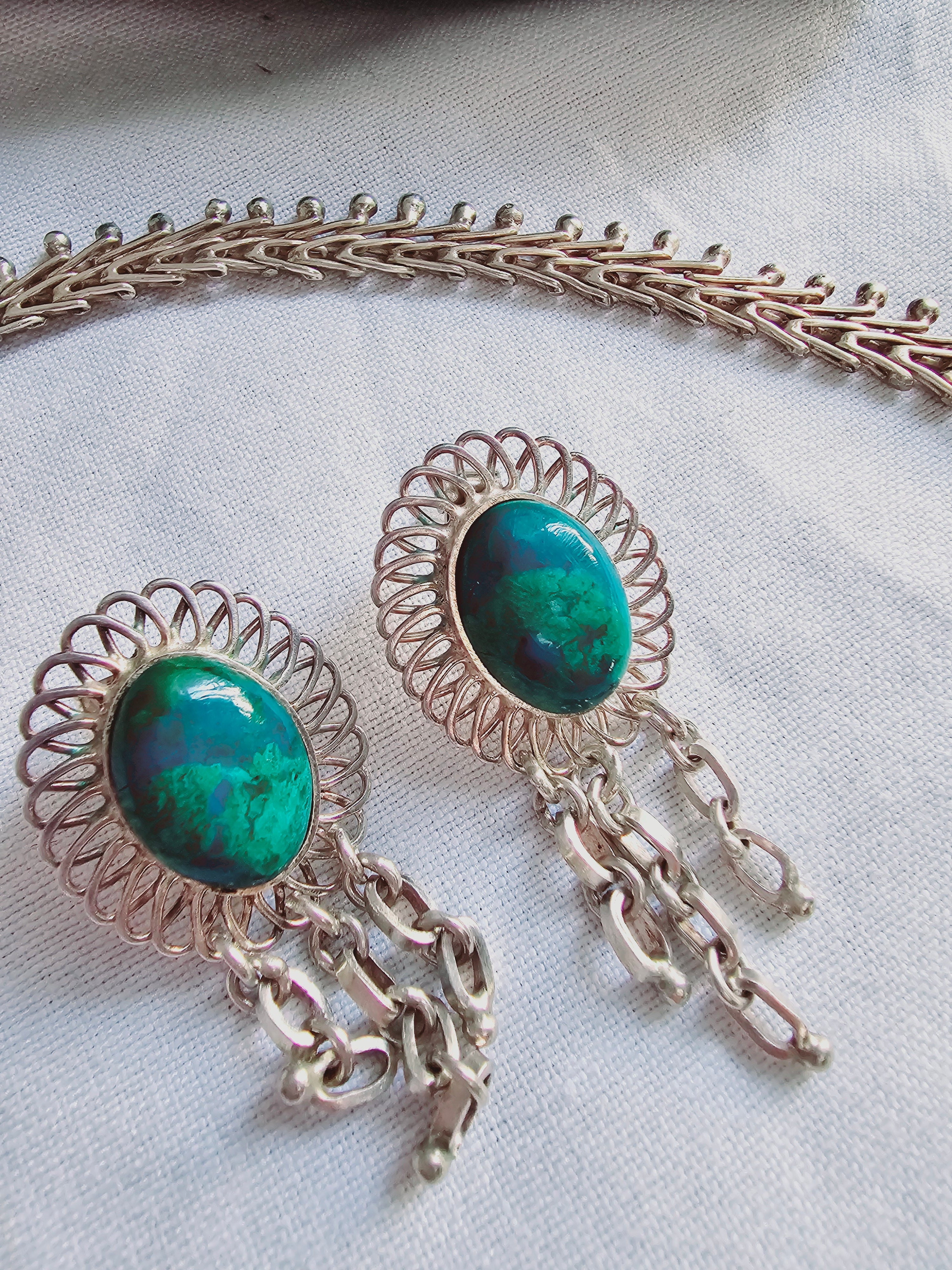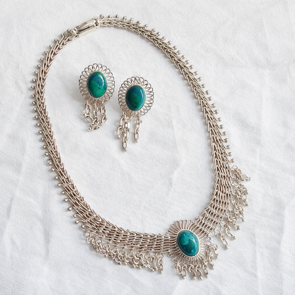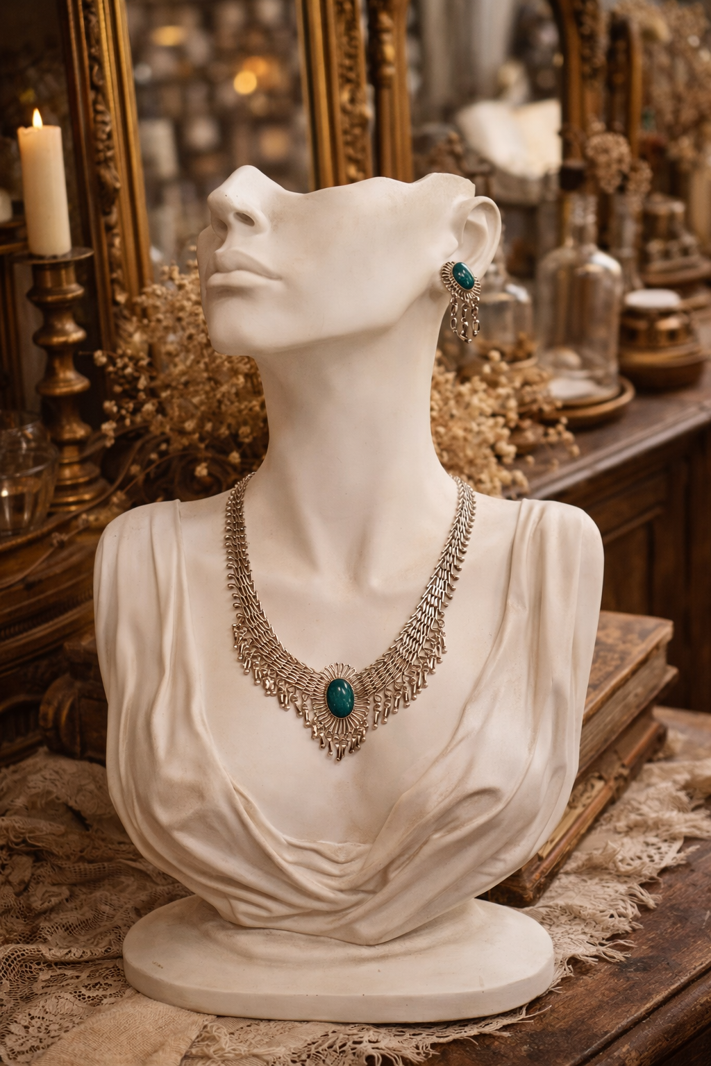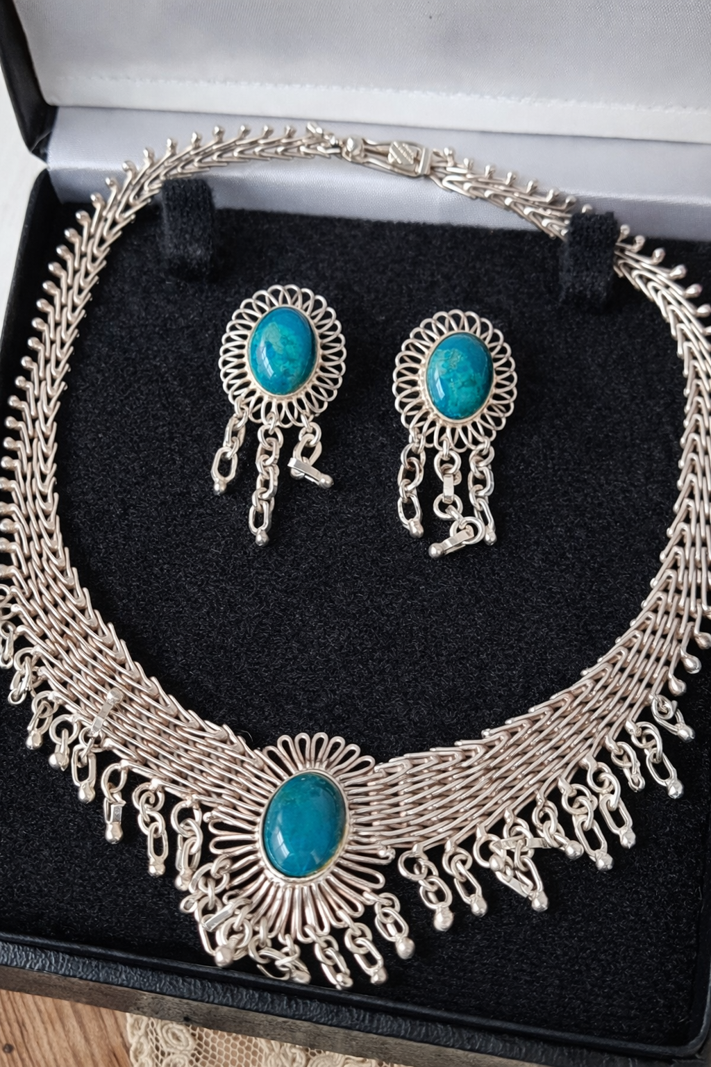 A striking vintage set that captures the soul of desert skies and old-world silverwork. Rich turquoise stones sit in intricate handcrafted settings, framed by cascading chain detail that moves beautifully with you. Bold yet timeless — this is the kind of heirloom set that transforms even the simplest outfit.