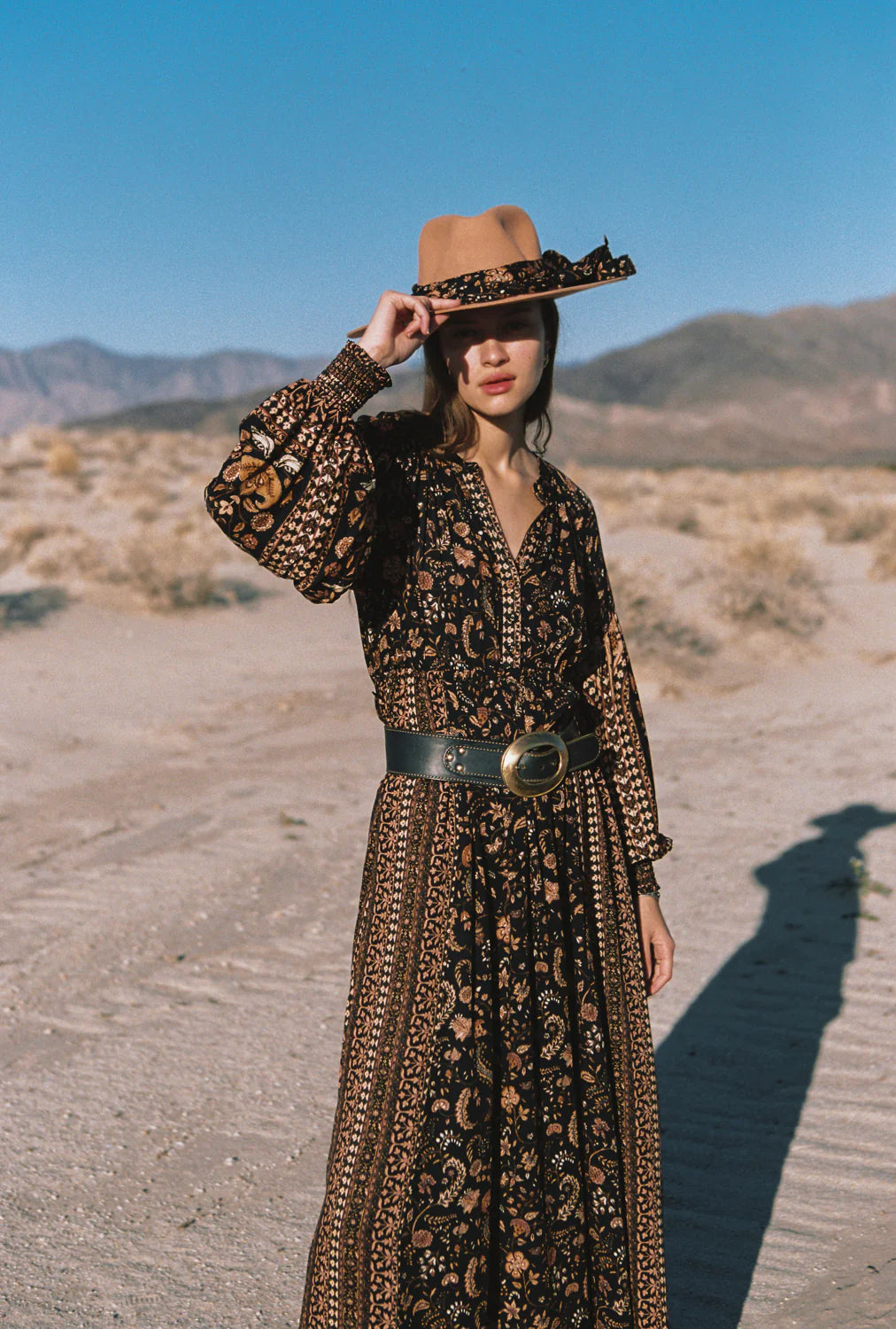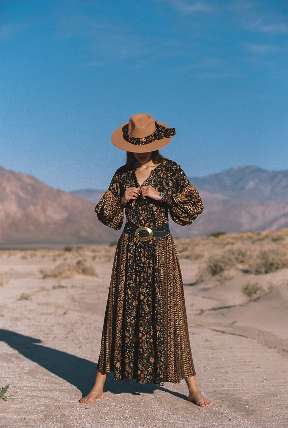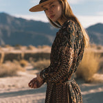 The warm apricot tone pairs perfectly with our Wild Atlas collection, as seen here with the Renata Sundress.