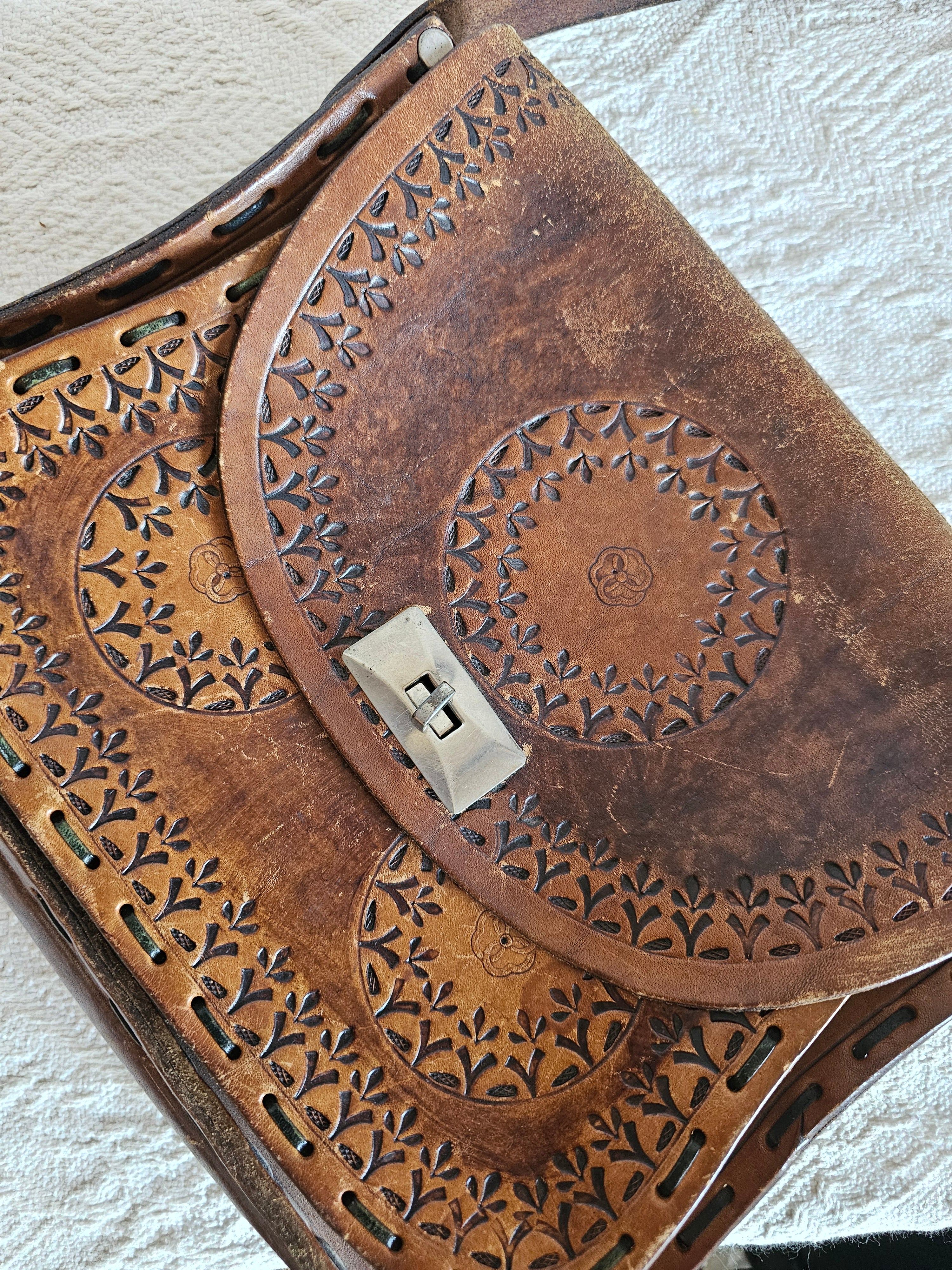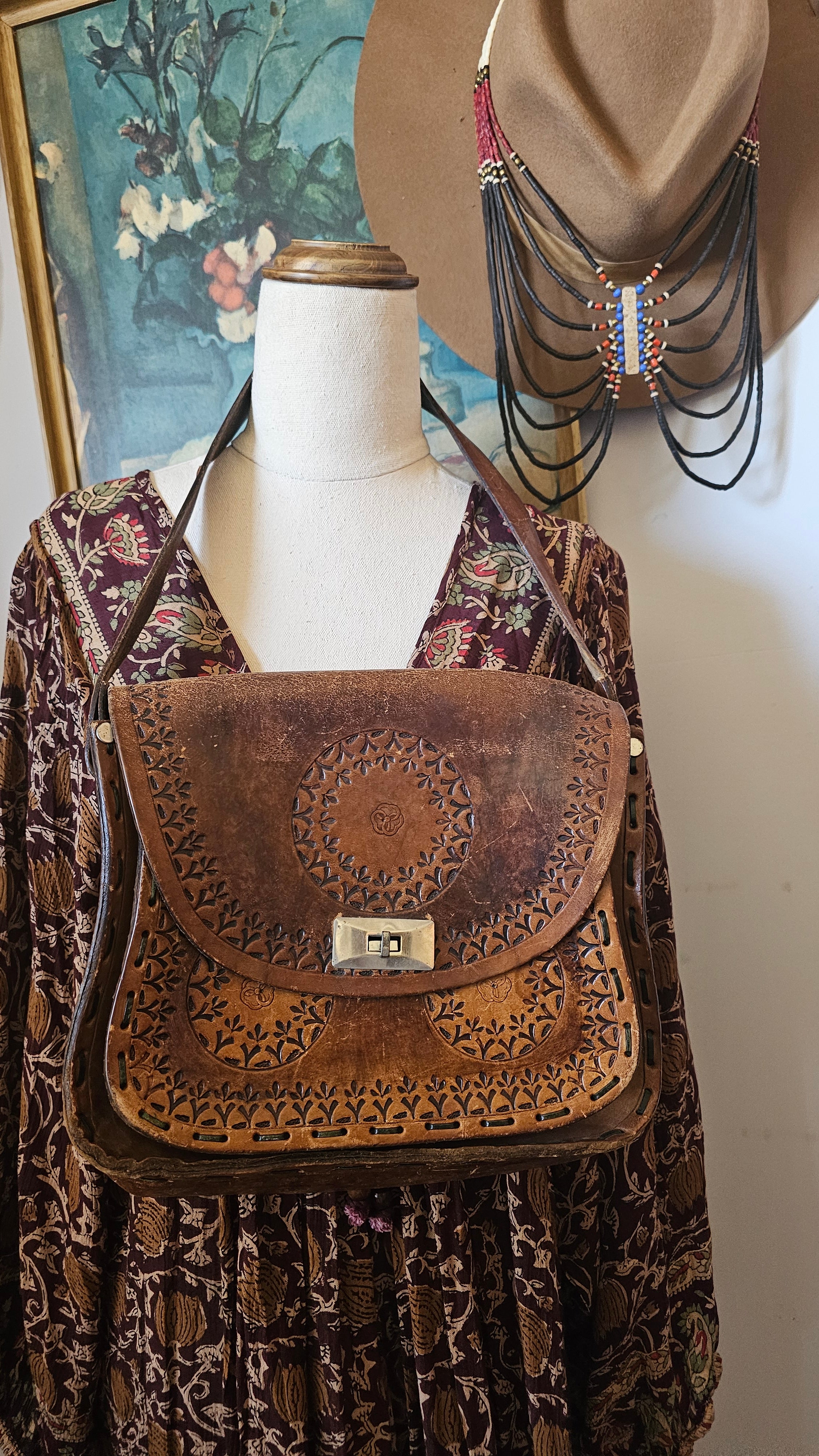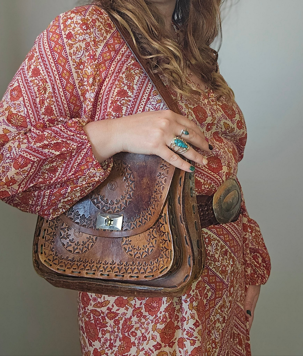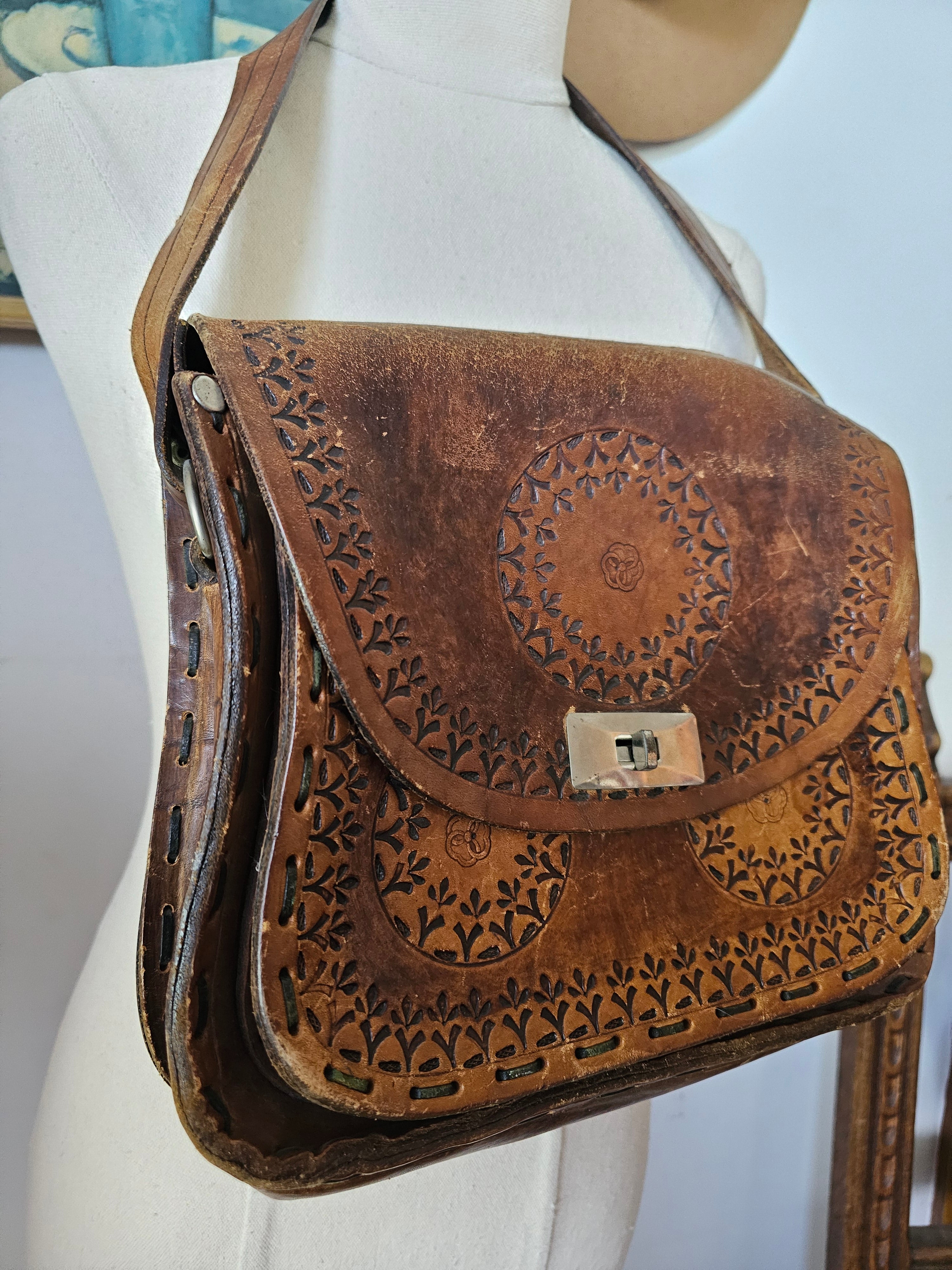 A true boho treasure – this vintage hand-tooled leather bag features an intricate circular floral design front and back, with detailed cut-outs and natural patina that only comes with time. The structured shape and sturdy leather give it that authentic 70s feel, while the front flap secures with a metal clasp for practicality.