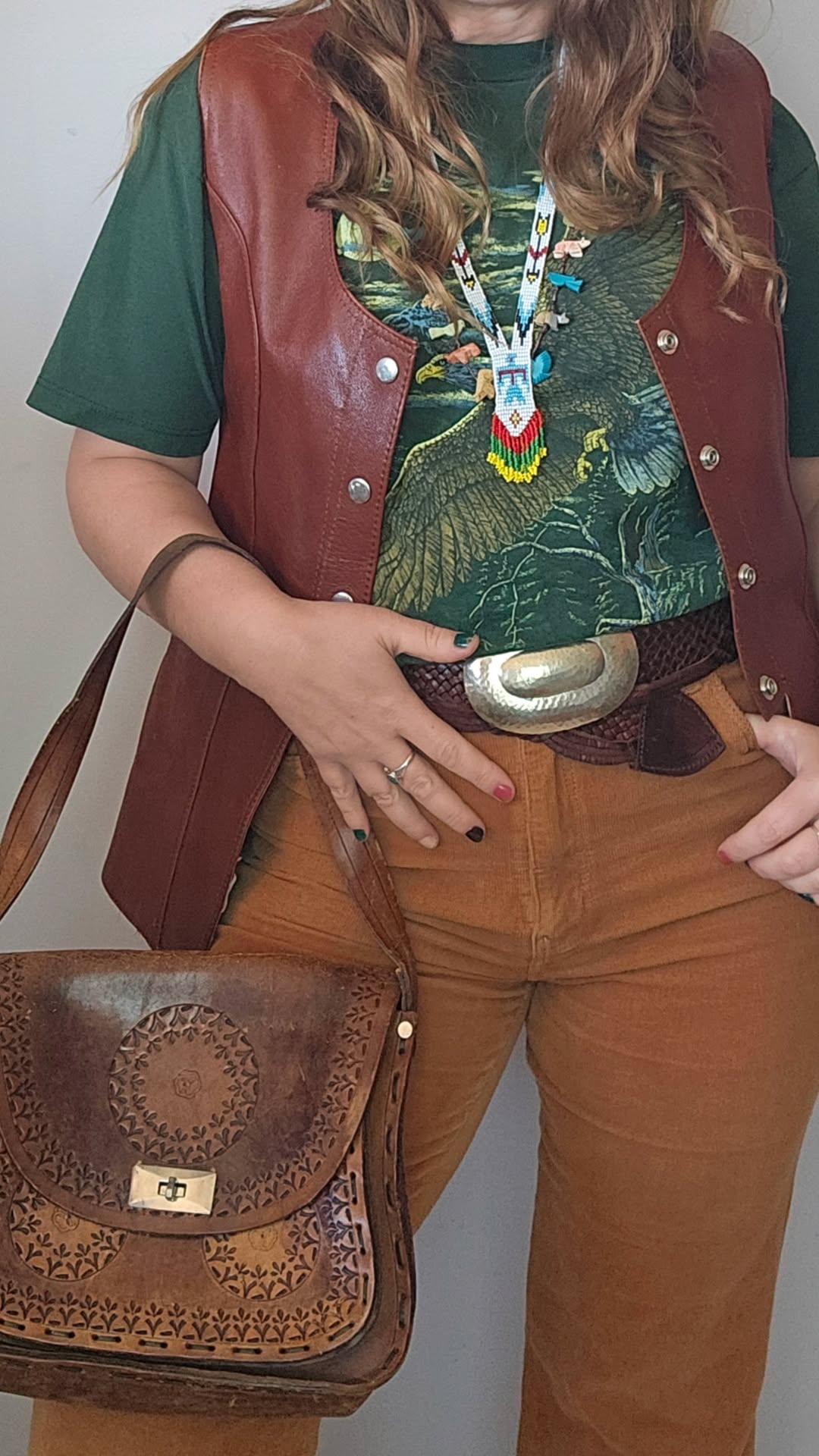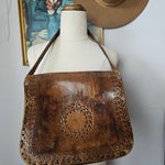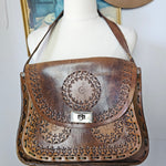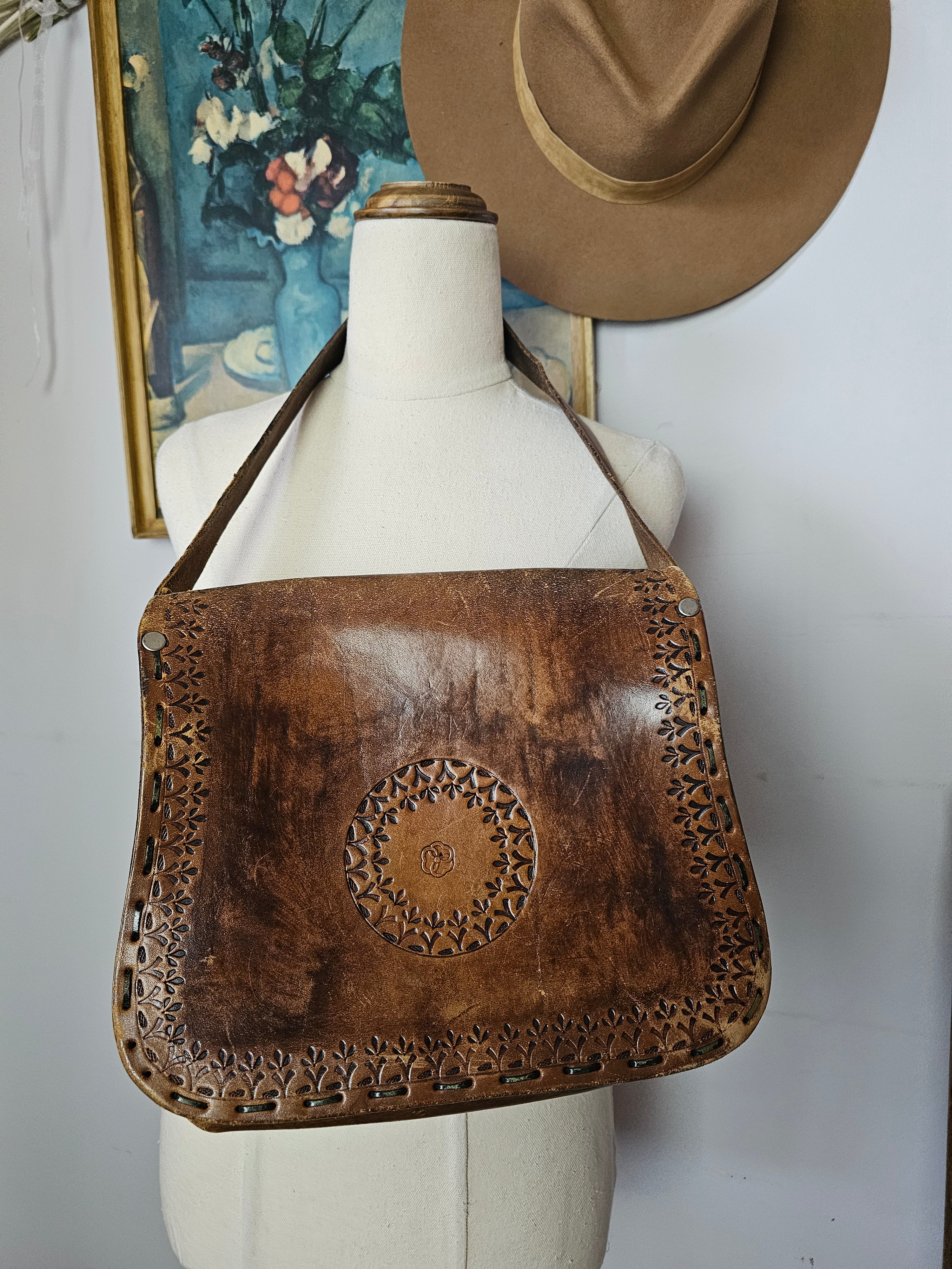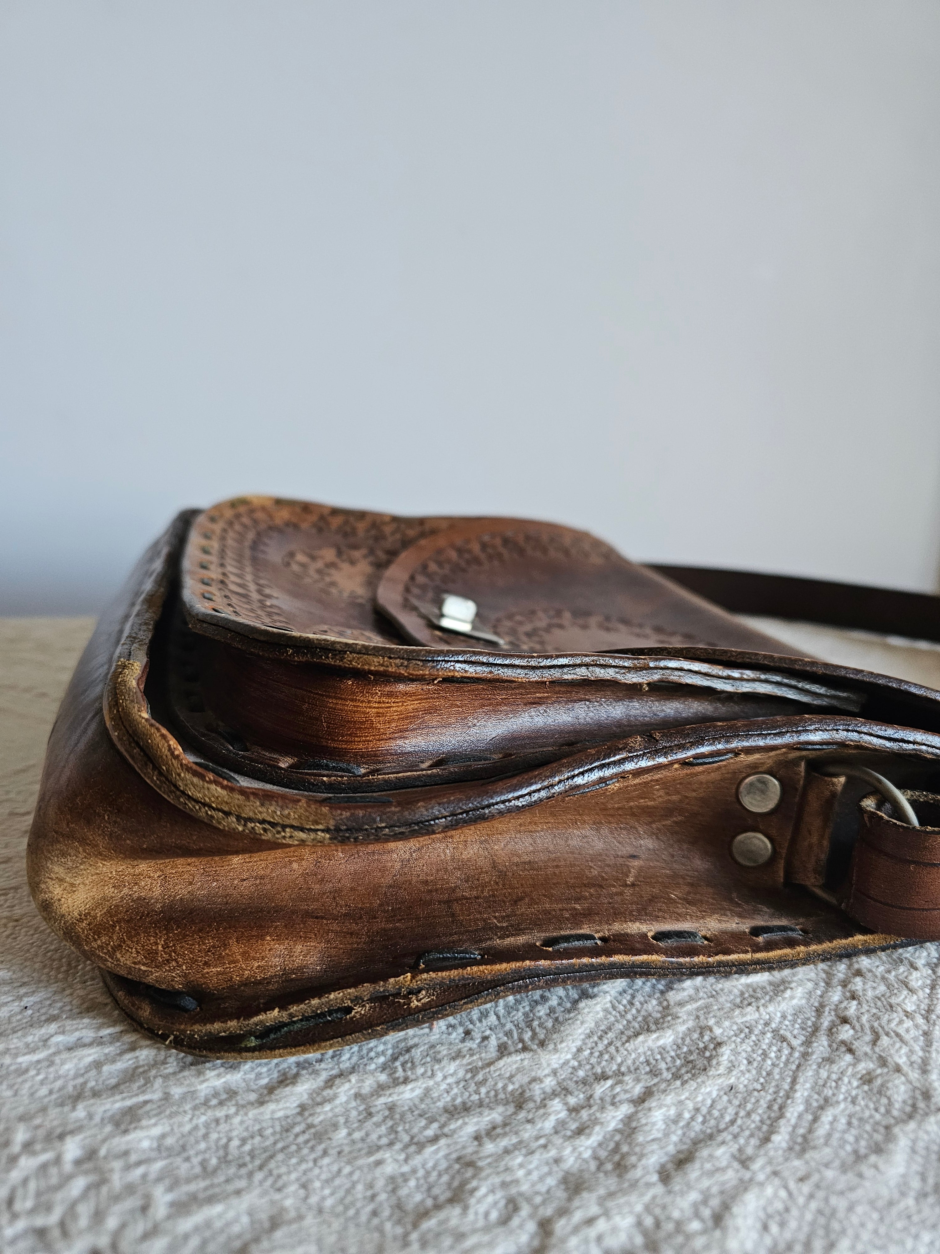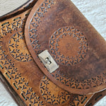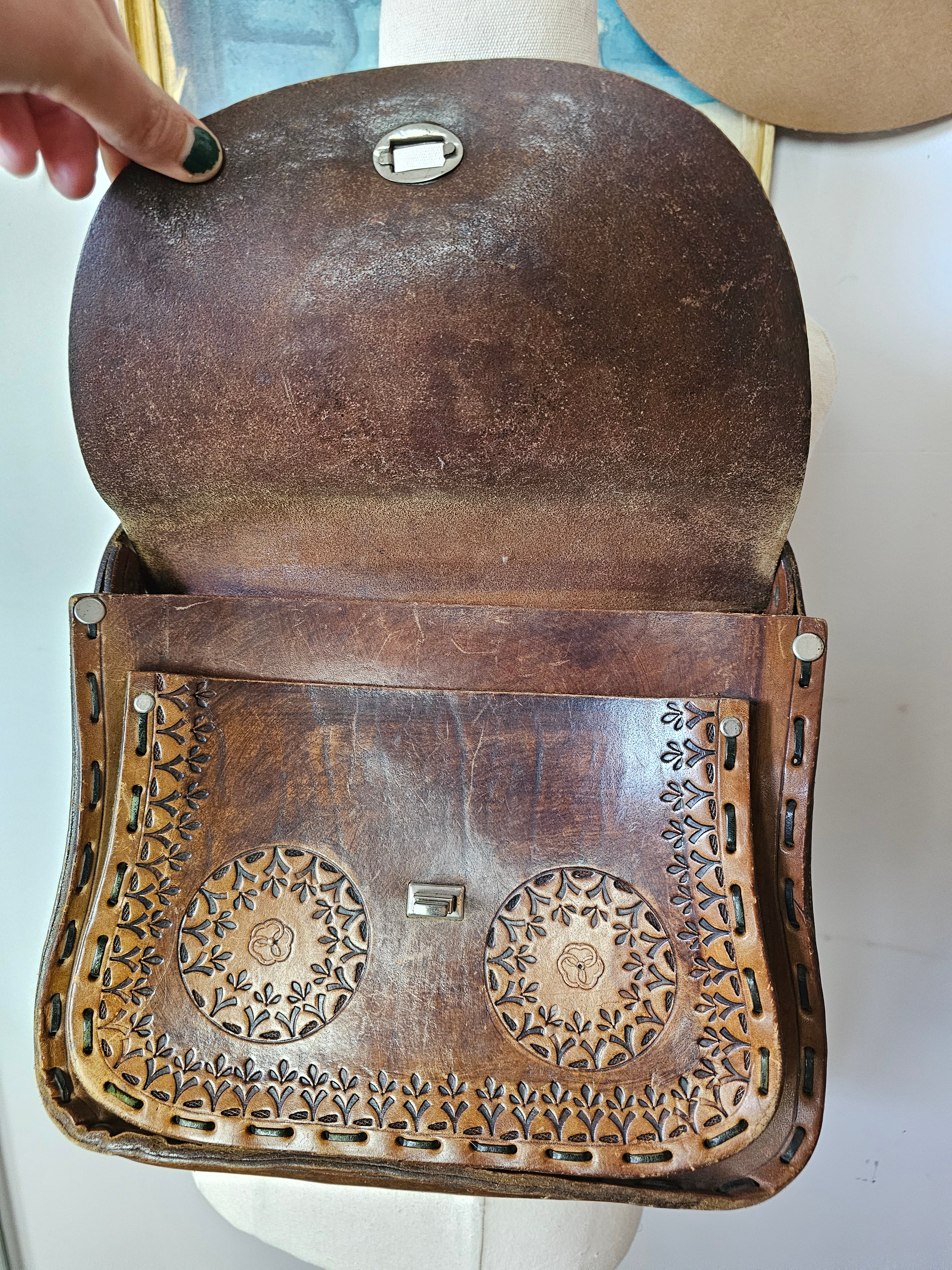 A true boho treasure – this vintage hand-tooled leather bag features an intricate circular floral design front and back, with detailed cut-outs and natural patina that only comes with time. The structured shape and sturdy leather give it that authentic 70s feel, while the front flap secures with a metal clasp for practicality.