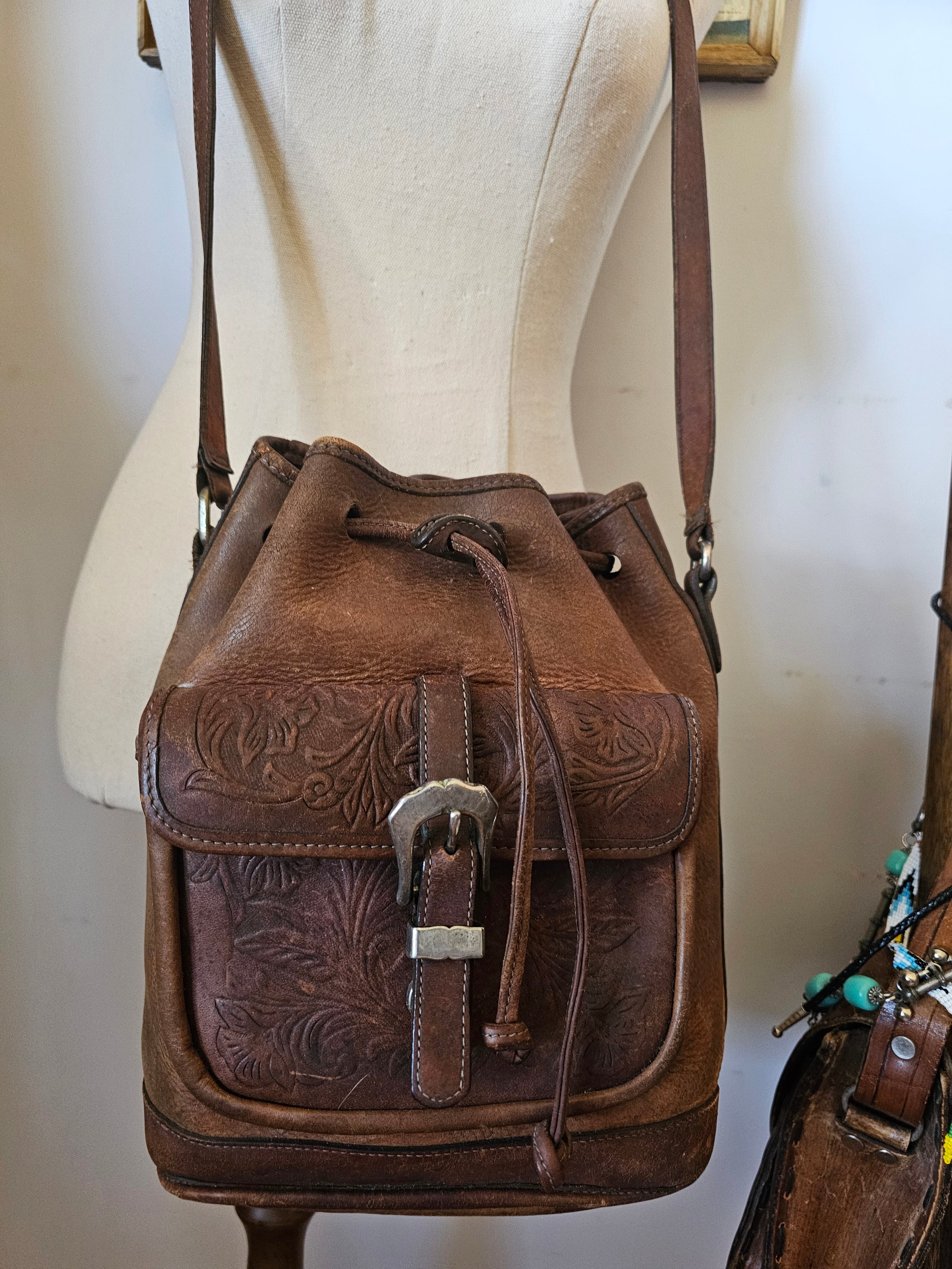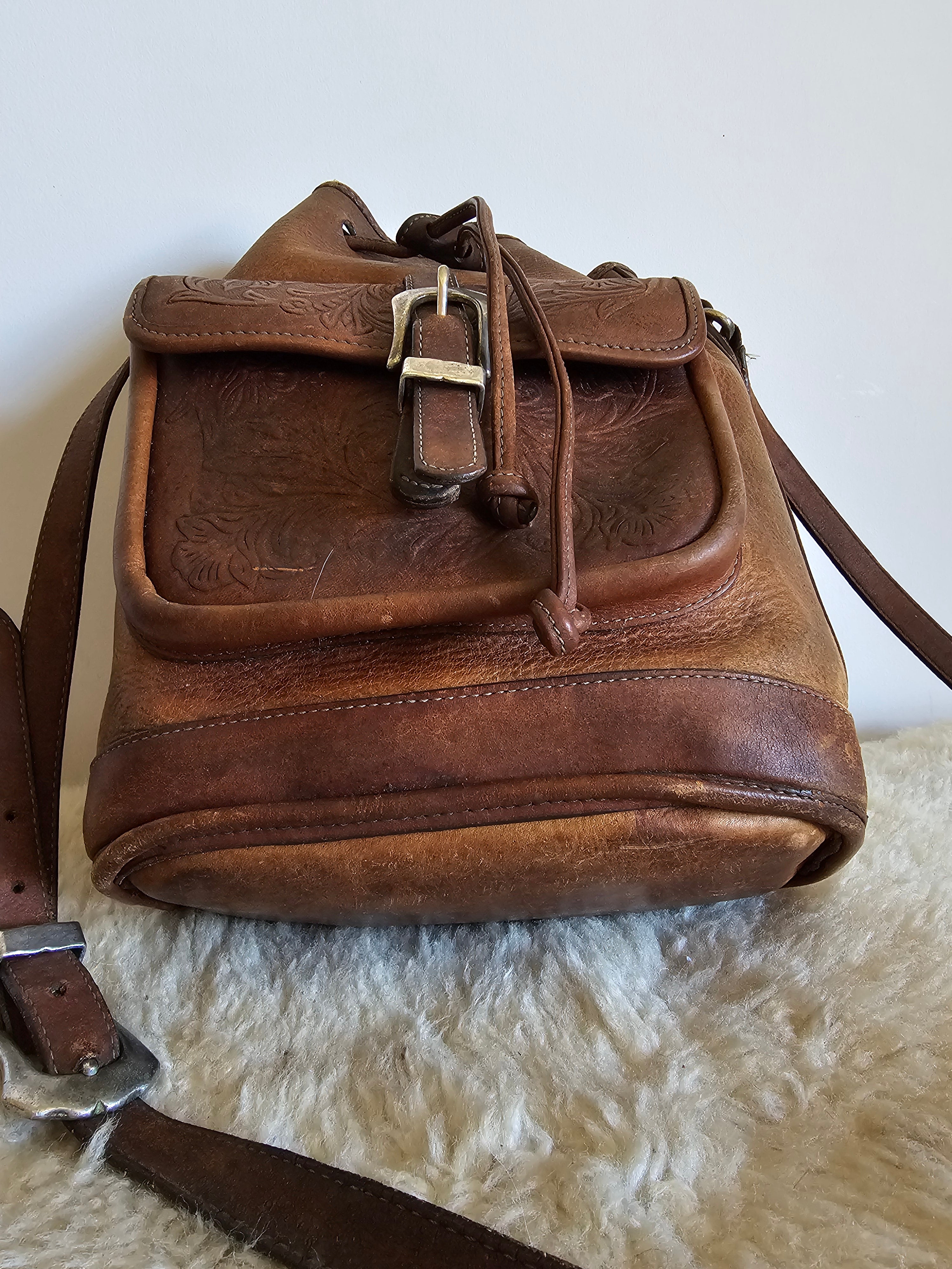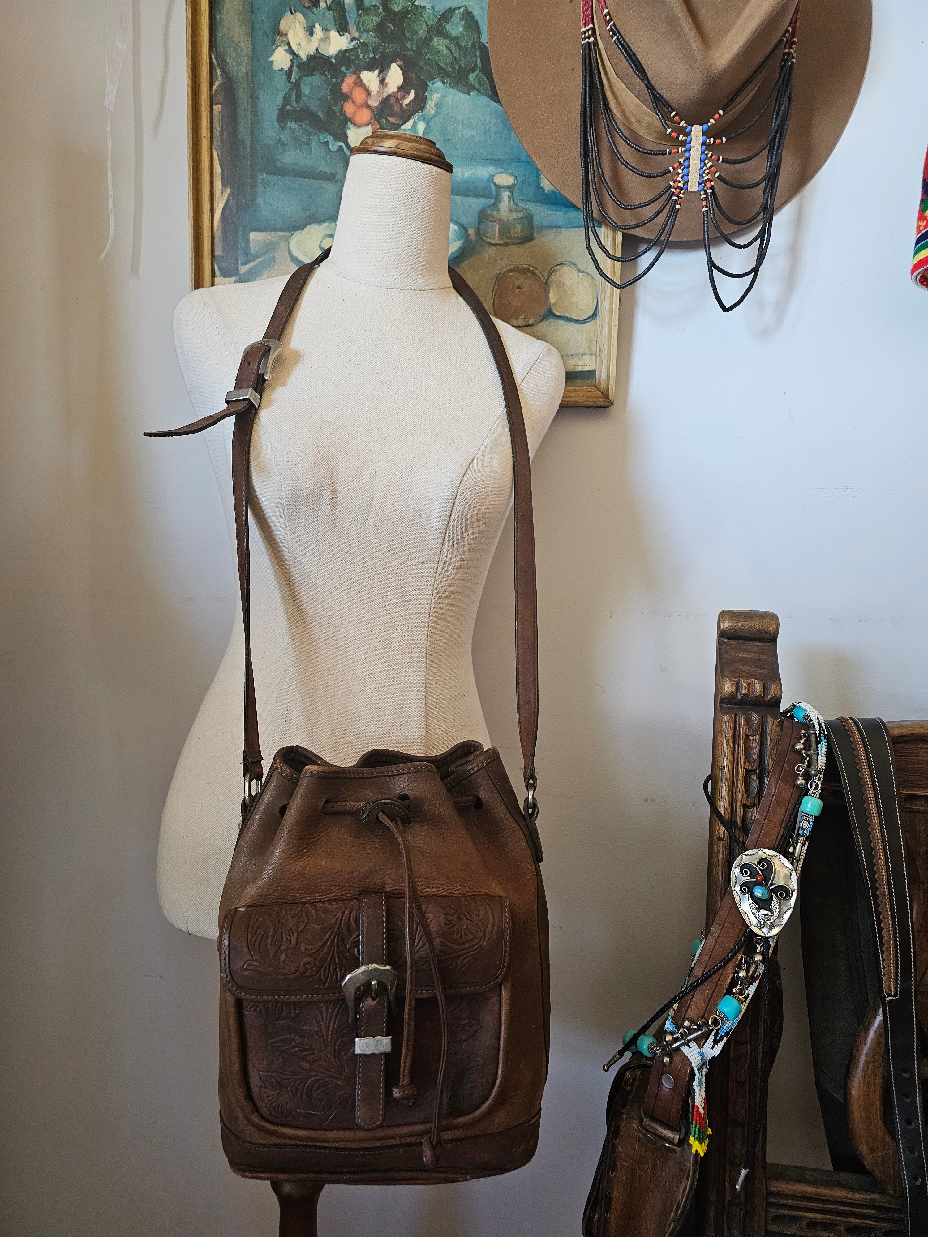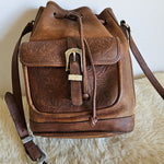 A stunning boho 70s-inspired find – this genuine leather bucket-style bag features beautiful tooled floral detailing and a sturdy western buckle closure.