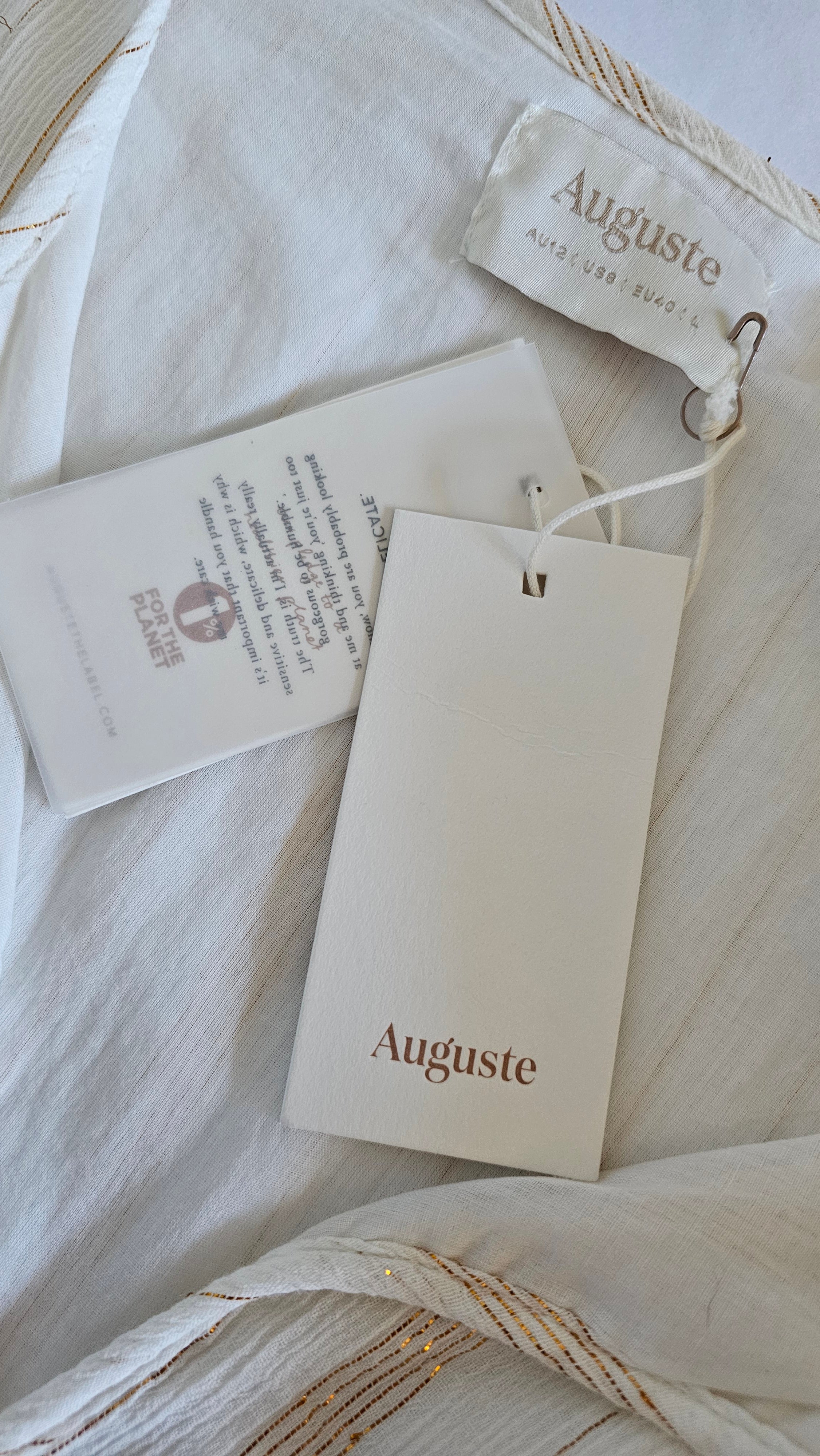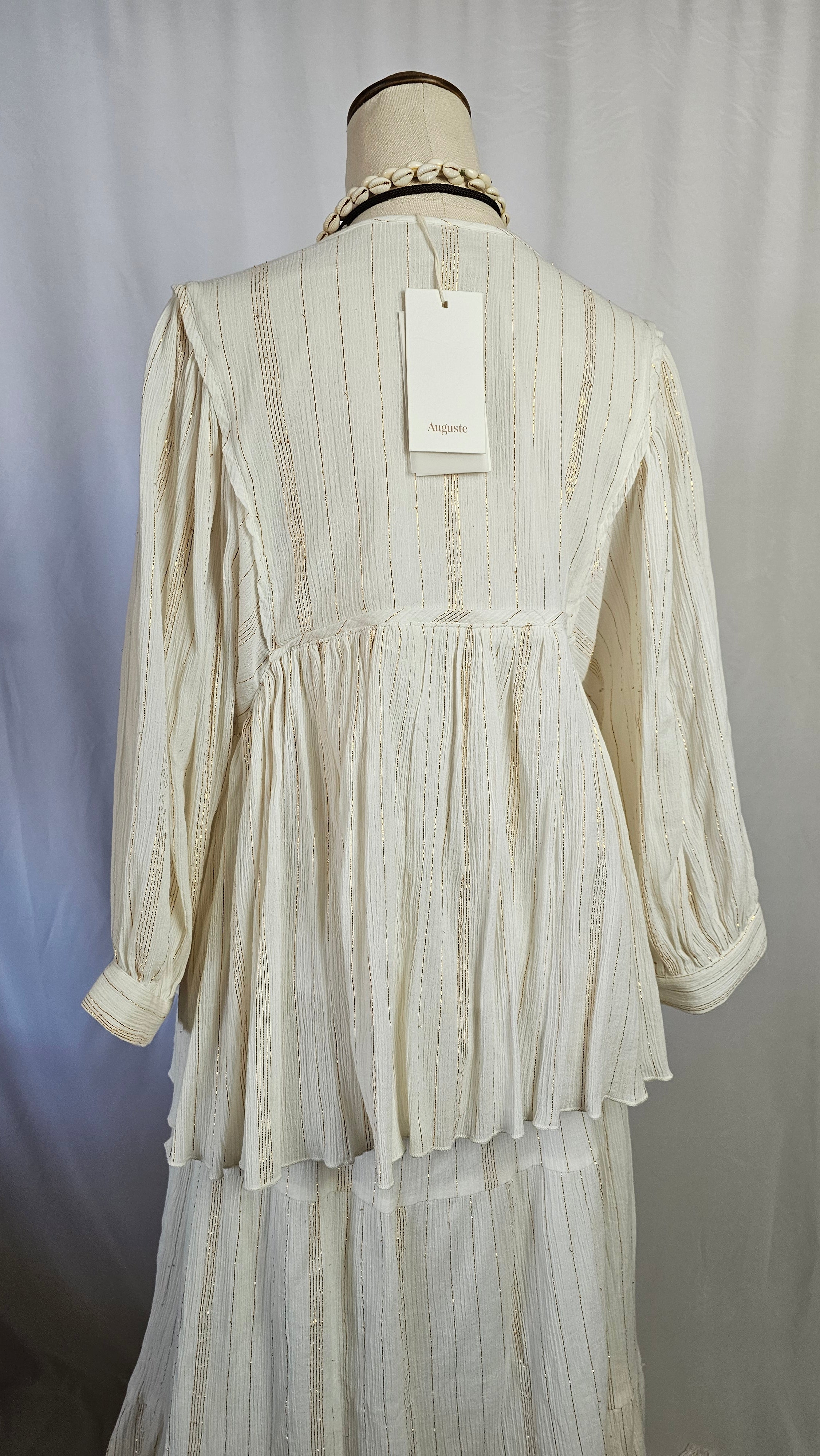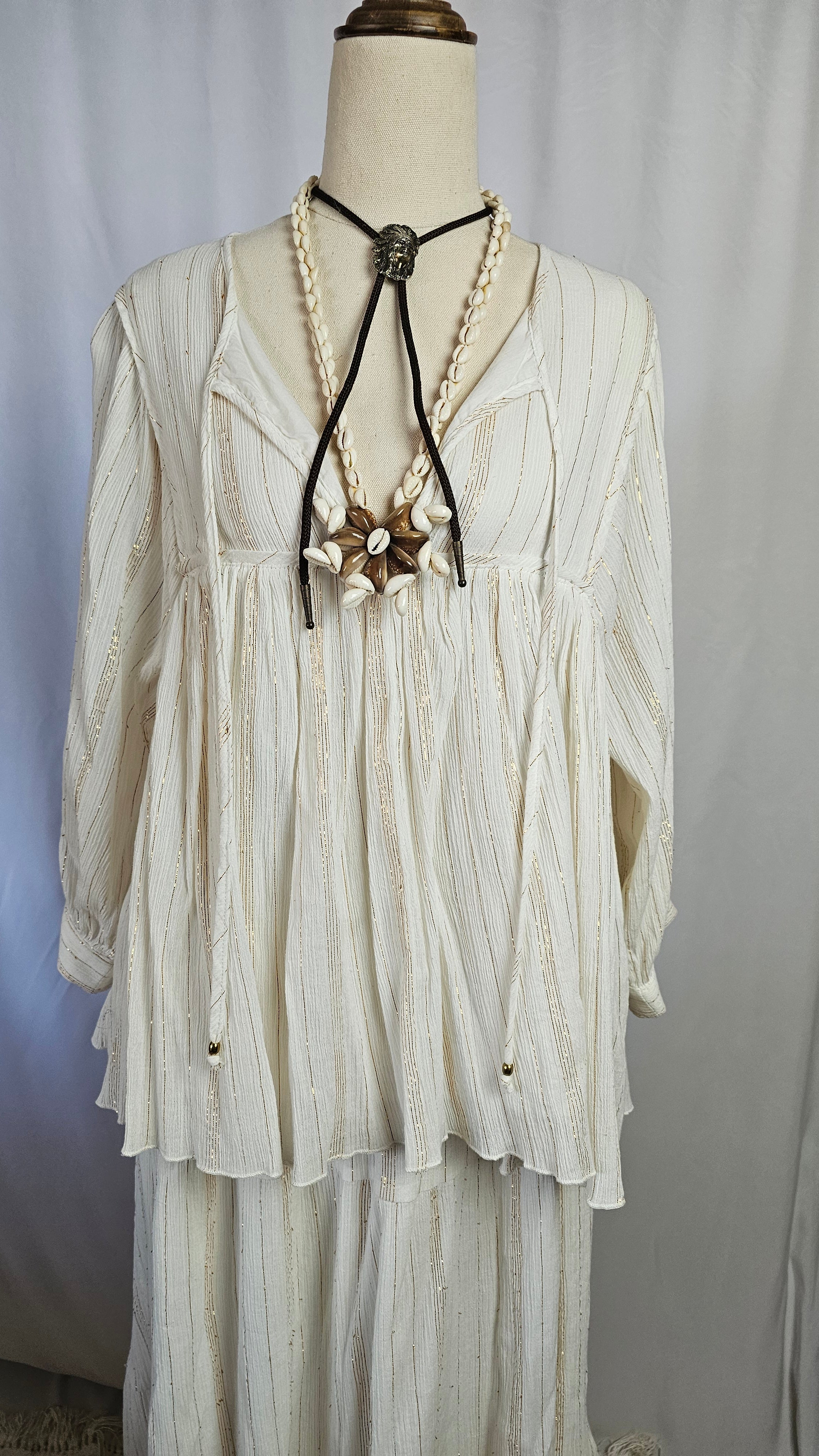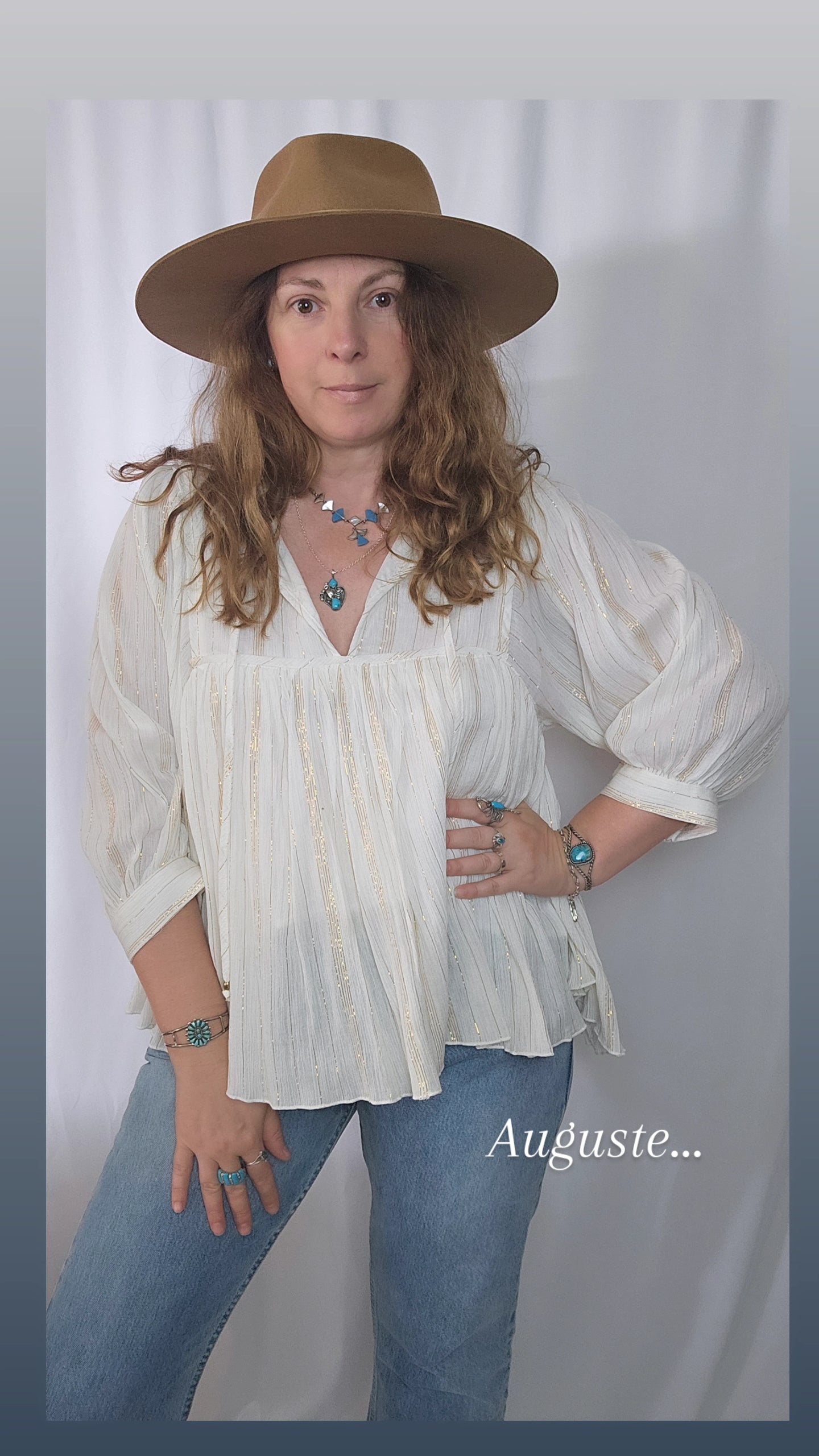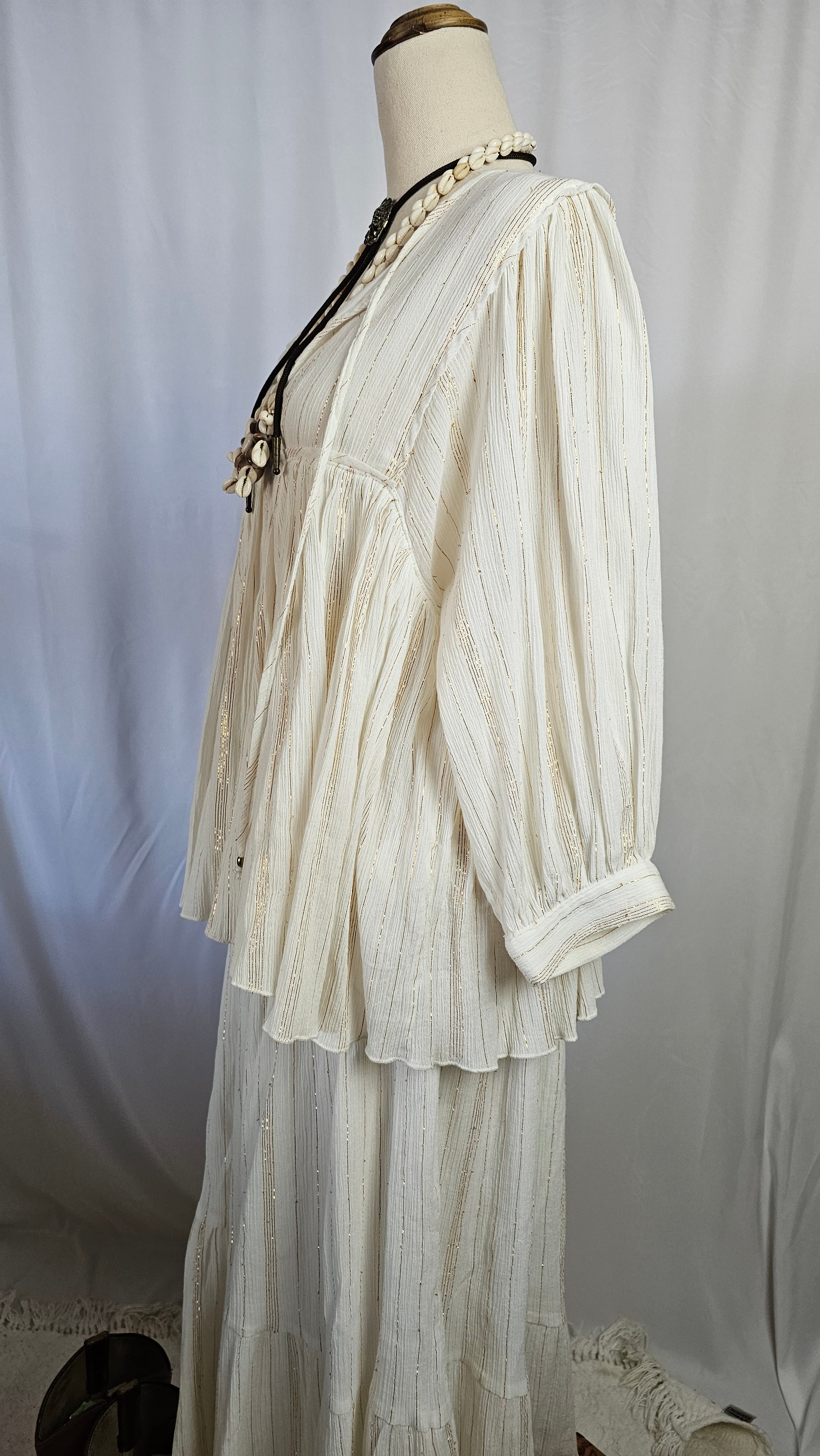 Add a touch of effortless elegance to your wardrobe with this beautiful Auguste Liesel blouse. Designed in a soft ivory tone with shimmering gold thread accents, this blouse is perfect for a bohemian-chic look. Features include: