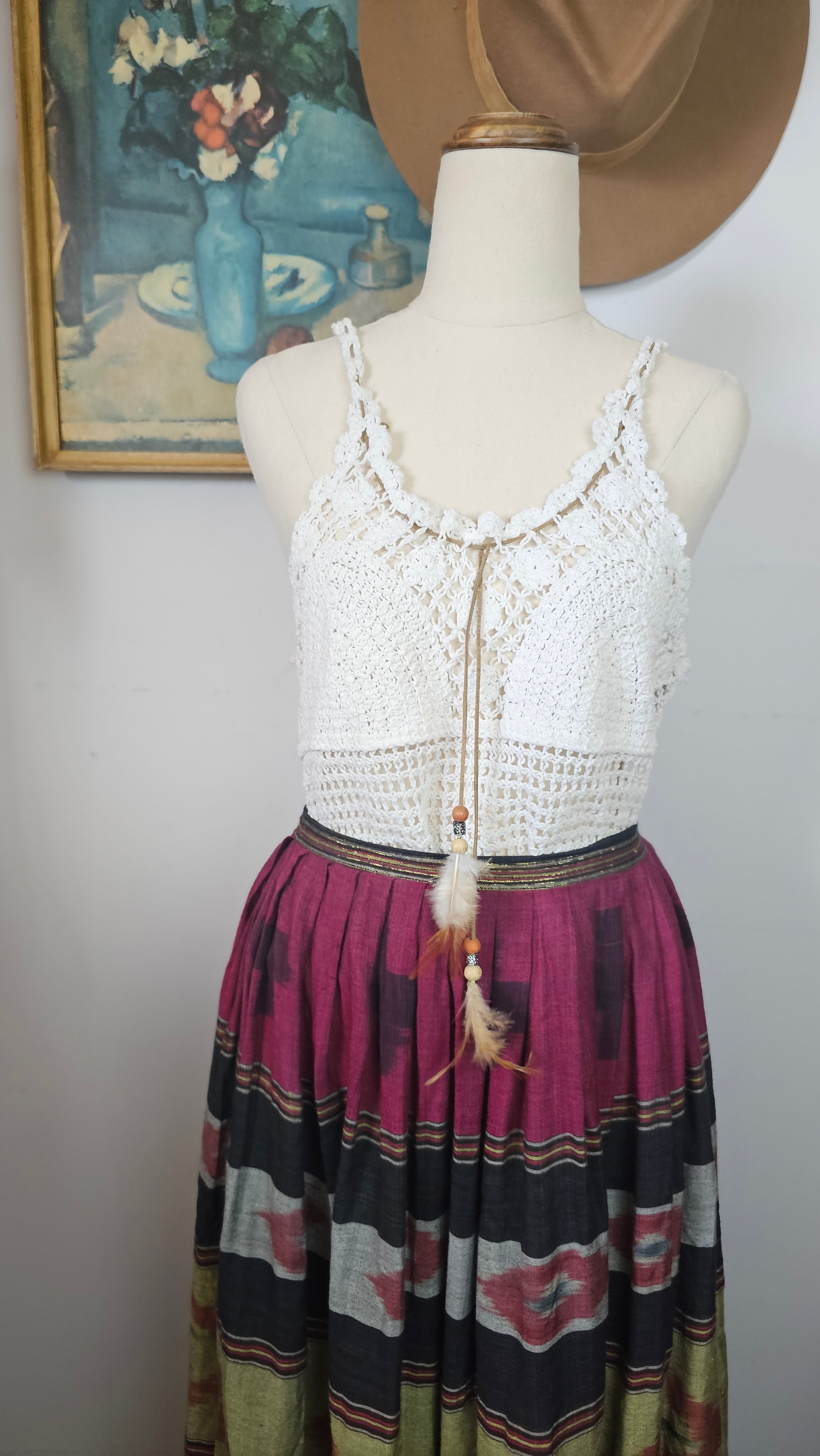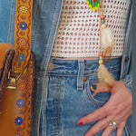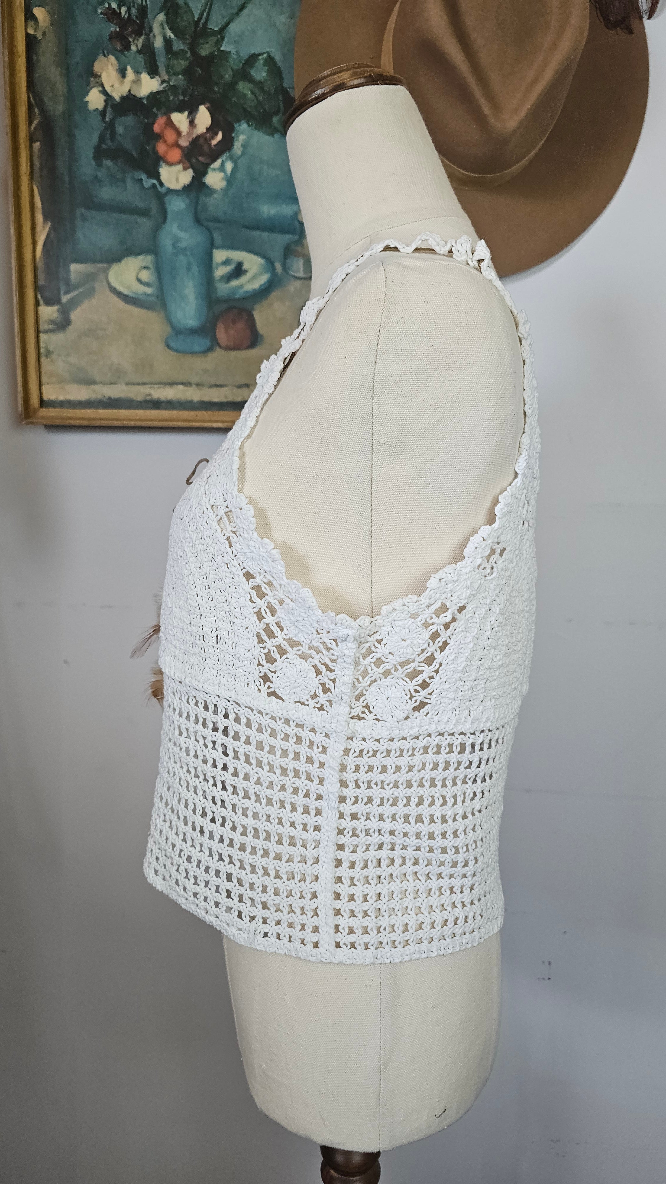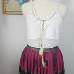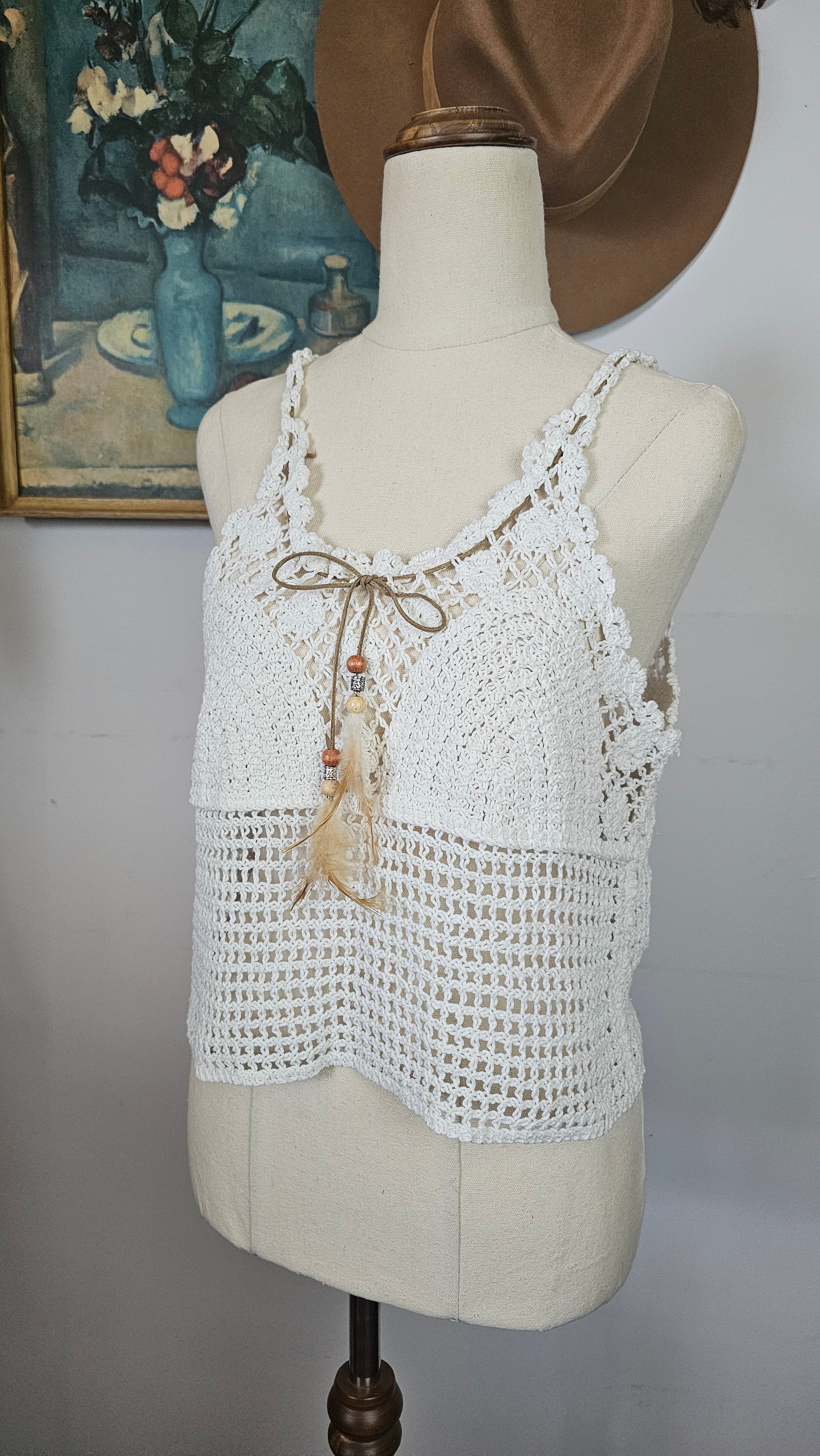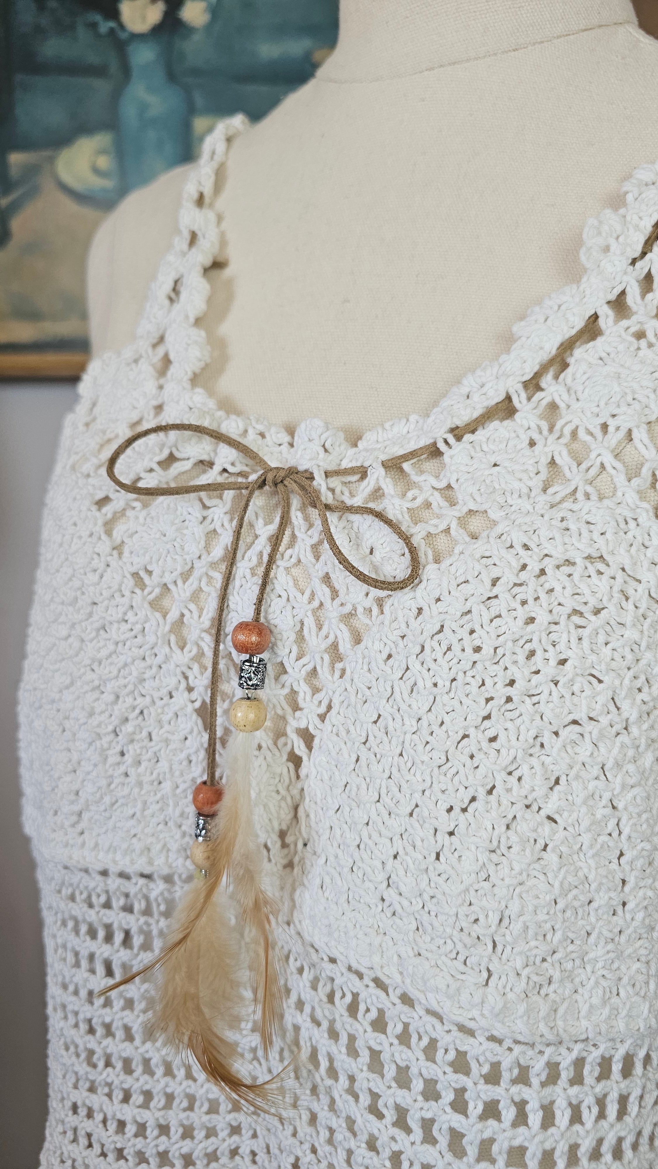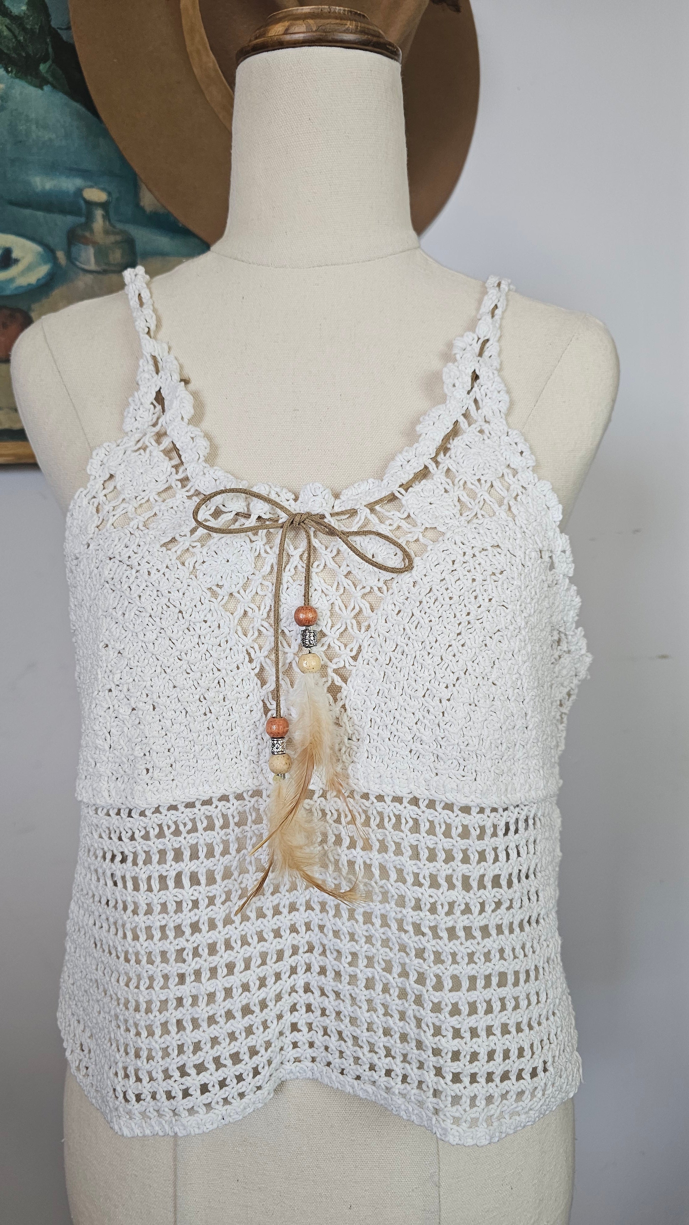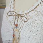 Gorgeous vintage-inspired crochet cami in soft white tones — perfect for layering through the seasons. Features intricate open-knit detailing with a scalloped neckline, lace-up tie front with wooden beads and feathers and a flattering racer-style back.