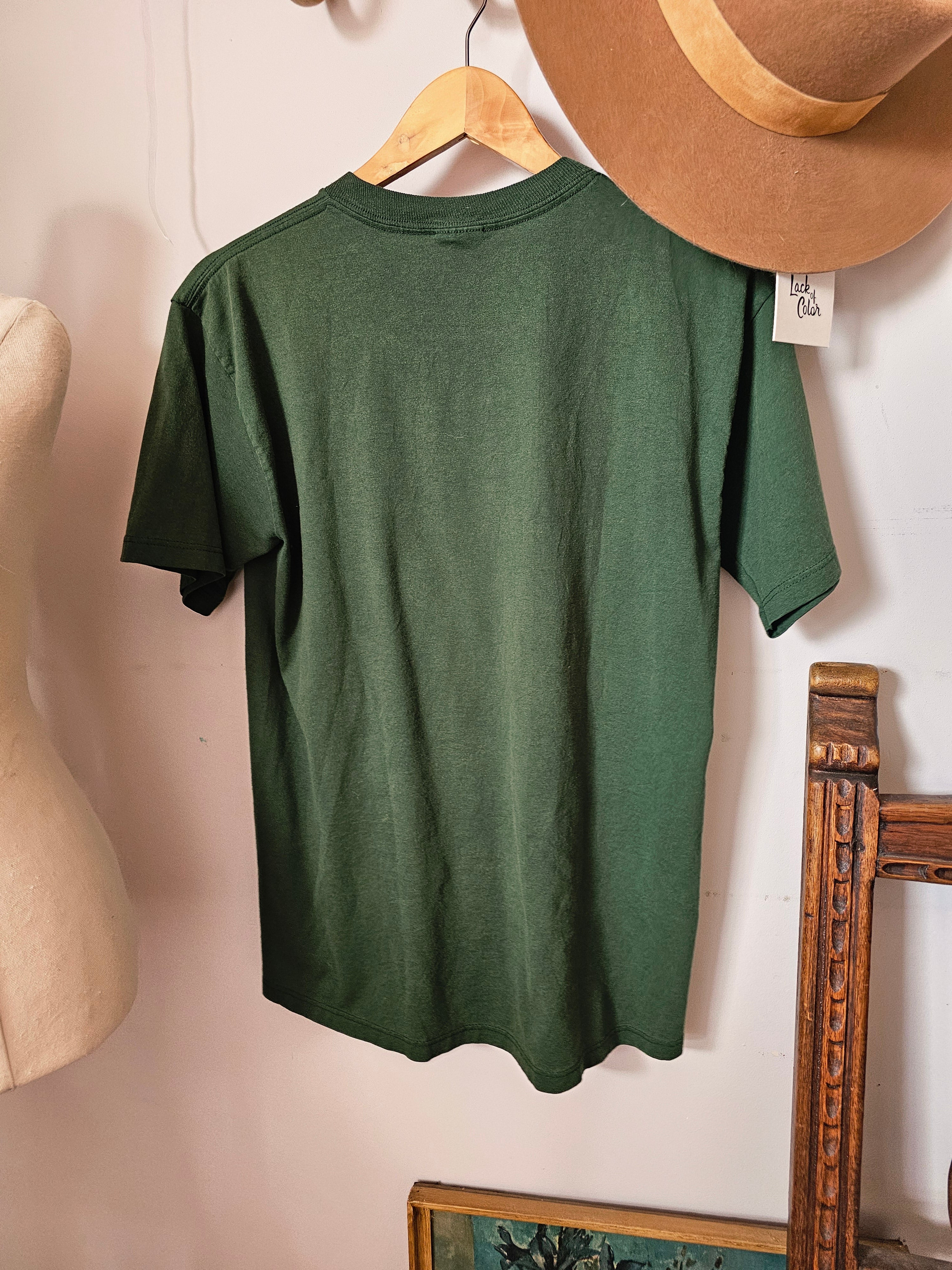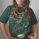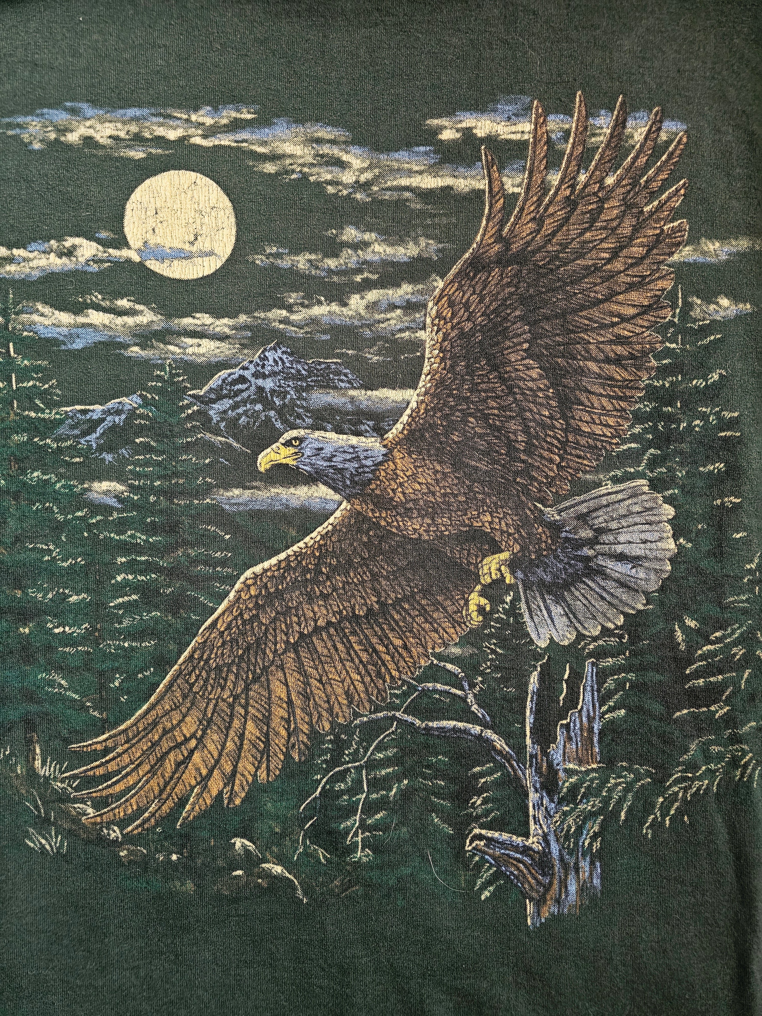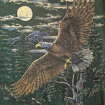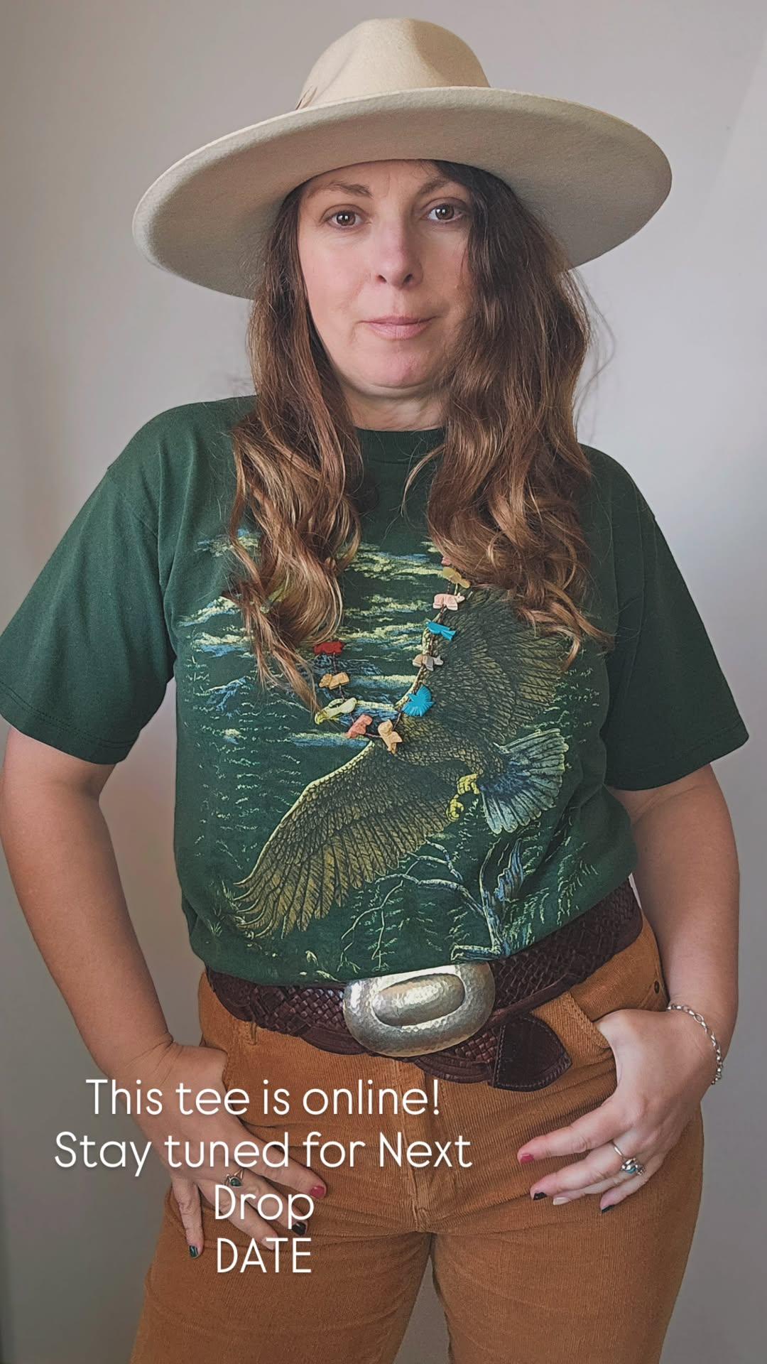 A soaring symbol of strength and freedom – this 70s-inspired deep green tee captures an eagle mid-flight under the moonlight. Bold, earthy and wild at heart, it’s the kind of piece that feels just as good worn loose with vintage denim as it does tucked into cords with a statement belt. A timeless retro tee with a true rock-n-roll soul.