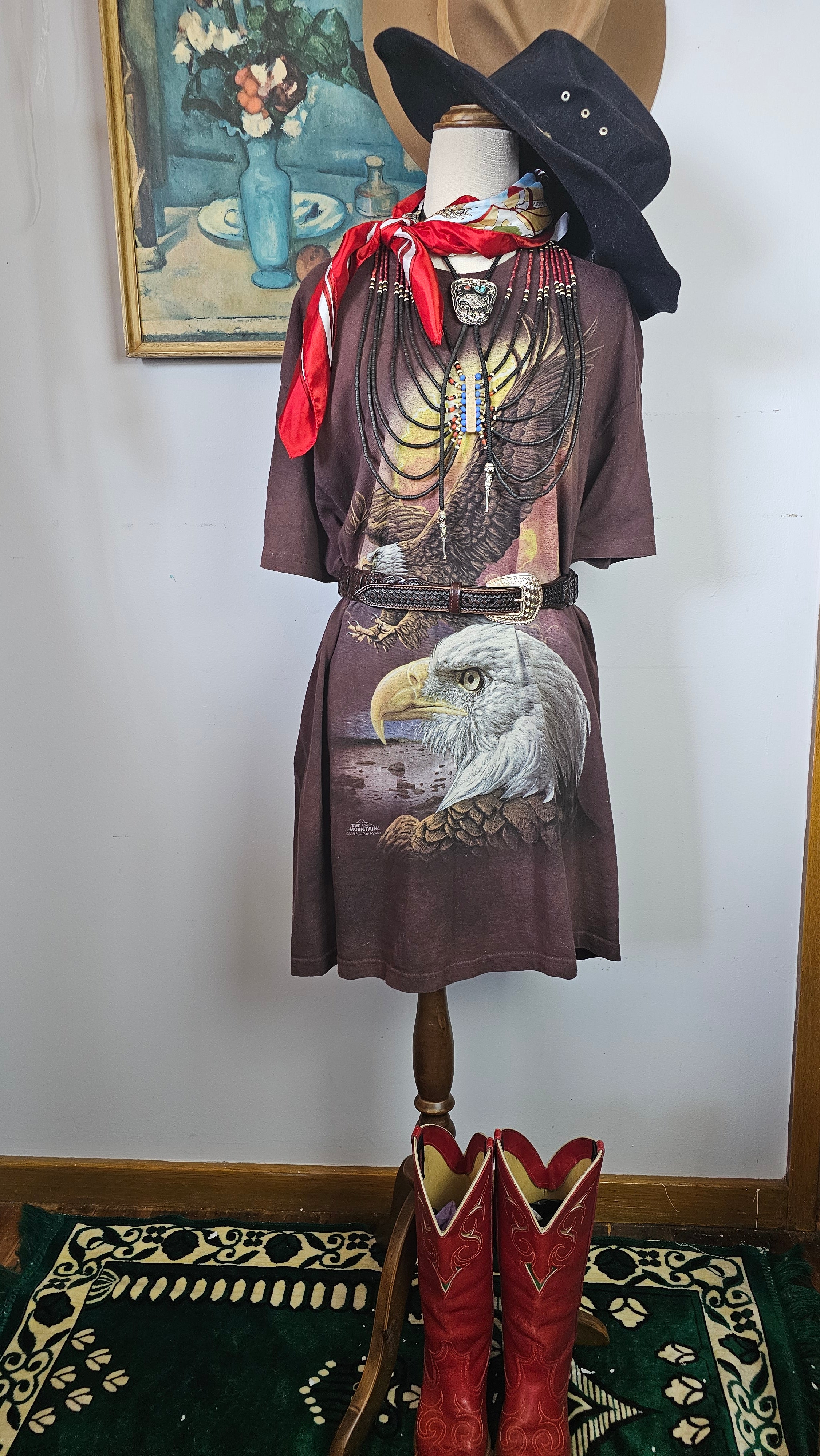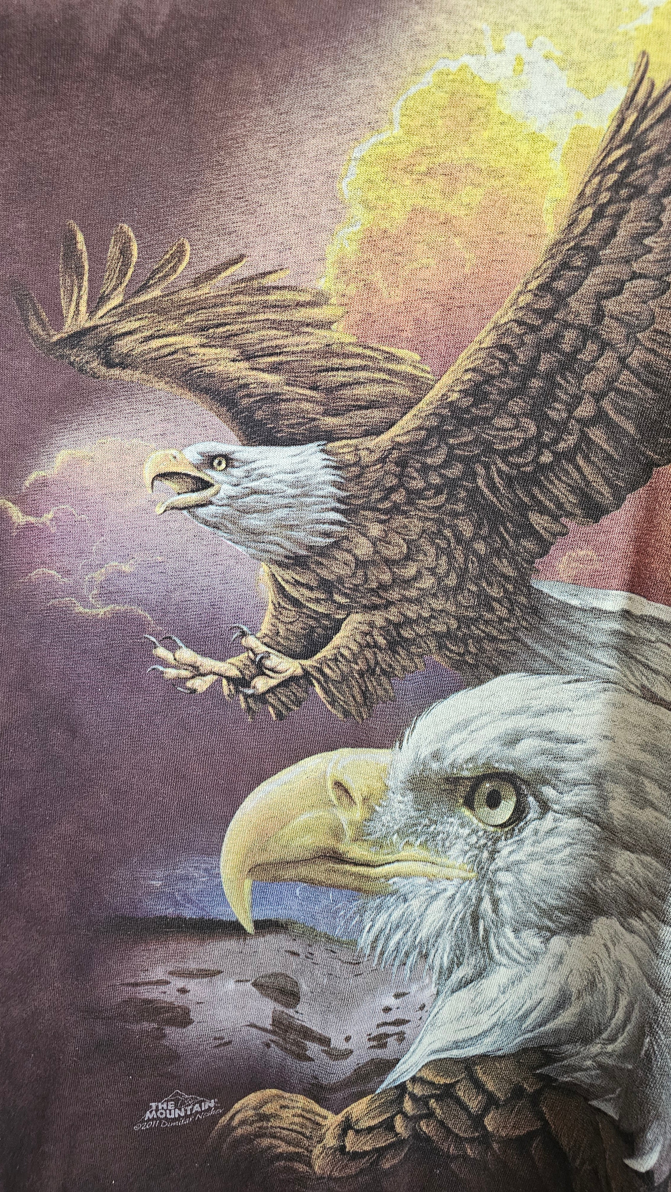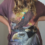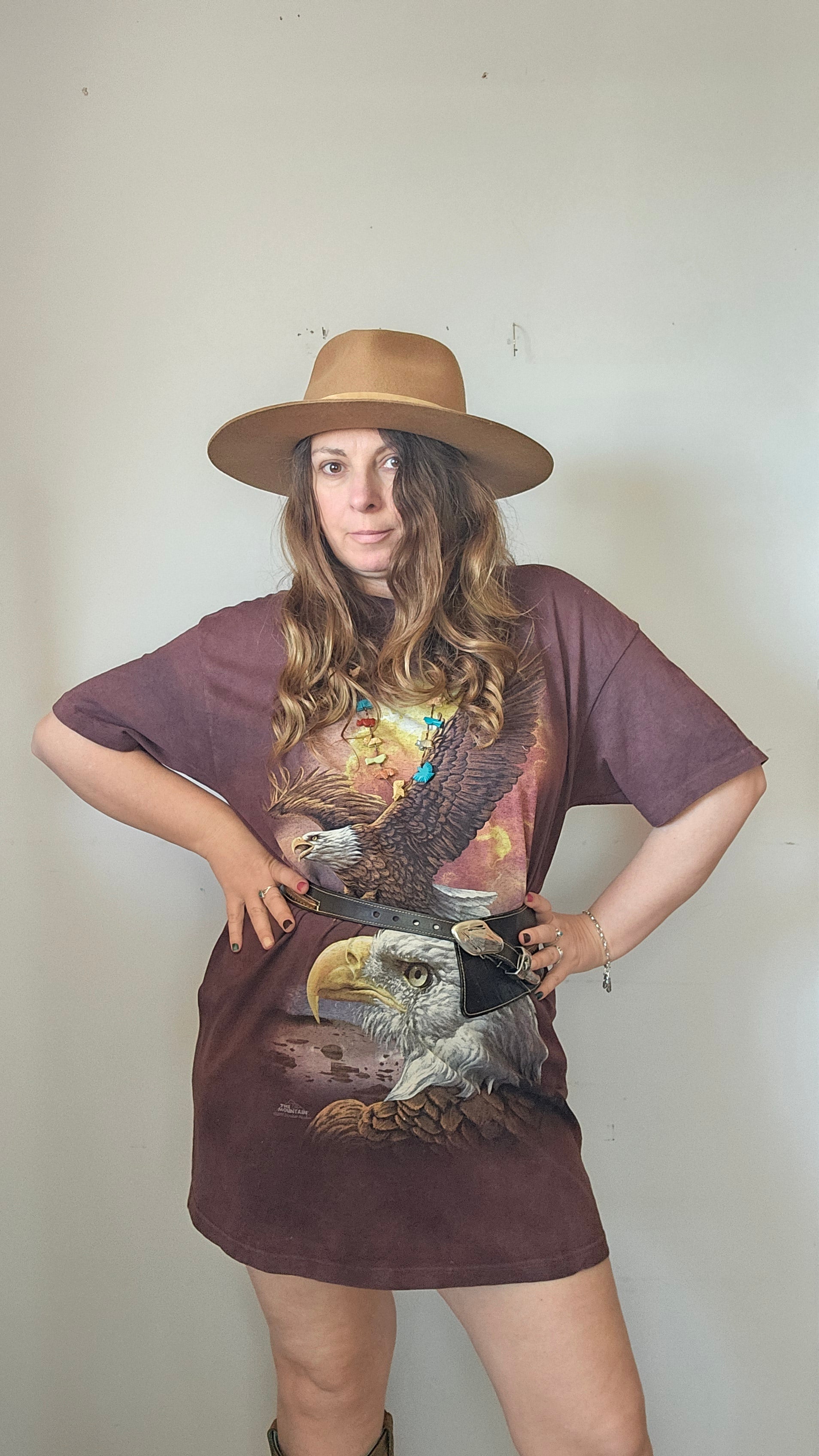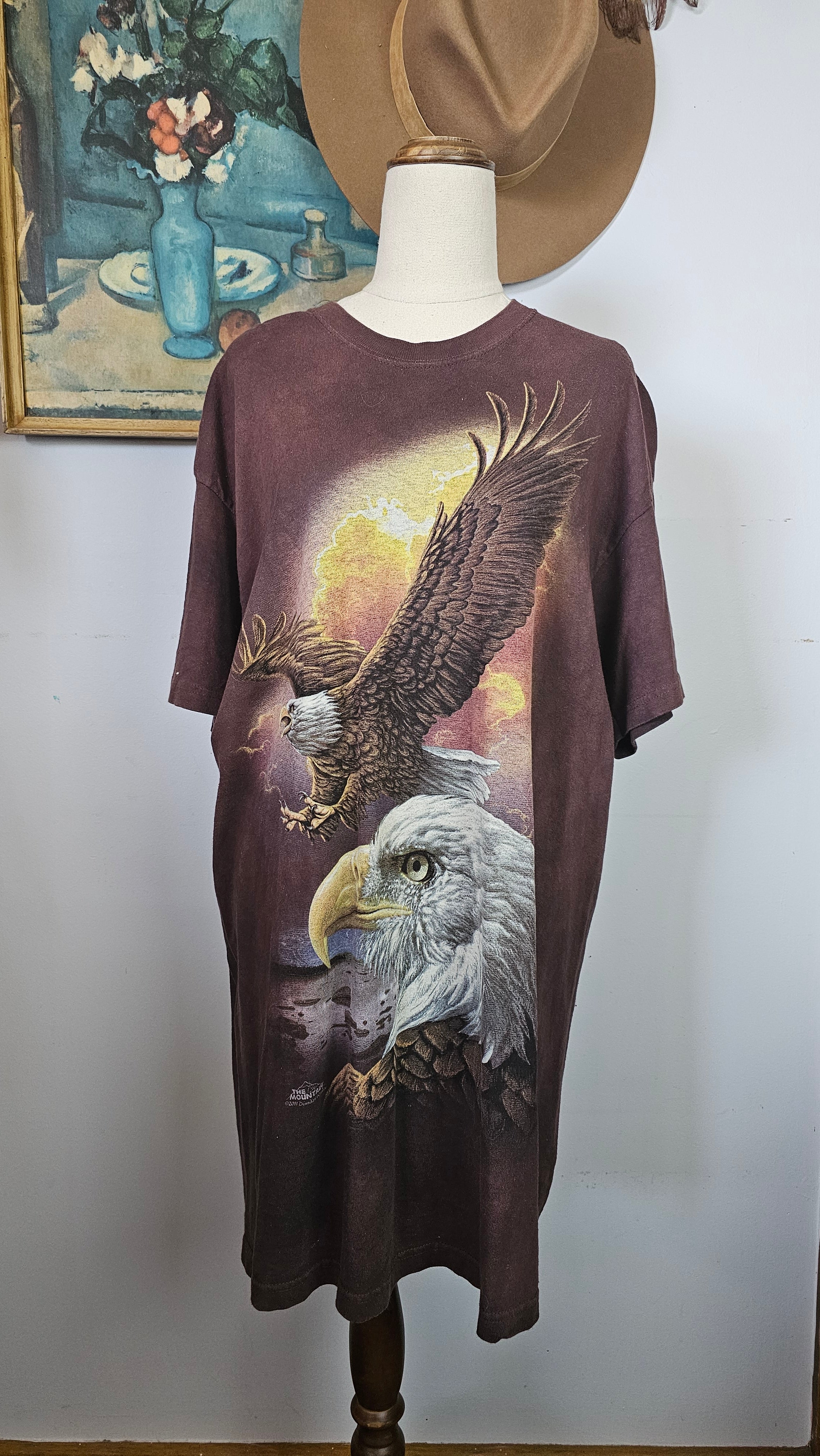 Epic oversized vintage eagle tee with that true 90s Americana vibe. Soft and worn-in with a bold front graphic featuring a soaring bald eagle across a dusky mountain sky — the kind of print you just don’t see anymore.