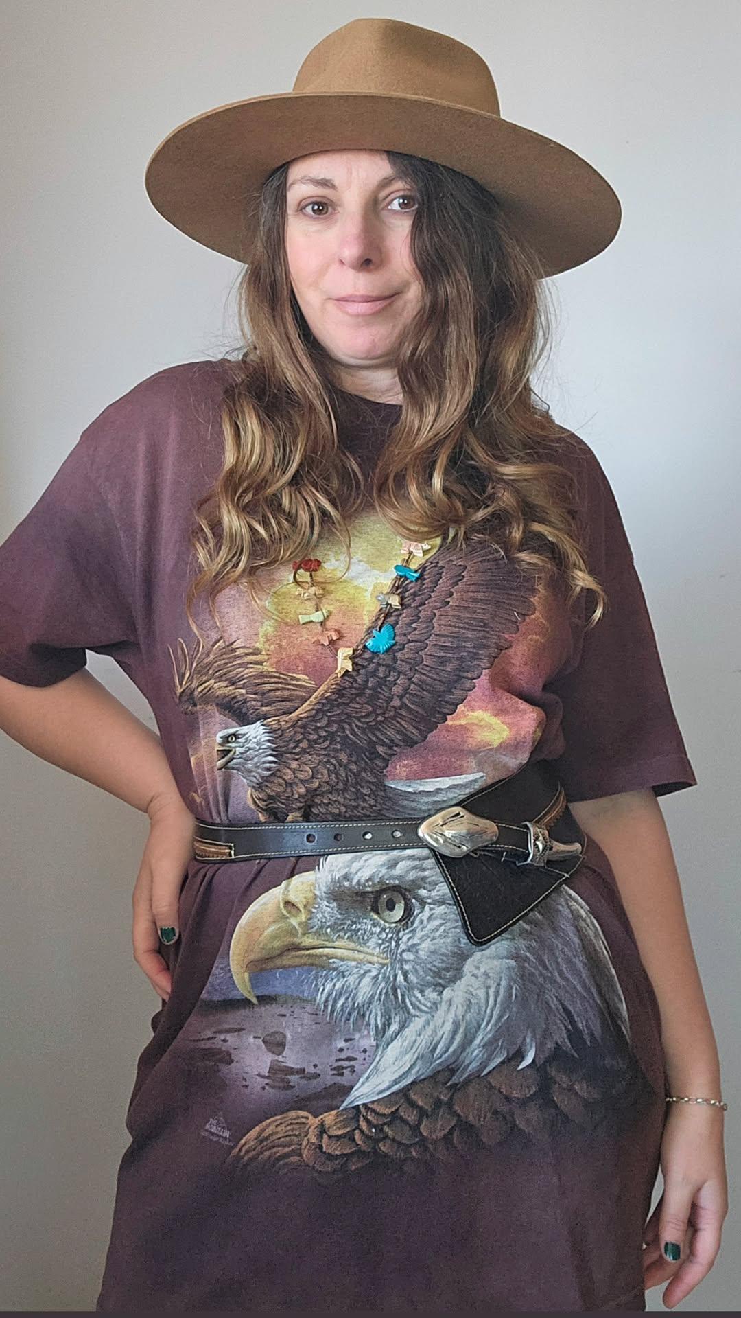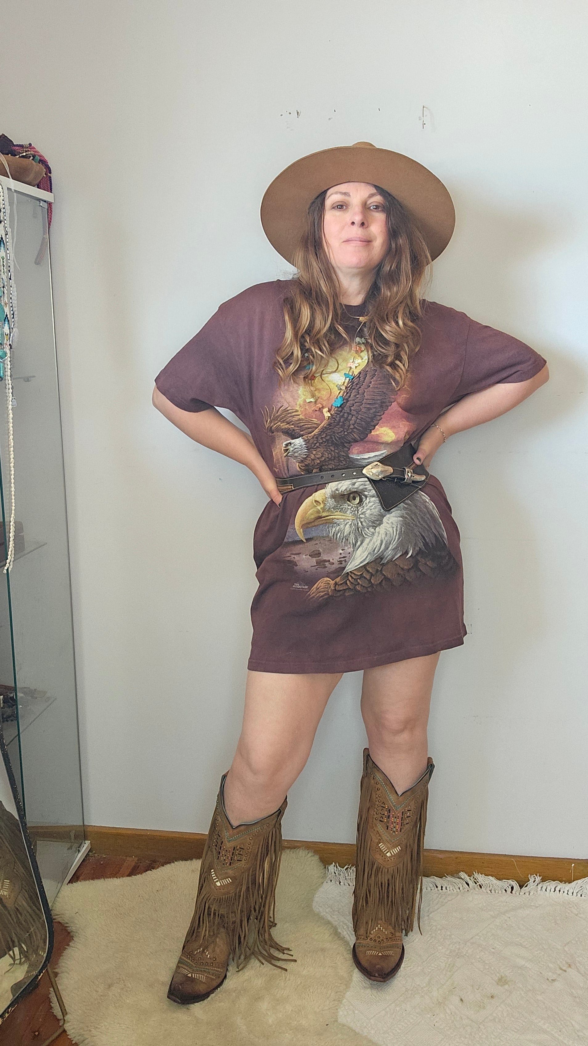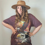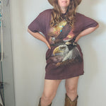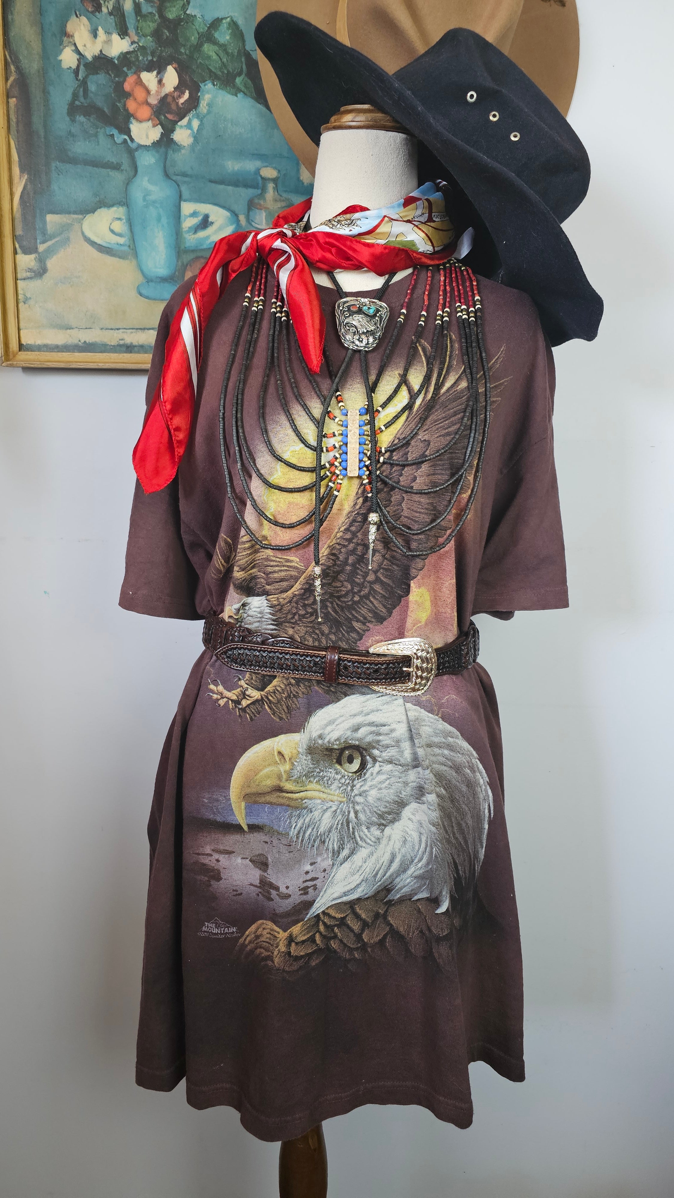 Epic oversized vintage eagle tee with that true 90s Americana vibe. Soft and worn-in with a bold front graphic featuring a soaring bald eagle across a dusky mountain sky — the kind of print you just don’t see anymore.