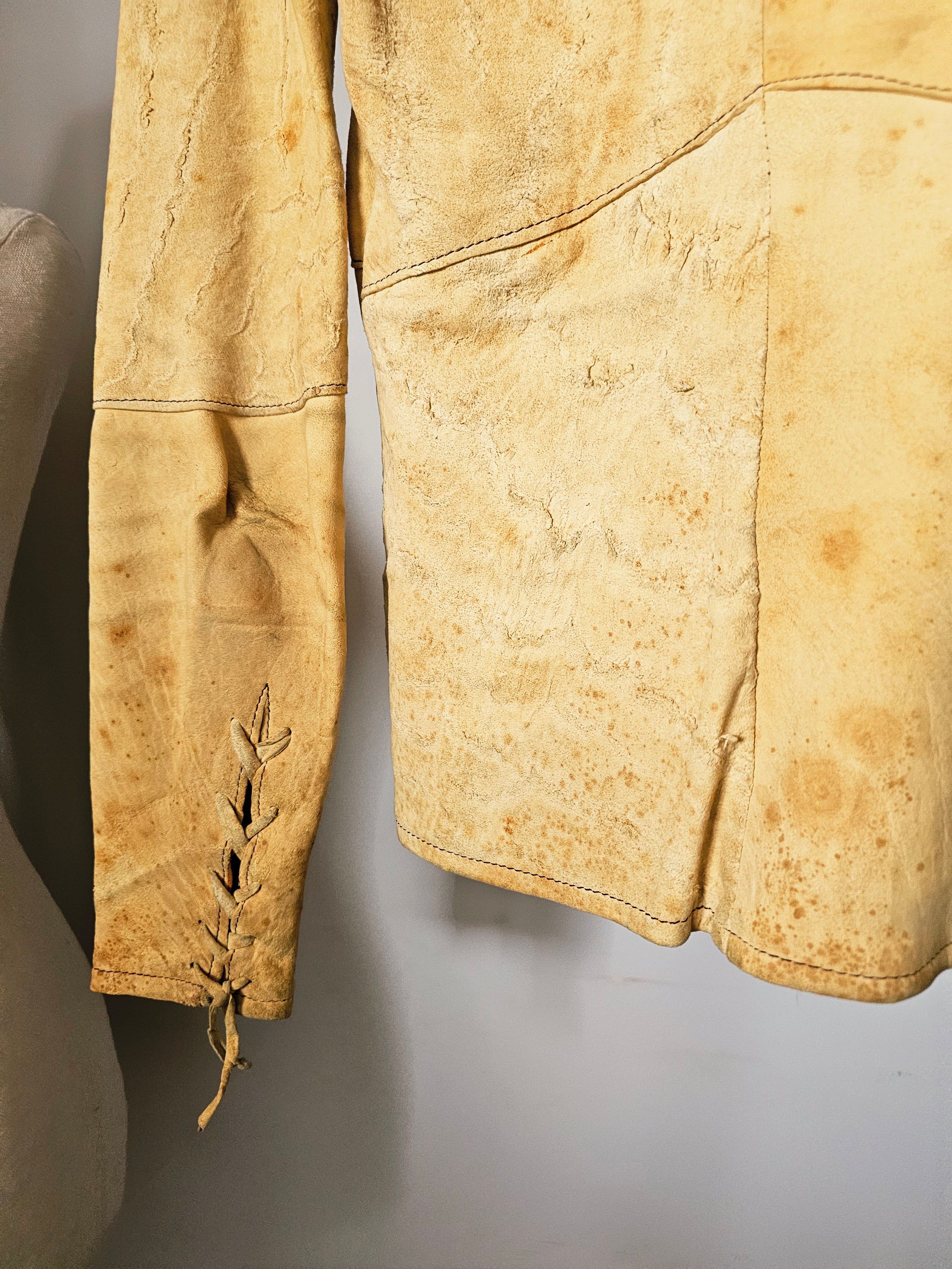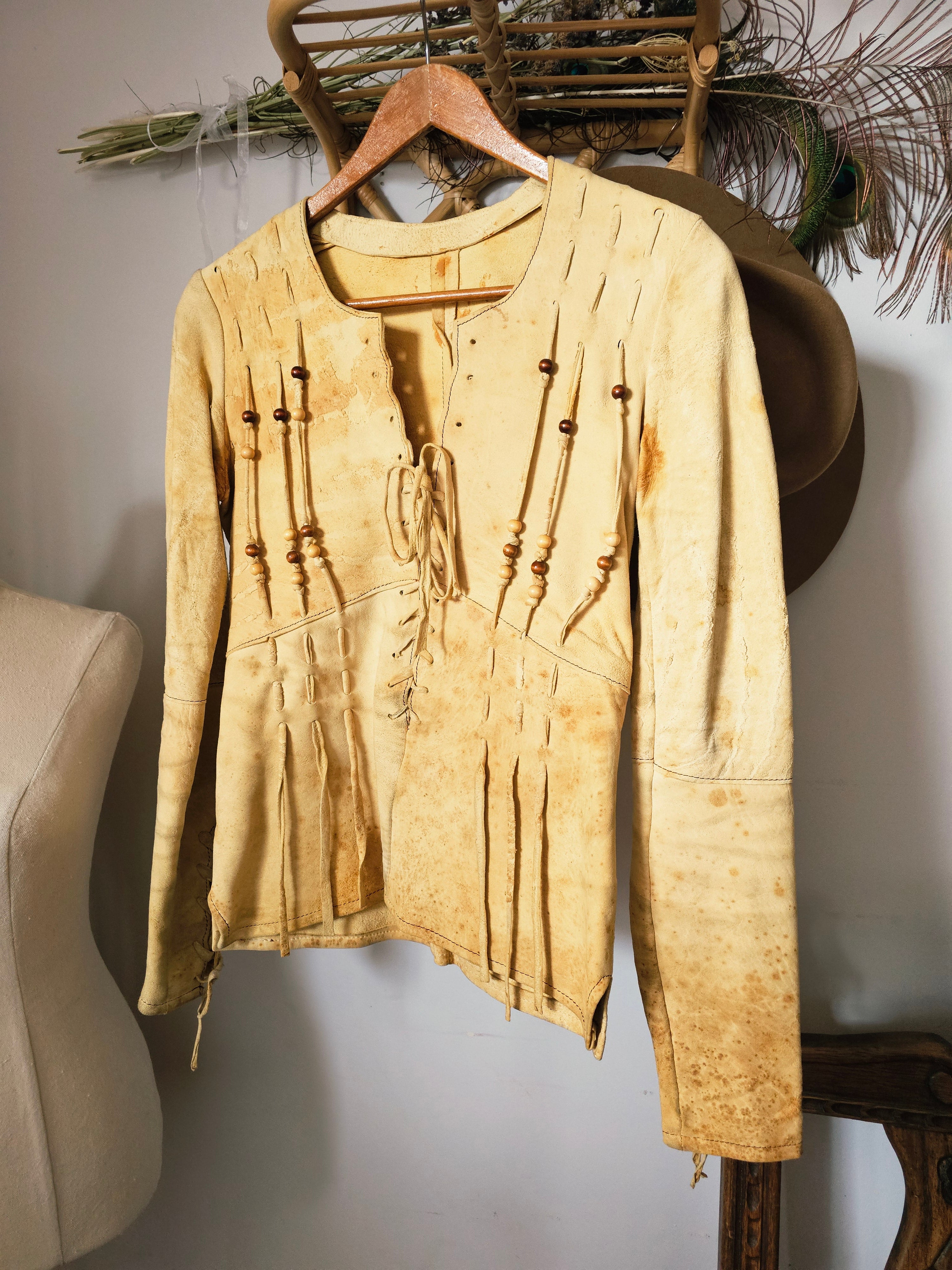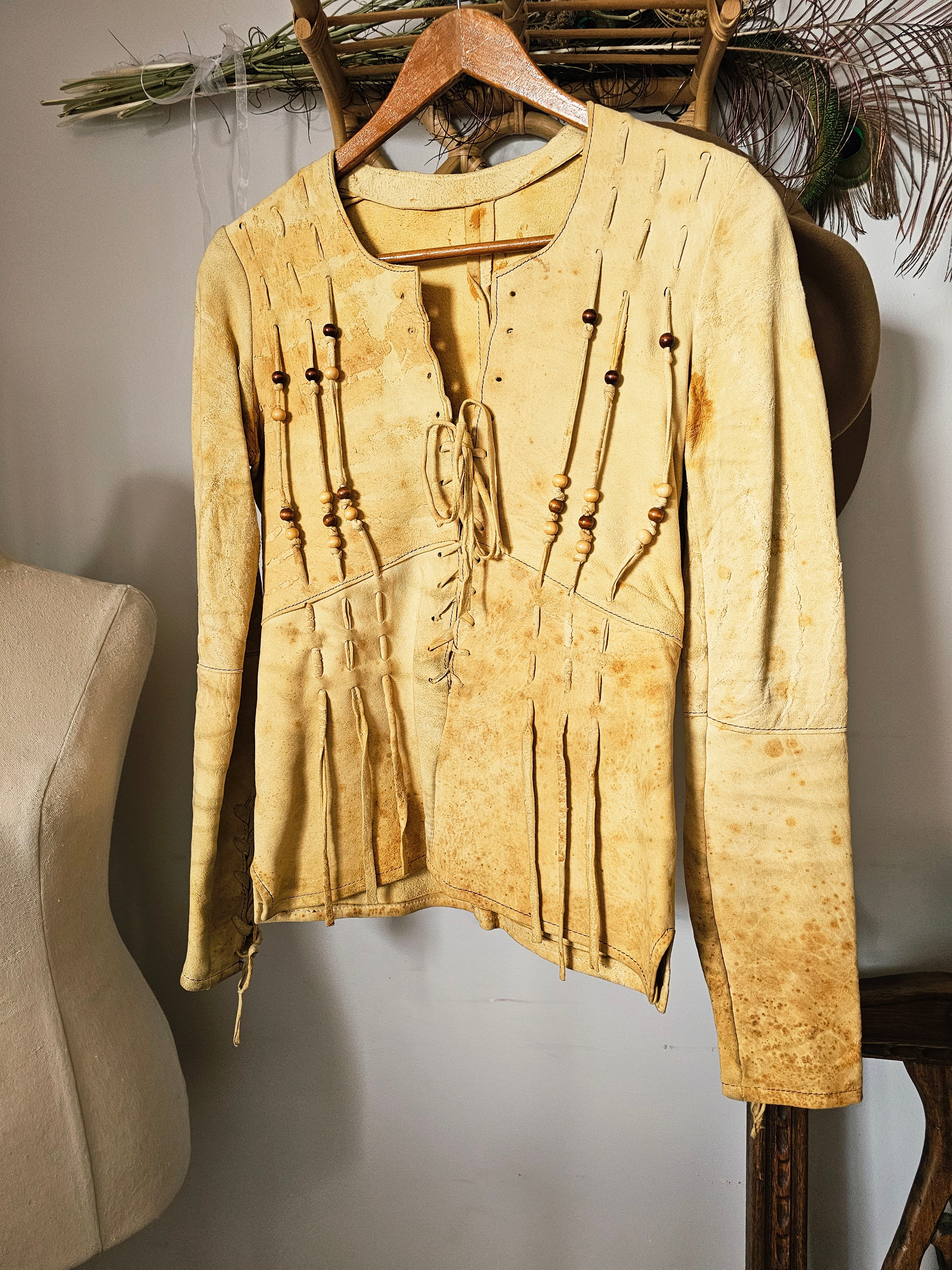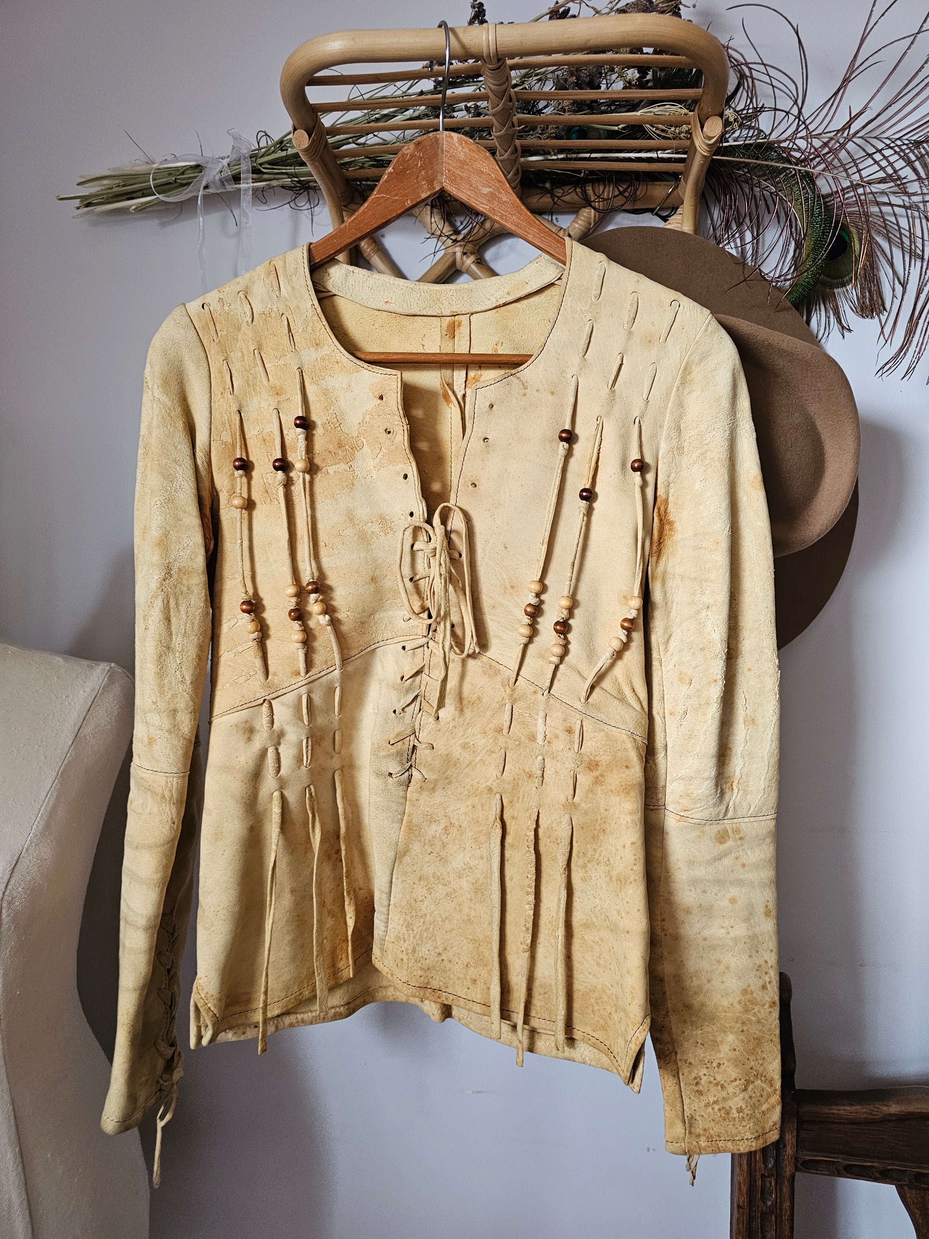 Incredible 70s boho leather/suede jacket in natural tan, featuring intricate lace-up front and sleeves with wooden bead detailing. A rare piece of wearable art, famously worn by Australian folk singer Margret RoadKnight (as seen on her LP cover). Measures laying flat: 40cm pit to pit, 41cm hip to hip, 73cm waist Pit to shoulder: 19cm Arm length: 62cm | Arm width: 12cm Length: 55cm front, 60cm back Long sleeves with lace-up cuff detail Raw edge hem with subtle fringing Naturally aged with marks, patina and wear that add to its authentic vintage character This jacket is for collectors, musicians, and lovers of true 70s bohemian fashion. Petite fit. A true one-of-a-kind piece.