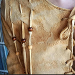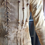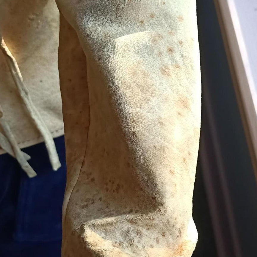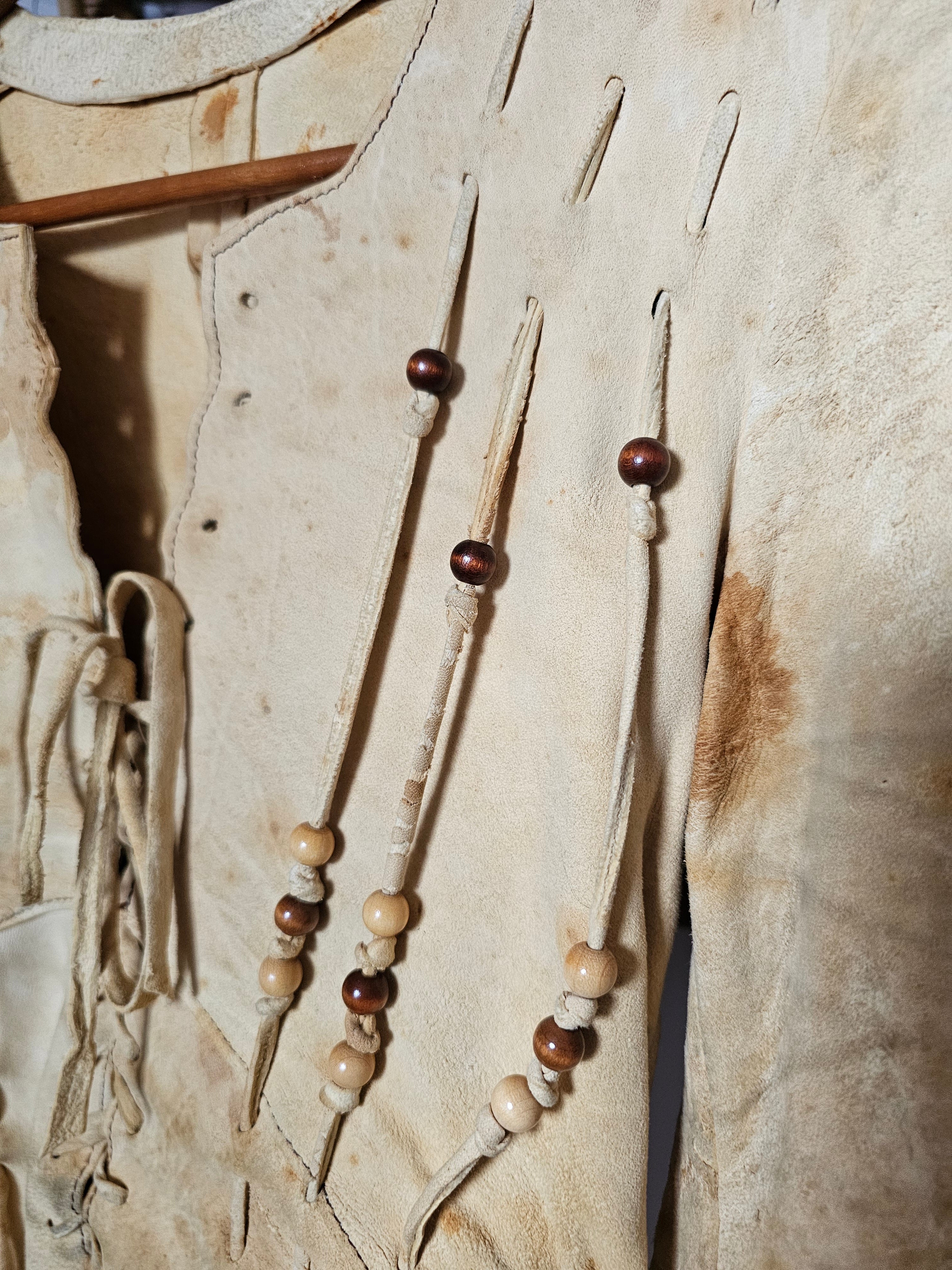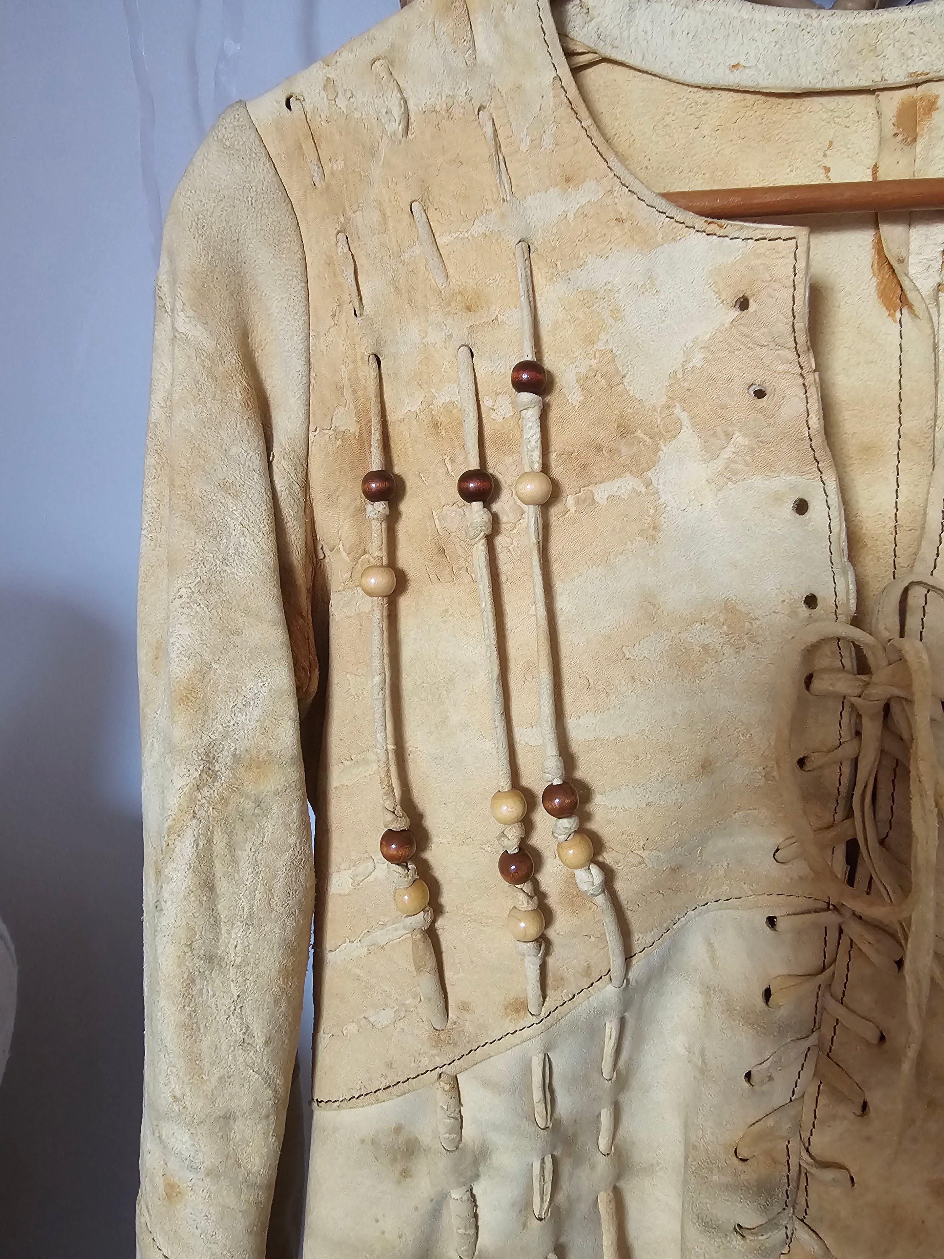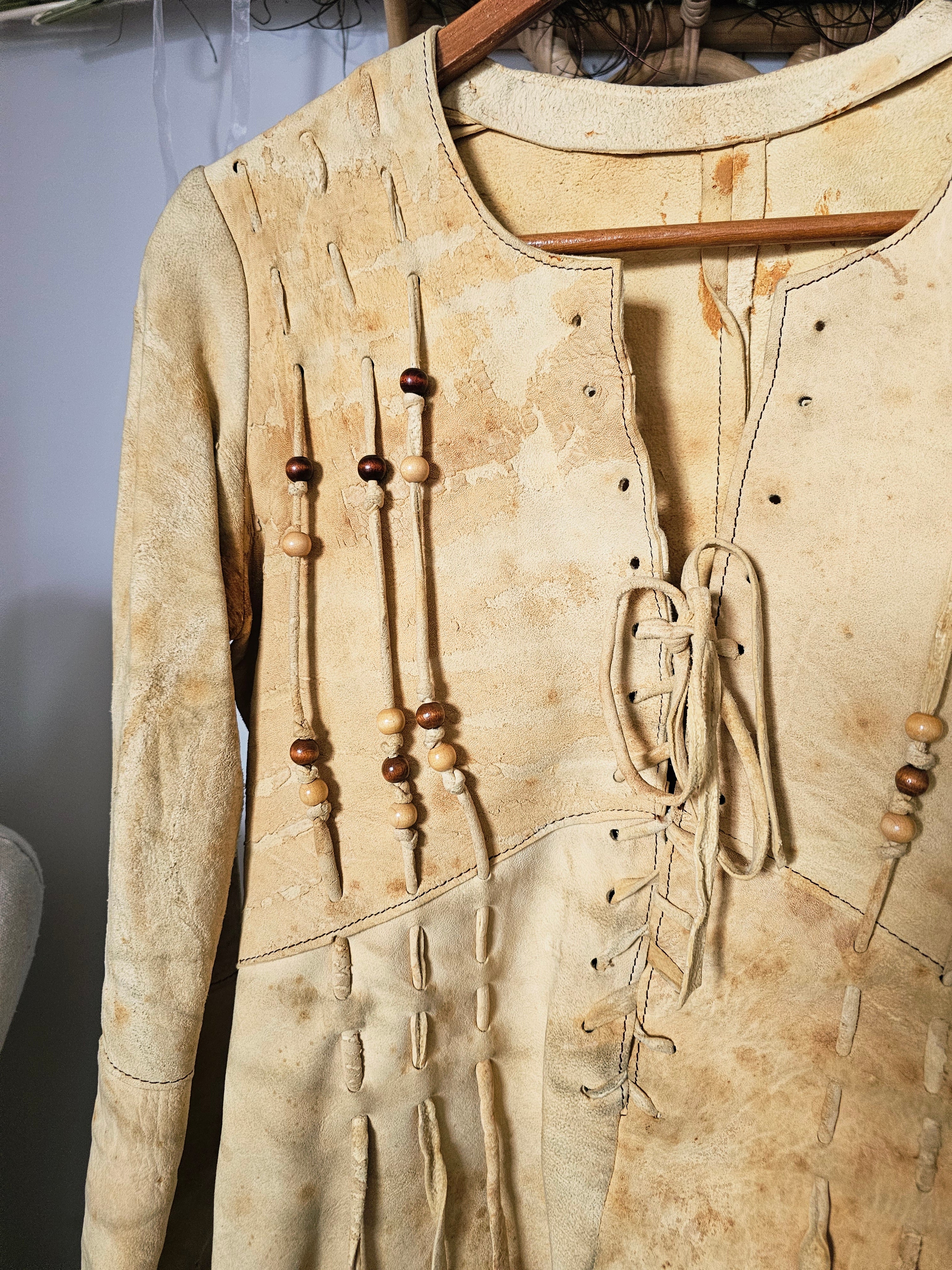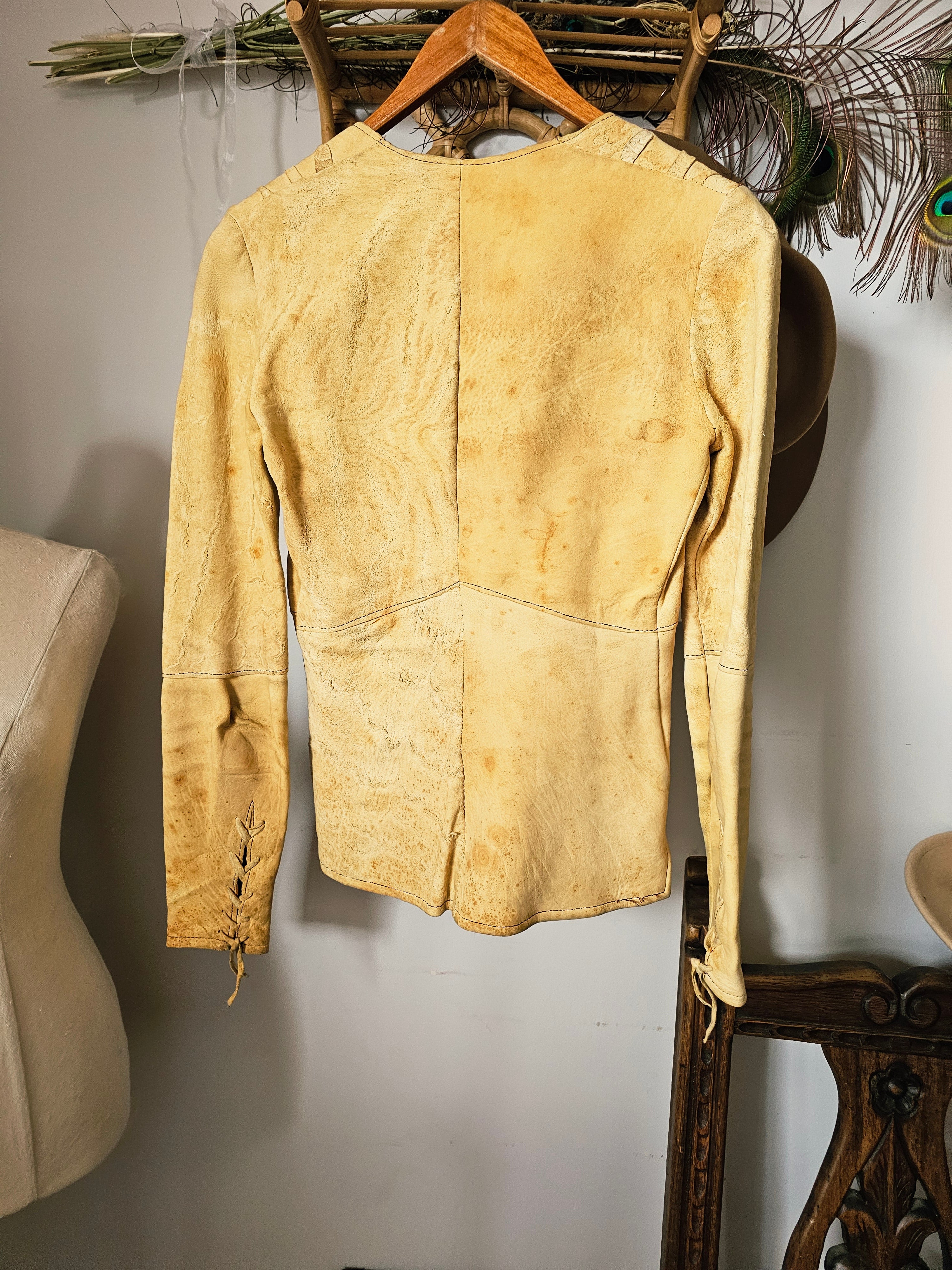 Incredible 70s boho leather/suede jacket in natural tan, featuring intricate lace-up front and sleeves with wooden bead detailing. A rare piece of wearable art, famously worn by Australian folk singer Margret RoadKnight (as seen on her LP cover). Measures laying flat: 40cm pit to pit, 41cm hip to hip, 73cm waist Pit to shoulder: 19cm Arm length: 62cm | Arm width: 12cm Length: 55cm front, 60cm back Long sleeves with lace-up cuff detail Raw edge hem with subtle fringing Naturally aged with marks, patina and wear that add to its authentic vintage character This jacket is for collectors, musicians, and lovers of true 70s bohemian fashion. Petite fit. A true one-of-a-kind piece.