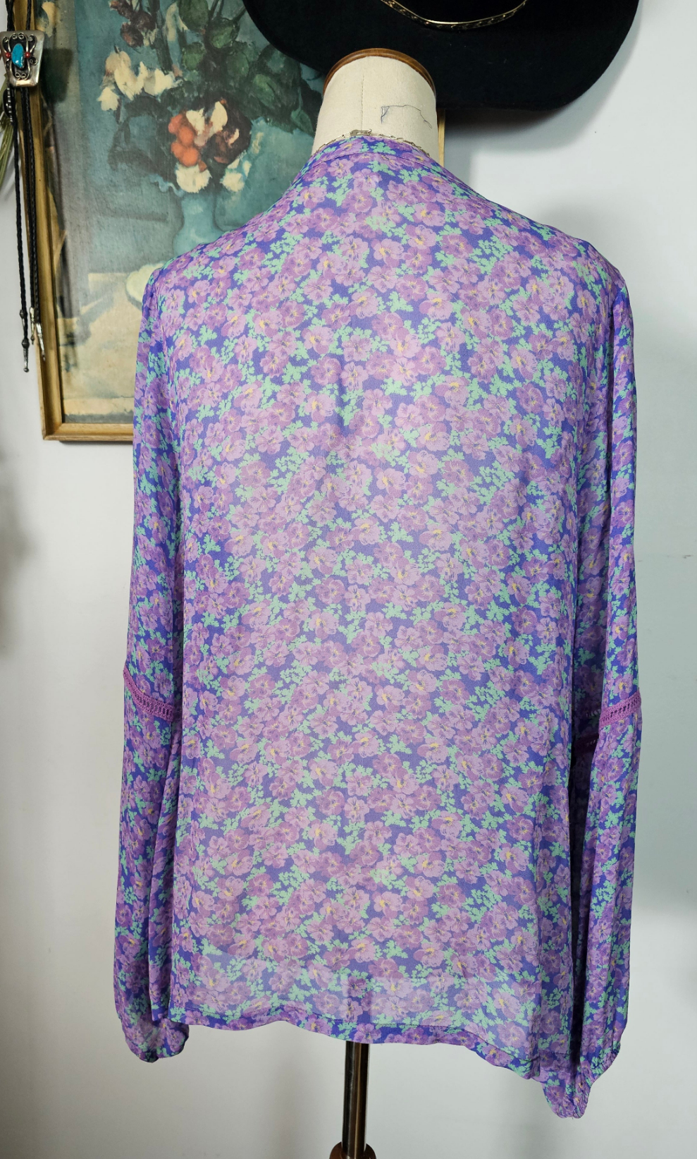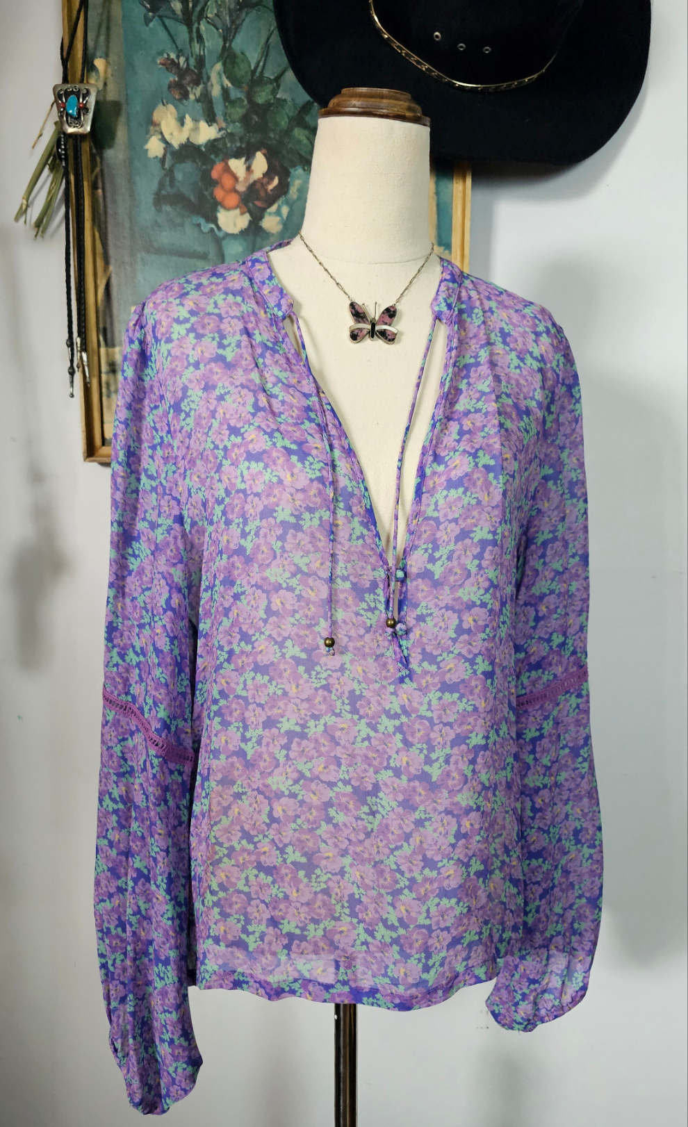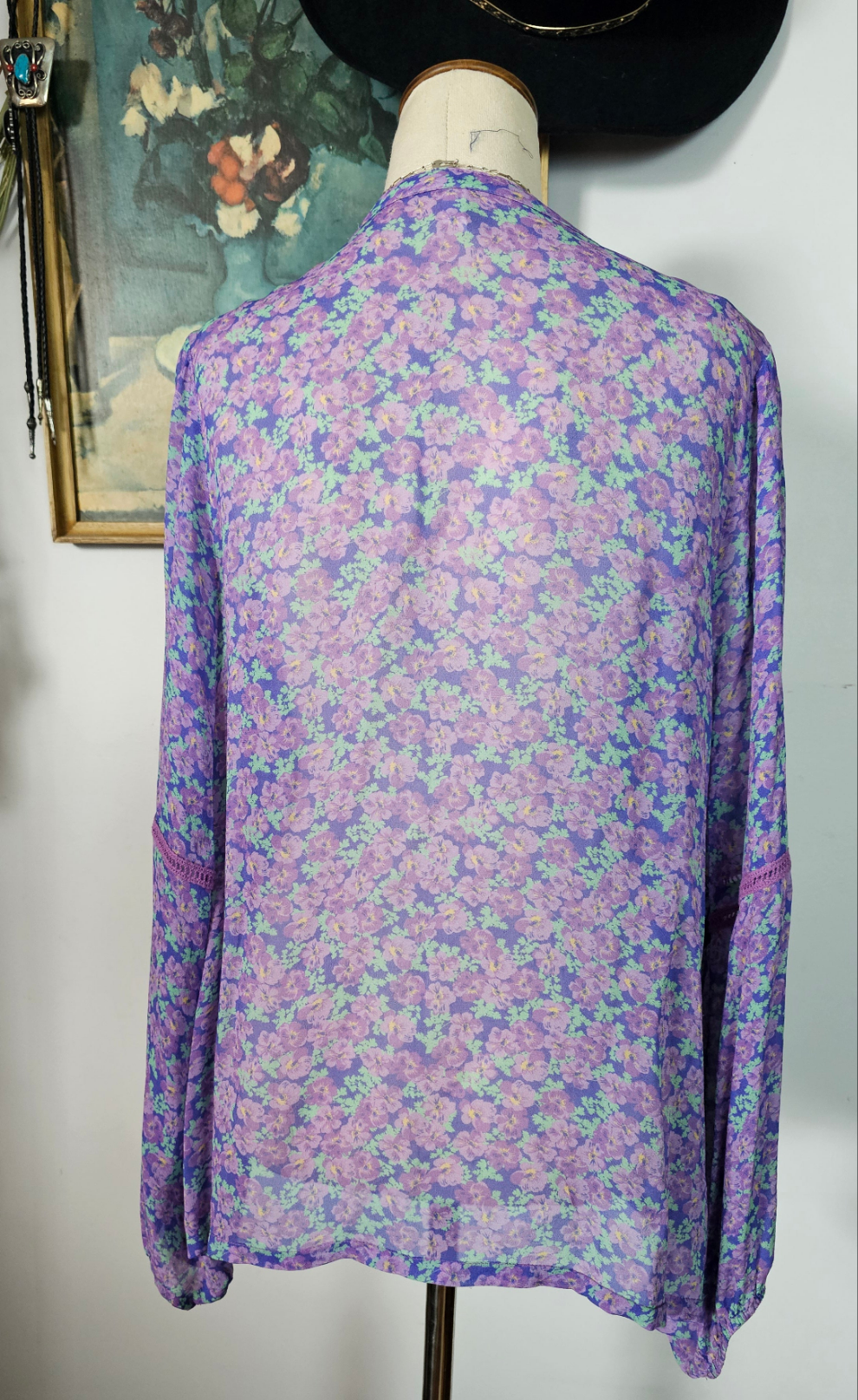 An iconic and sought-after piece from the early days of Spell & The Gypsy Collective, the Wildflower blouse is a true collector's gem. Made from a sheer, lightweight fabric, this floaty boho blouse features a romantic floral print in soft purples, greens, and pinks. The relaxed silhouette is enhanced with billowy sleeves, delicate lace trim, and adjustable neck ties with beaded ends, making it effortlessly dreamy and versatile.