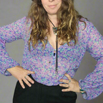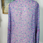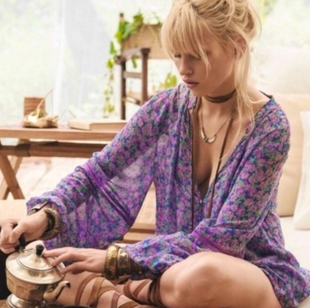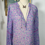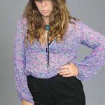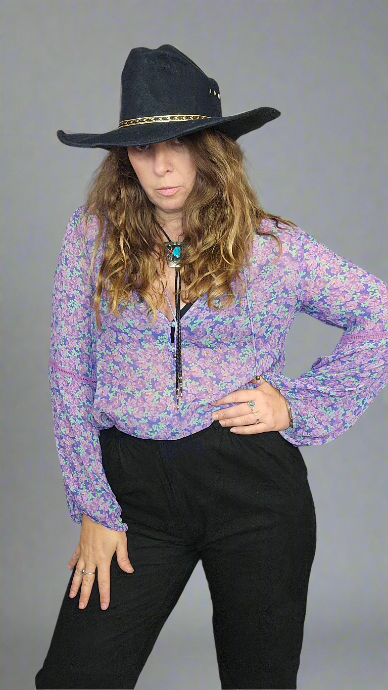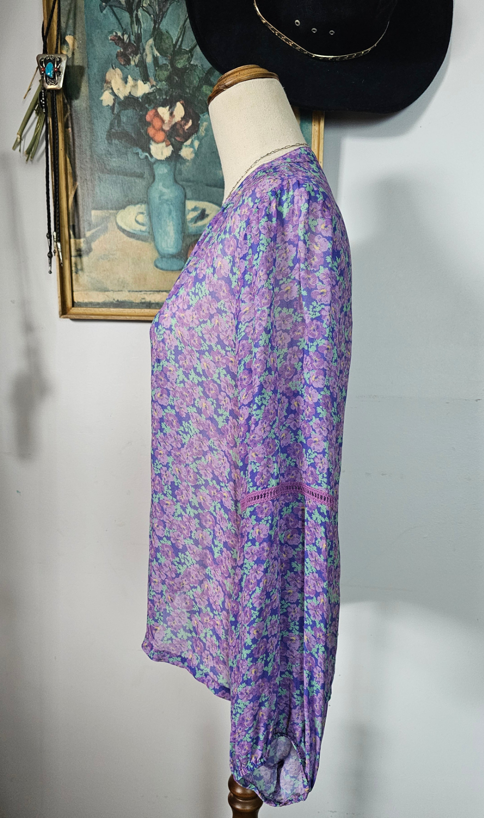 An iconic and sought-after piece from the early days of Spell & The Gypsy Collective, the Wildflower blouse is a true collector's gem. Made from a sheer, lightweight fabric, this floaty boho blouse features a romantic floral print in soft purples, greens, and pinks. The relaxed silhouette is enhanced with billowy sleeves, delicate lace trim, and adjustable neck ties with beaded ends, making it effortlessly dreamy and versatile.