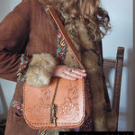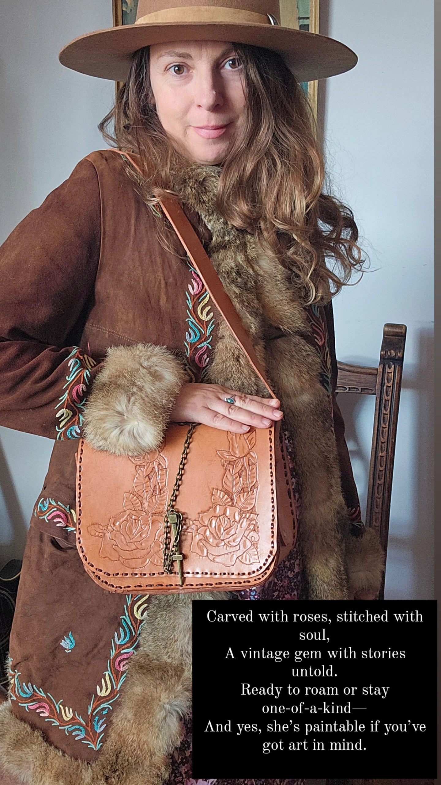 Crafted from thick, raw leather with deep floral embossing and stitched edges, this one-of-a-kind vintage shoulder bag is a timeless piece of Western artistry. The intricate rose motif, unique chain toggle closure, and structured body give it that rugged boho edge, while the natural patina tells a story of craftsmanship and character.