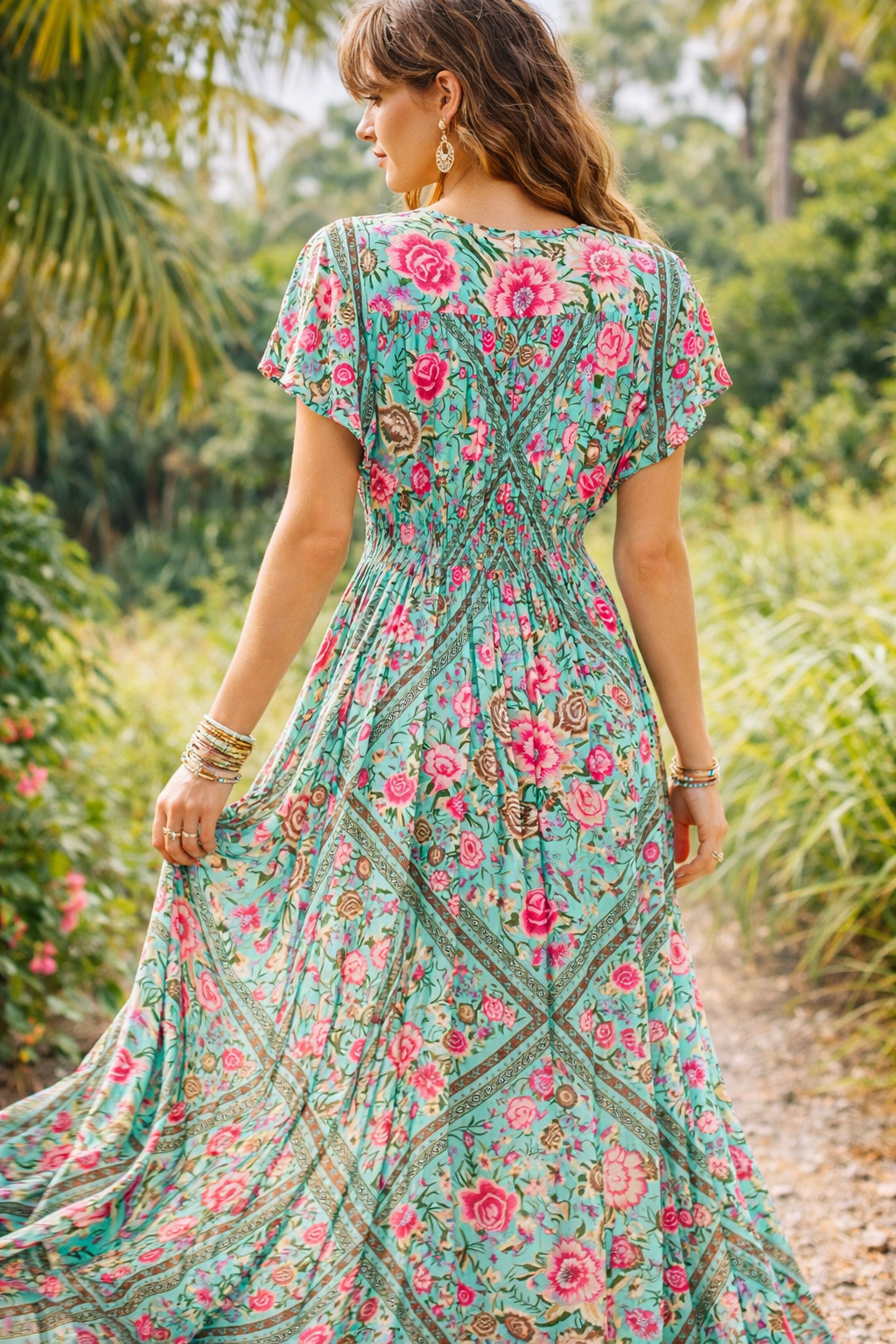 Print: Distinctive turquoise base adorned with vibrant pink and purple floral patterns, embodying the brand's free-spirited aesthetic.