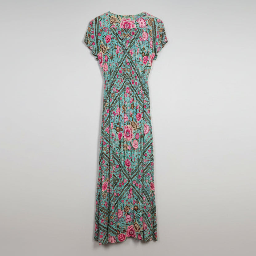 Design: Maxi-length with a flowing silhouette, featuring a V-neckline and short sleeves.