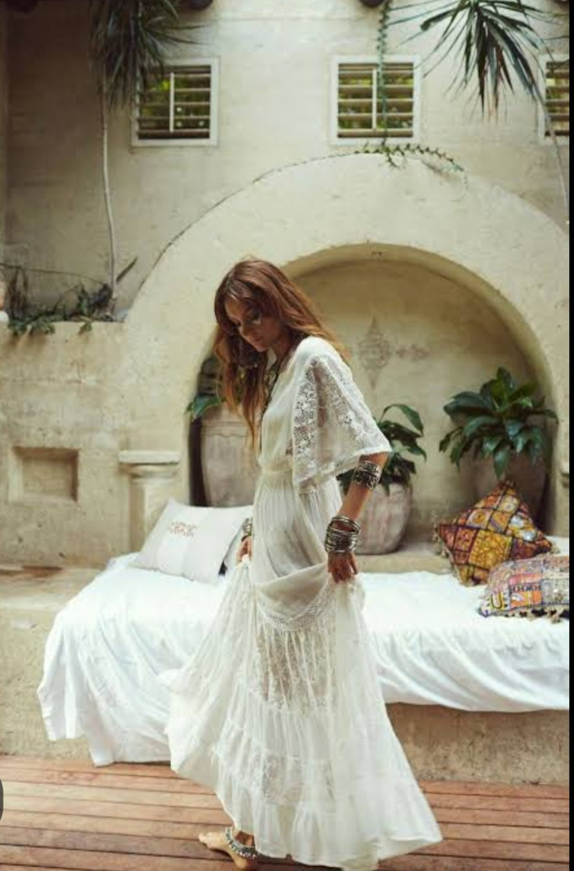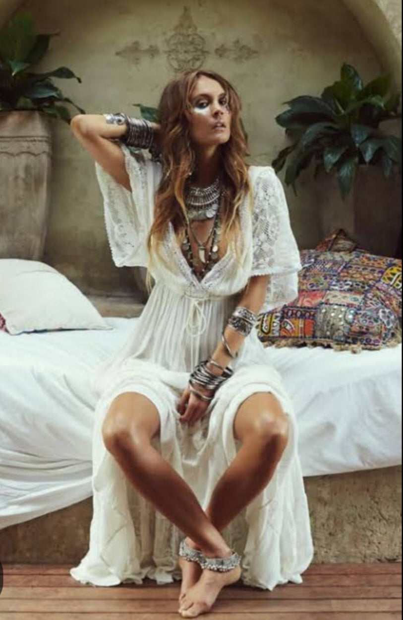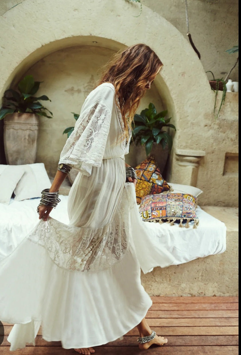 A rare and coveted piece from Tree of Life, the Alexandria Dress is a dreamy bohemian treasure that blends romance with effortless wearability. Crafted in soft, lightweight cotton and detailed with panels of vintage-style lace, it floats with every step and captures that timeless 70s free-spirited vibe.