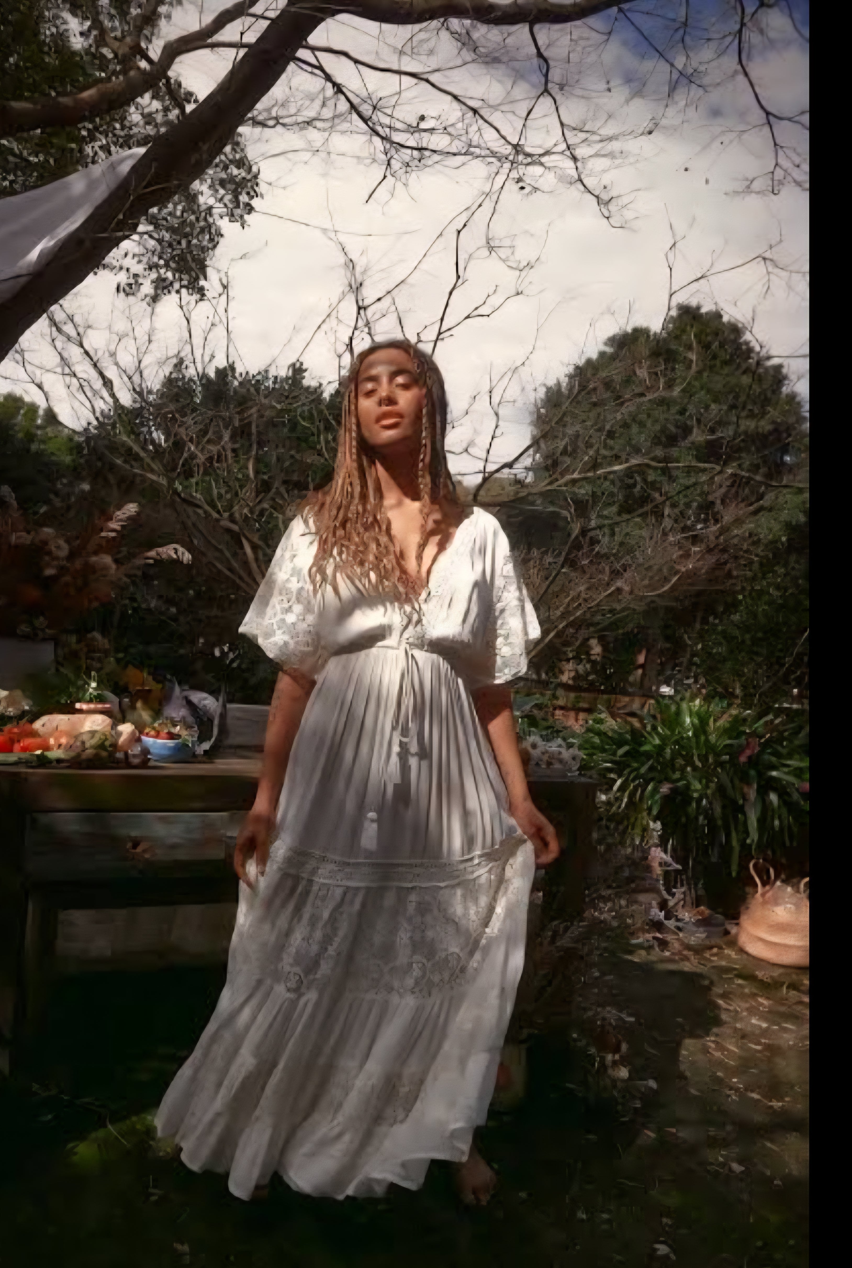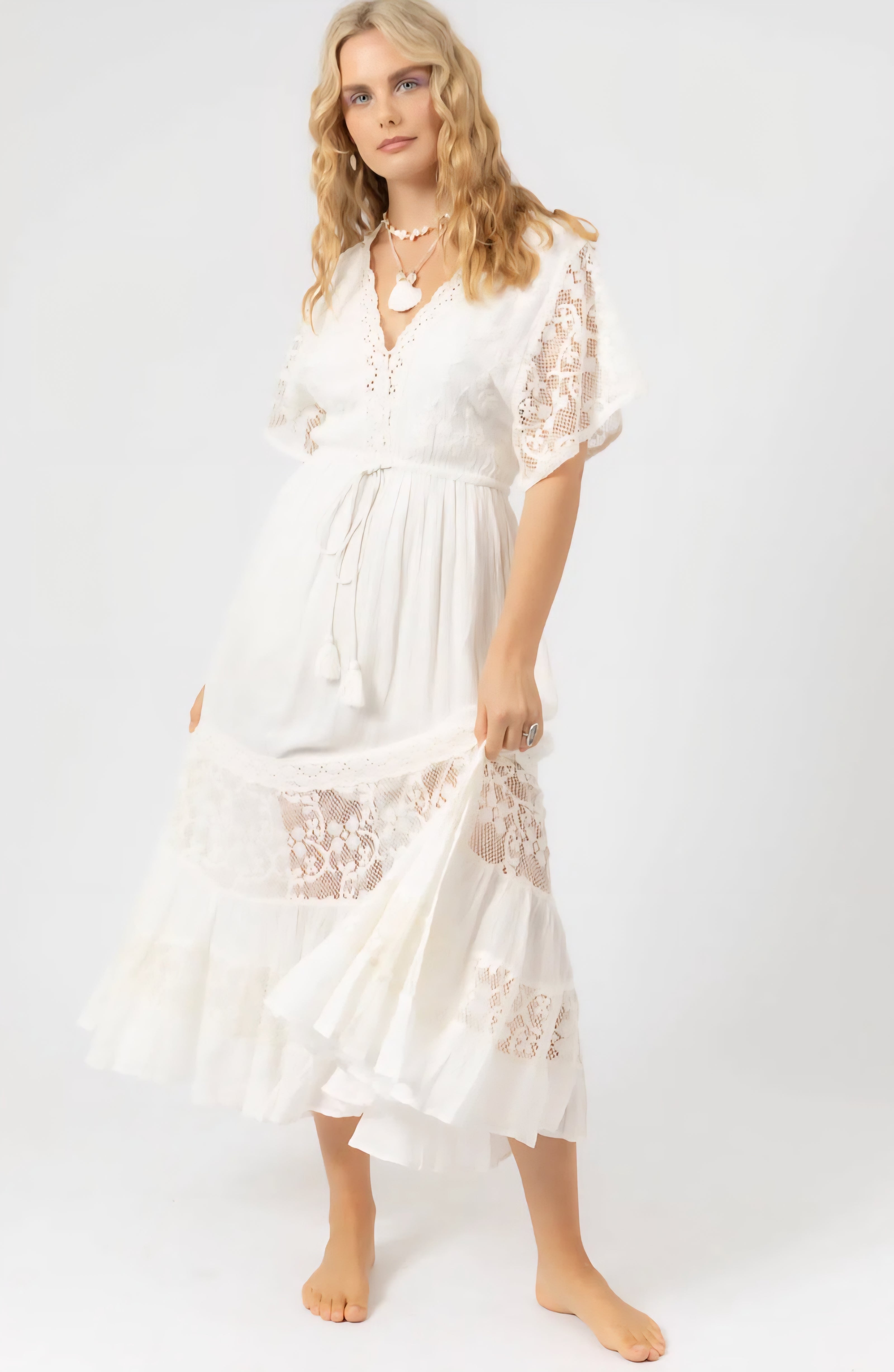 • Details: Flutter sleeves, tiered lace panels, maxi length, V-neckline