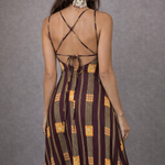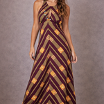 True 1970s magic ✨ in rich plum, mustard, and orange chevron stripes. This vintage Lady Bela piece features a halter-style neckline with front keyhole detail, open tie-back design, and a figure-hugging stretch fabric that flatters every curve.