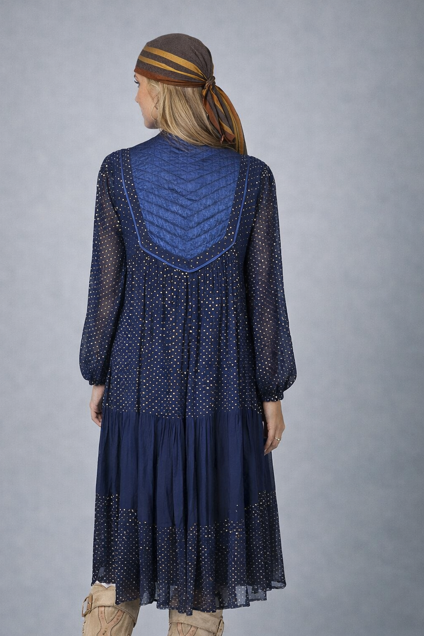 Float into a golden-hour daydream in this vintage Adini dress—crafted in India from soft rayon and flecked with metallic gold dots that shimmer with every step. With a quilted bib yoke, tiered skirt, and balloon sleeves, it's a true bohemian beauty with a celestial twist.
