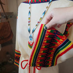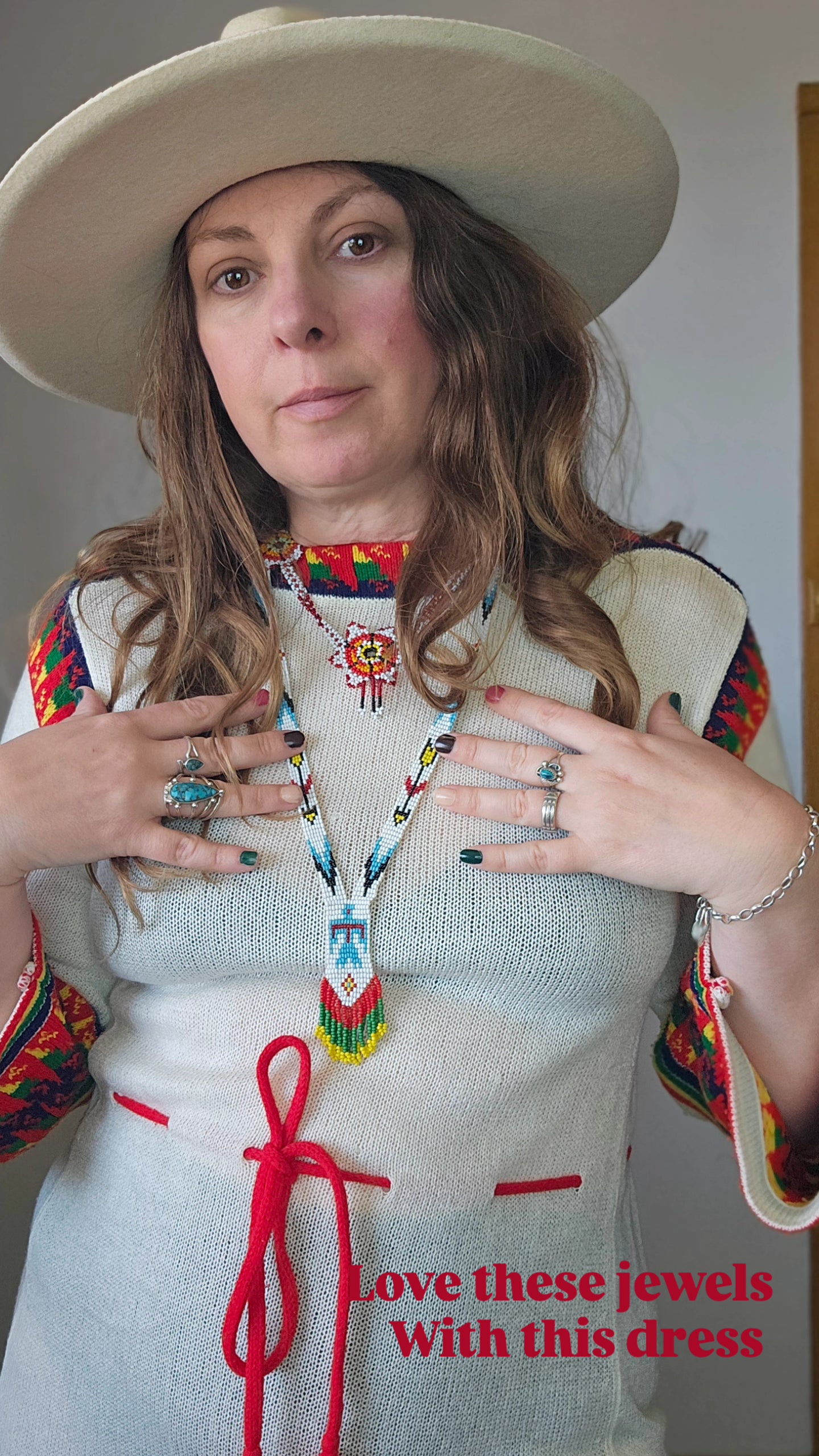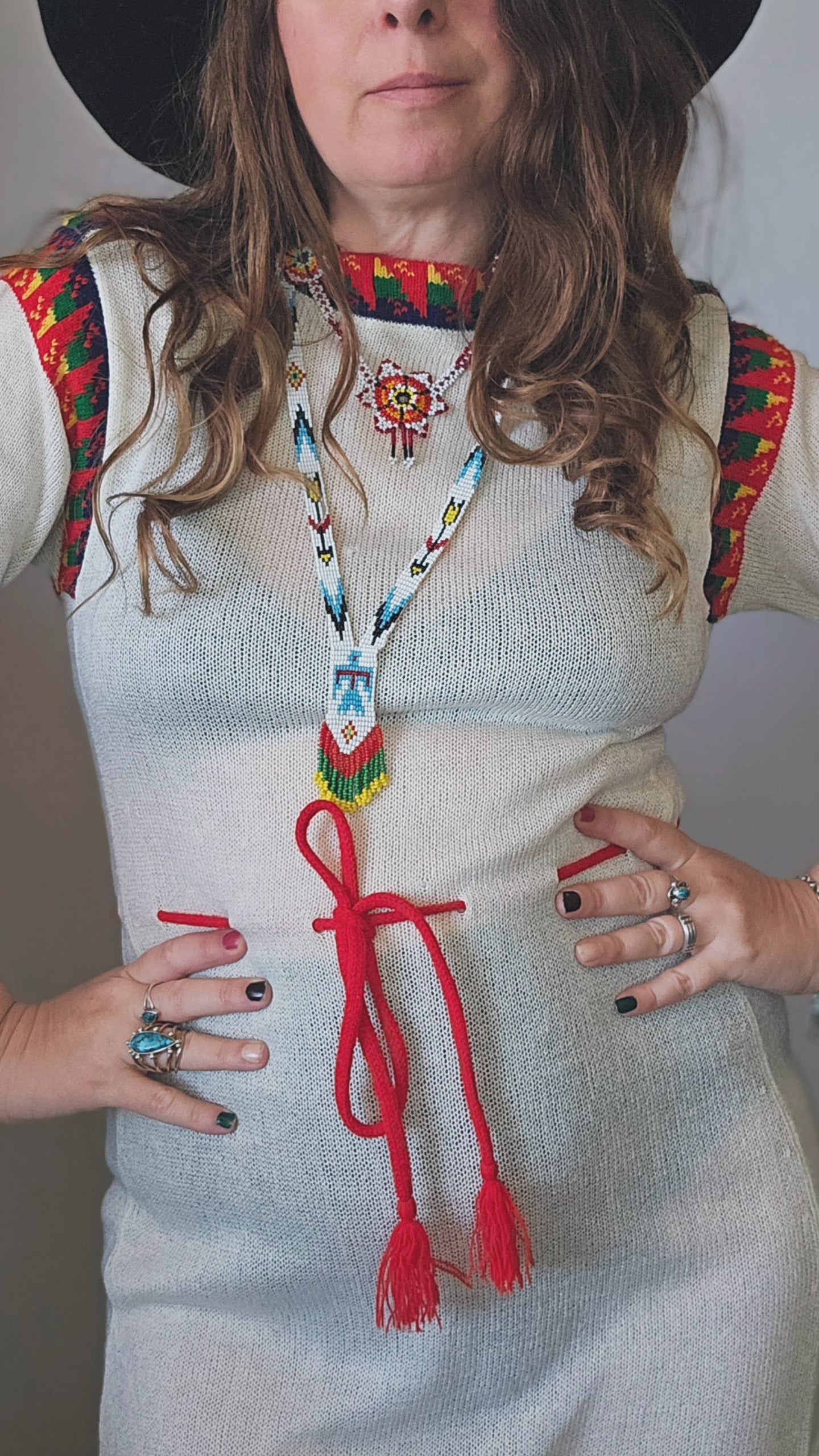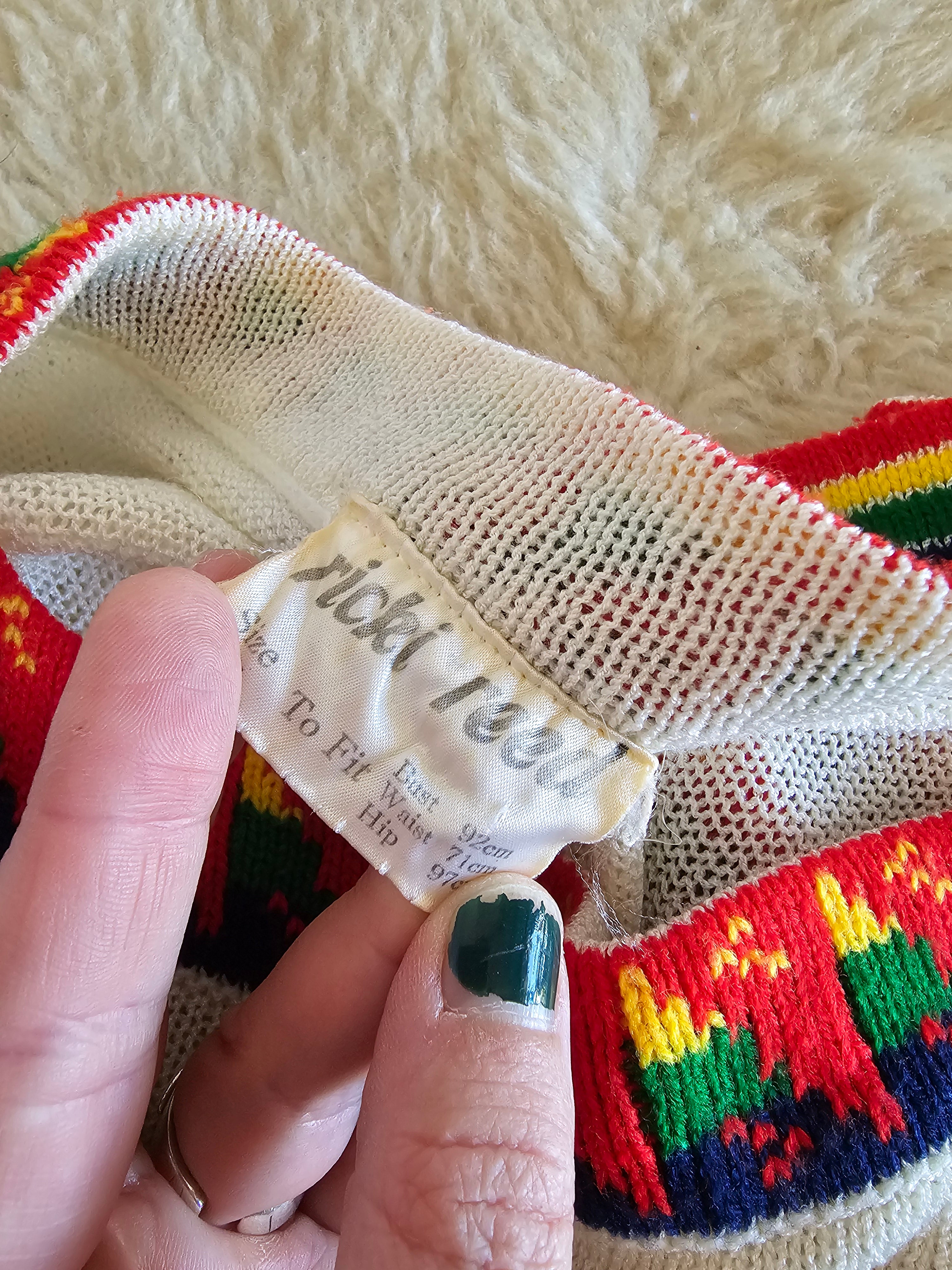 A true bohemian gem from the 1970s – this handloom-style knit dress is rich in detail and colour. Made in Mexico, it features bold rainbow woven panels at the sleeves and hemline, paired with a vibrant red waist tie. The cream knit body is soft yet structured, creating a flattering fit that skims the figure.
