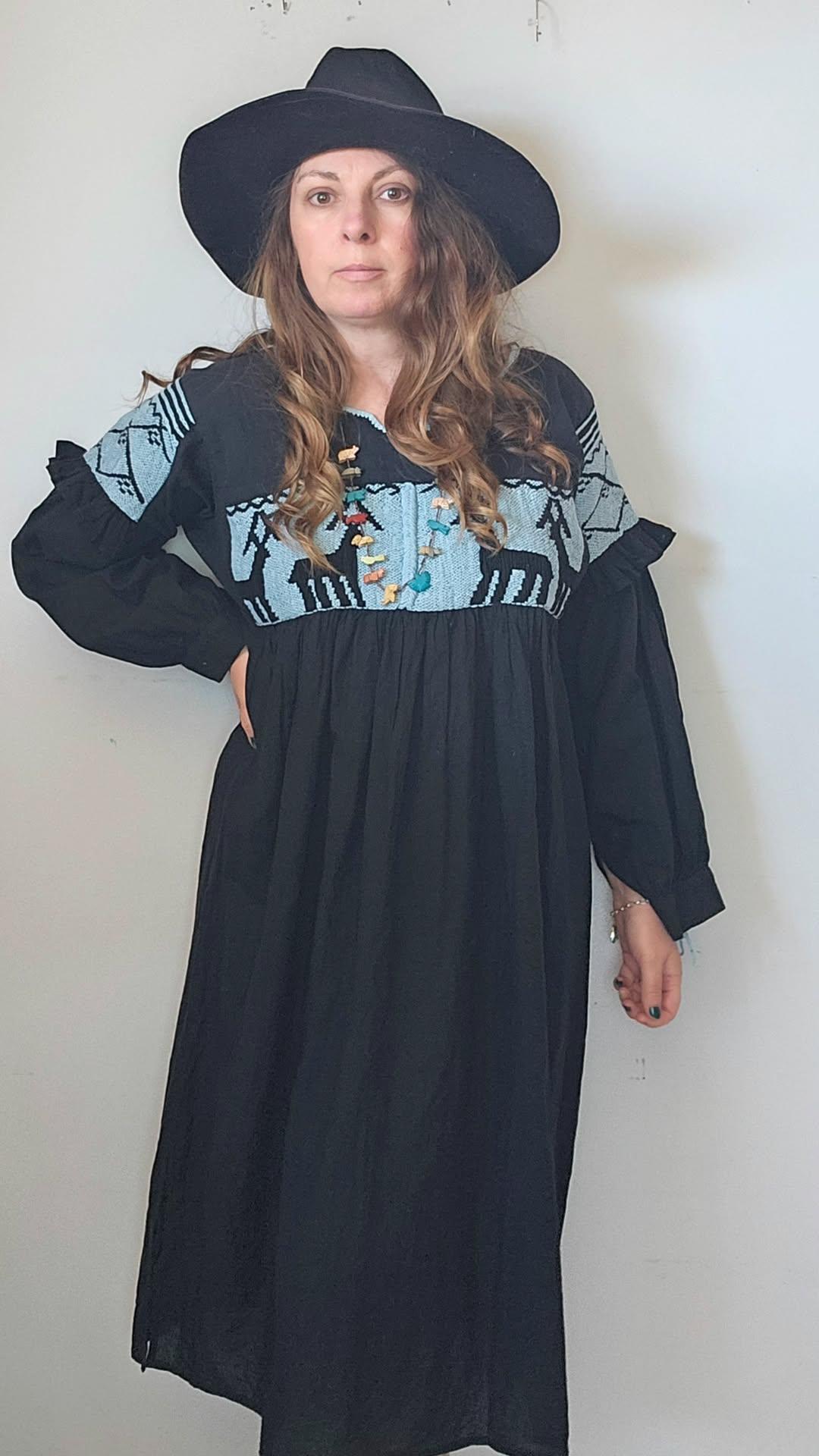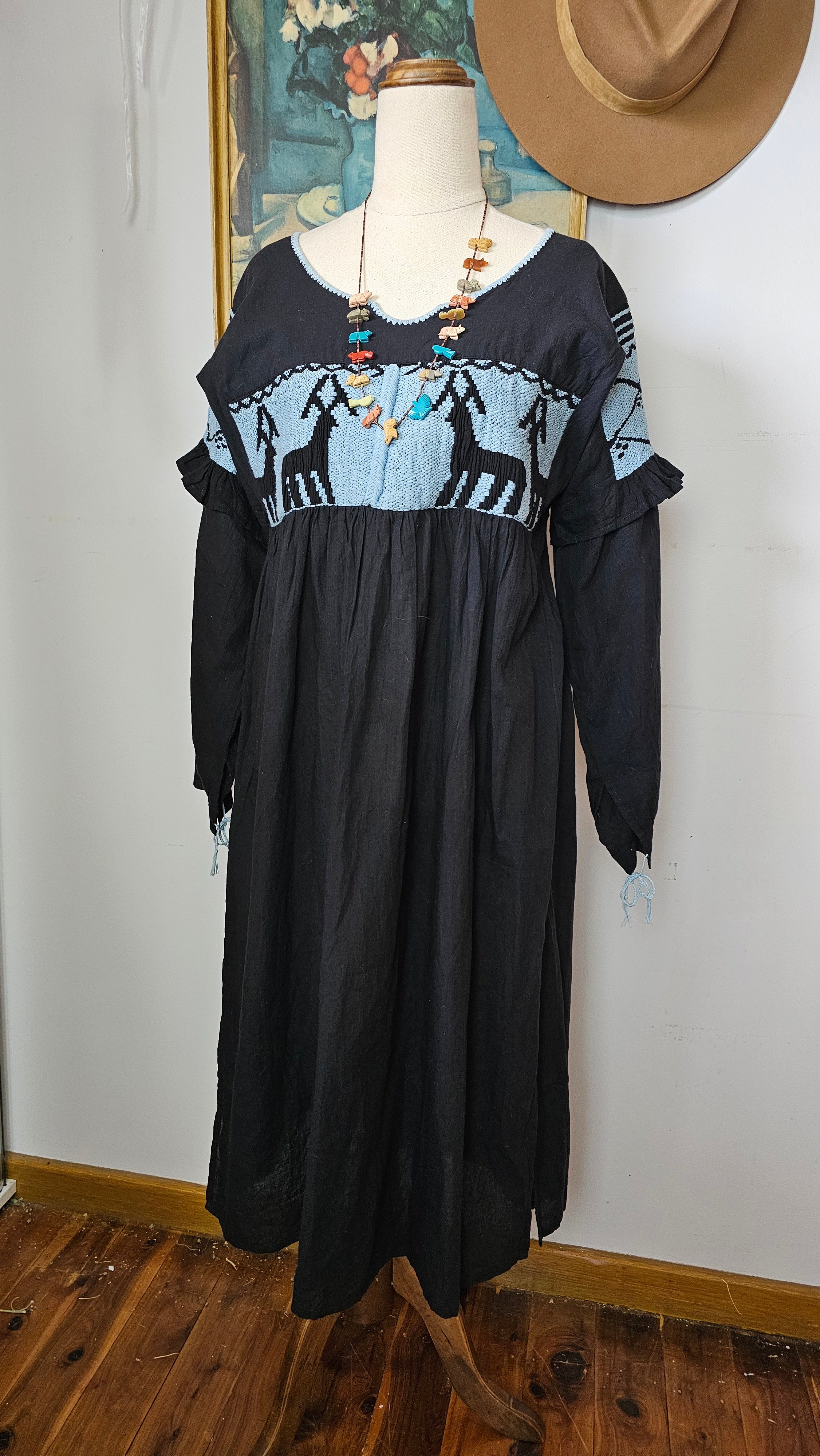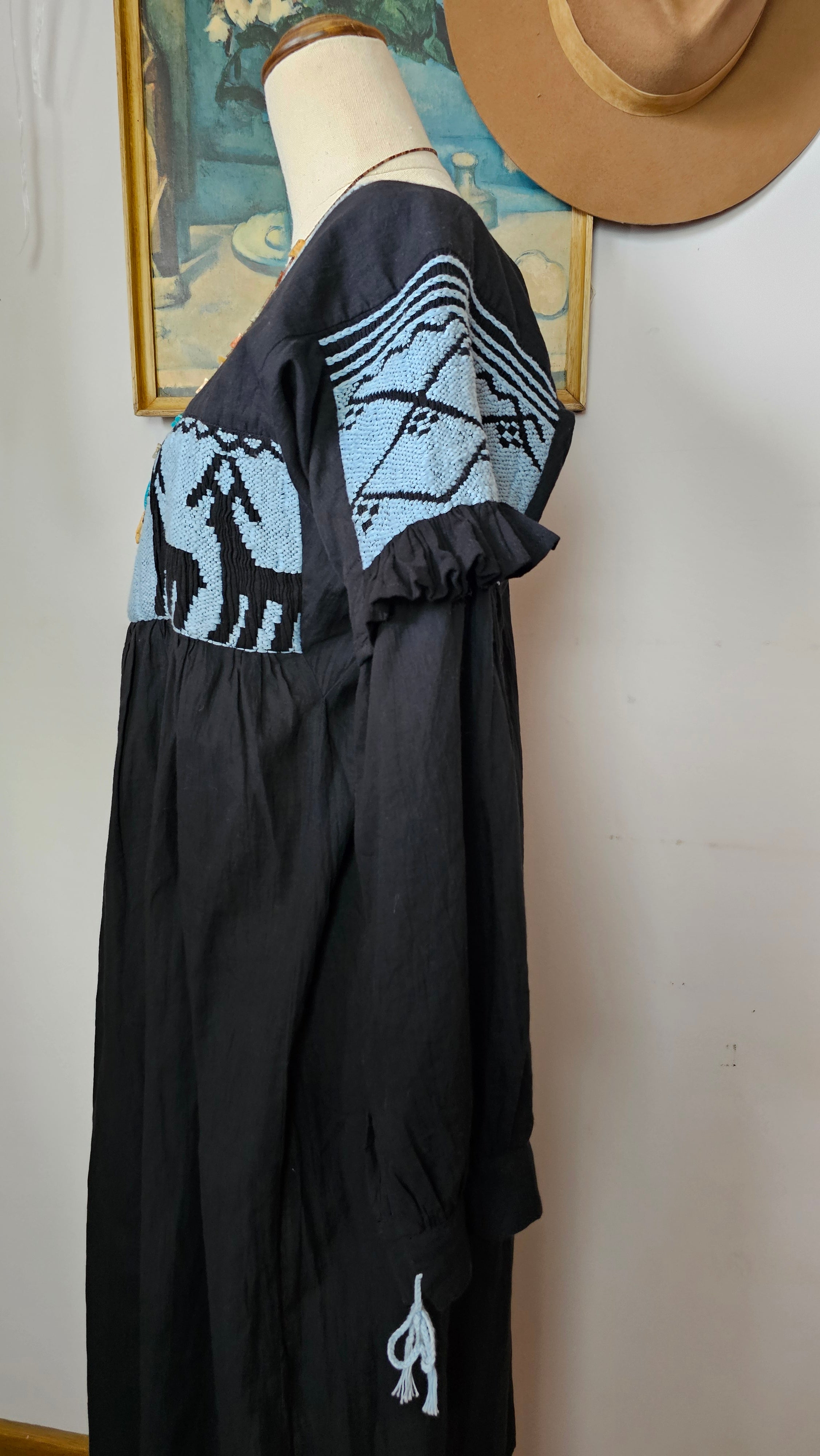 A rare vintage Mexican cotton dress, crafted in soft black cotton with striking handwoven blue embroidery. The bodice features an intricate pattern of deer and geometric motifs, bringing a folkloric, artisanal touch. Long sleeves finish with tie cuffs, and the relaxed cut flows into a full-length silhouette. Details: 100% cotton Black base with sky-blue embroidery of deer and mountains Long sleeves with adjustable ties Loose, flowing fit Measurements (approx. laying flat): Pit to pit: 52 cm Length: 112 cm A beautiful collectible piece that blends traditional Mexican craftsmanship with effortless bohemian style.