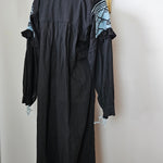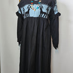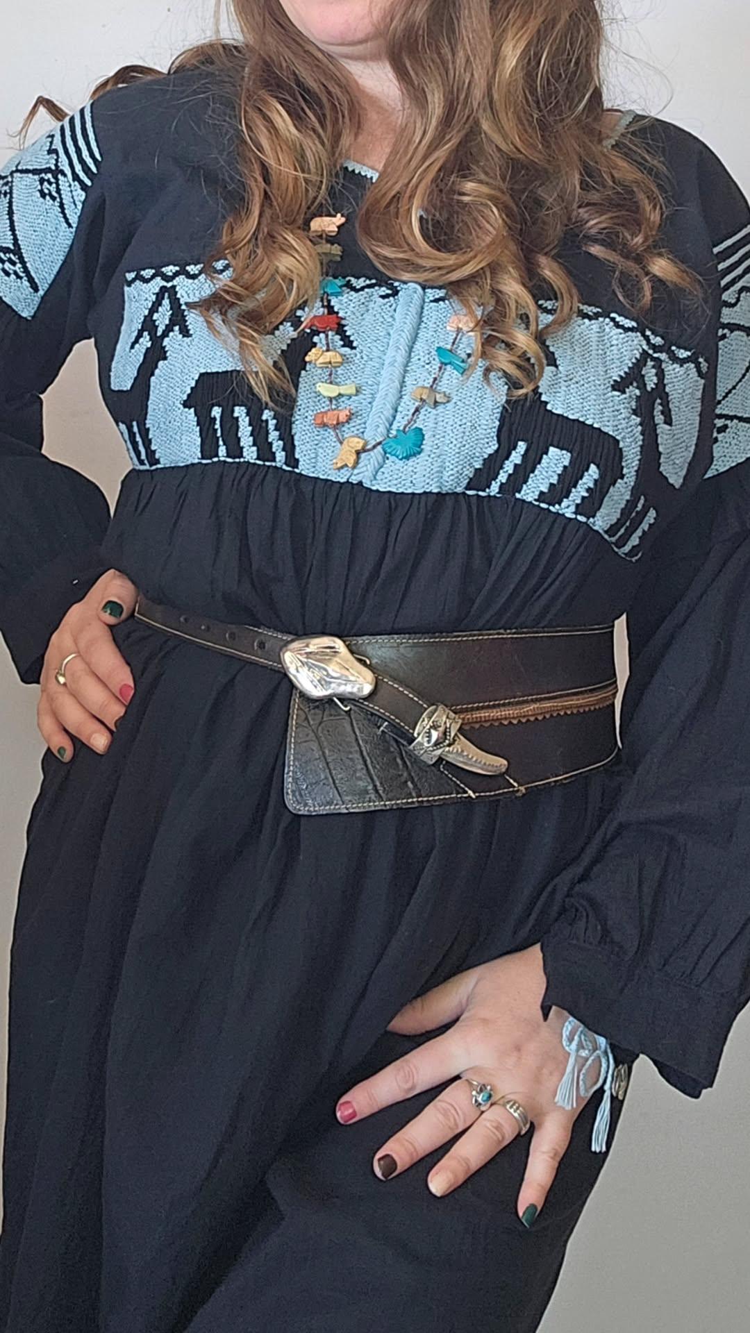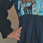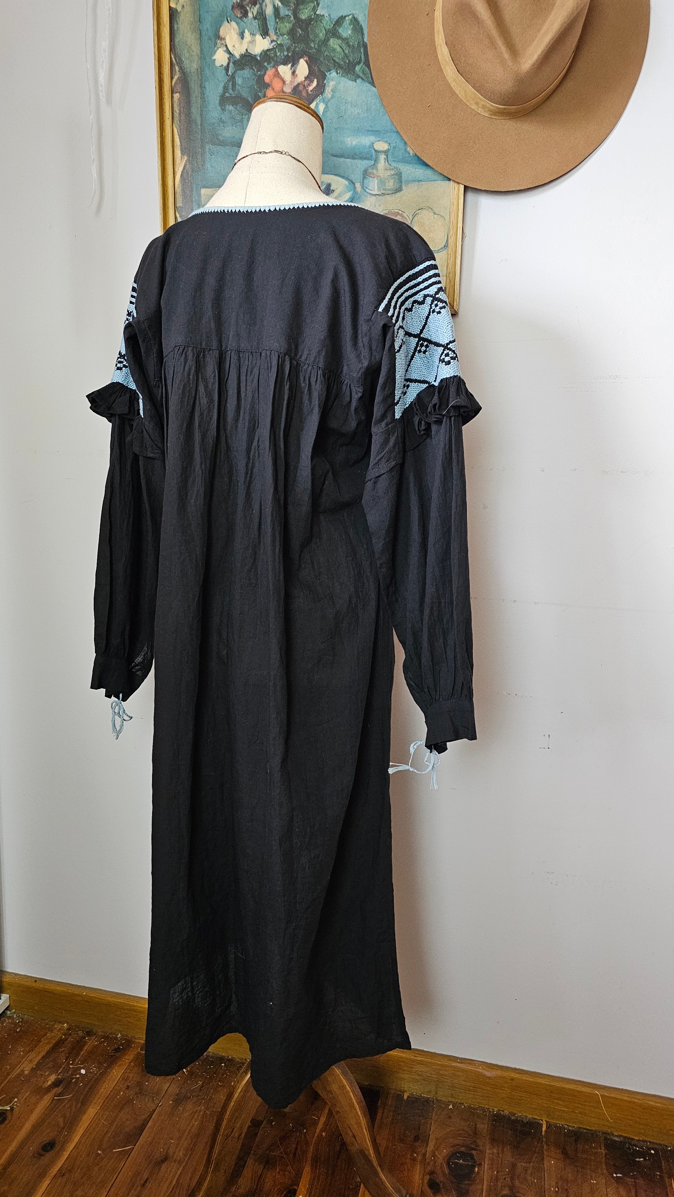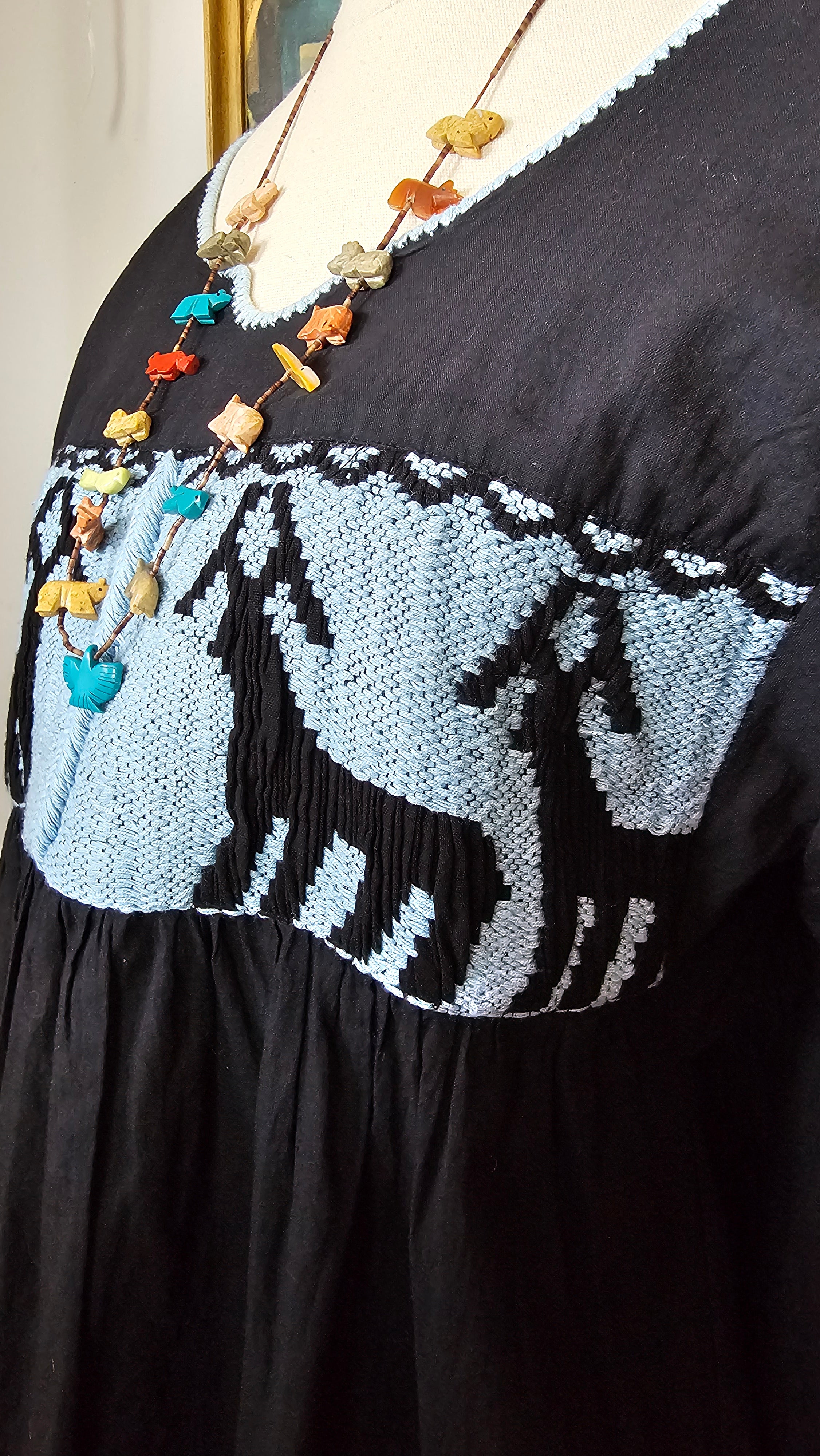 A rare vintage Mexican cotton dress, crafted in soft black cotton with striking handwoven blue embroidery. The bodice features an intricate pattern of deer and geometric motifs, bringing a folkloric, artisanal touch. Long sleeves finish with tie cuffs, and the relaxed cut flows into a full-length silhouette. Details: 100% cotton Black base with sky-blue embroidery of deer and mountains Long sleeves with adjustable ties Loose, flowing fit Measurements (approx. laying flat): Pit to pit: 52 cm Length: 112 cm A beautiful collectible piece that blends traditional Mexican craftsmanship with effortless bohemian style.