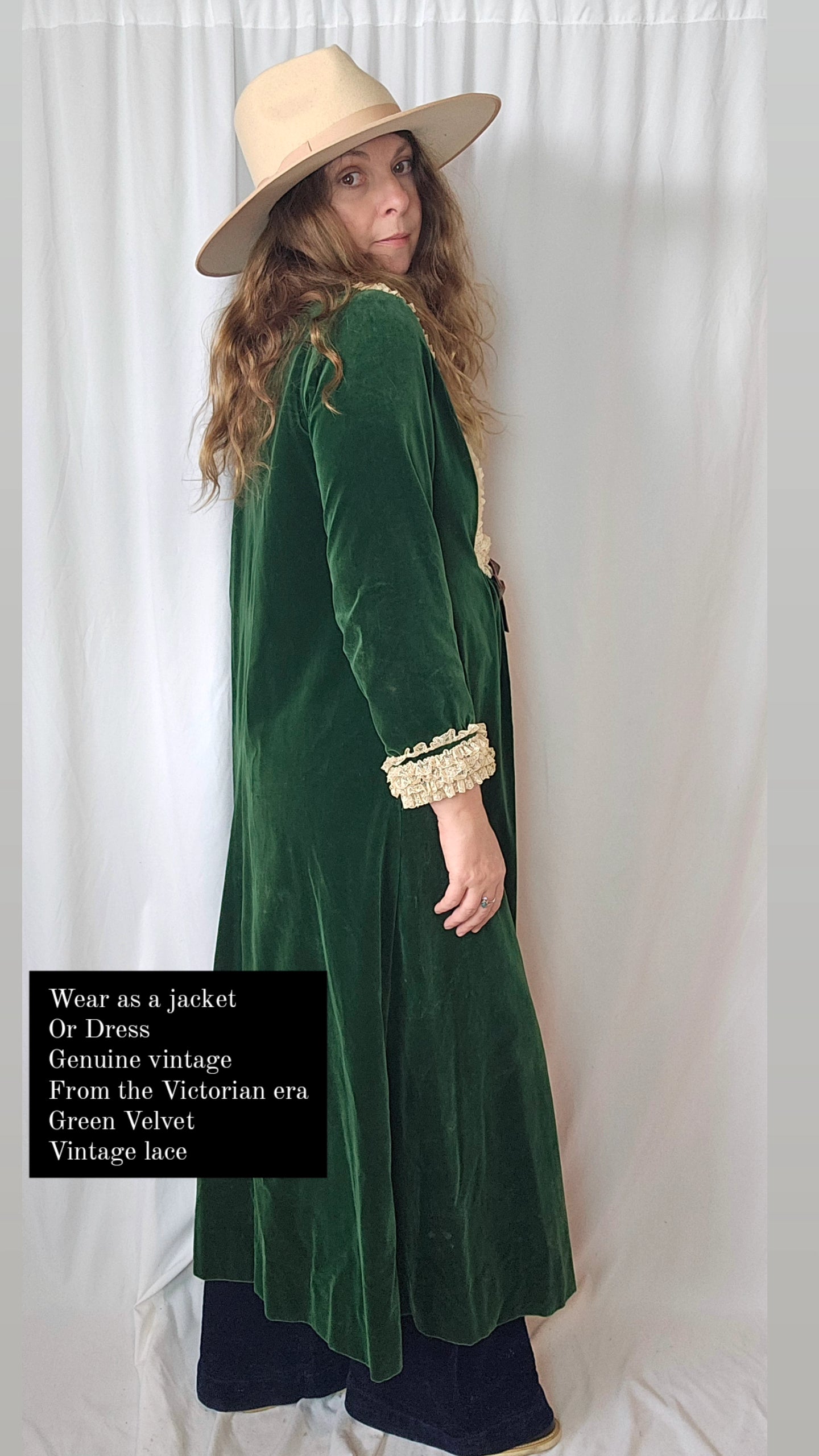 Wear it buttoned as a regal dress or open over denim and boots for a layered boho-luxe look. Soft, drapey velvet and vintage lace create a showstopping silhouette perfect for festivals, photoshoots, or everyday magic.