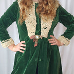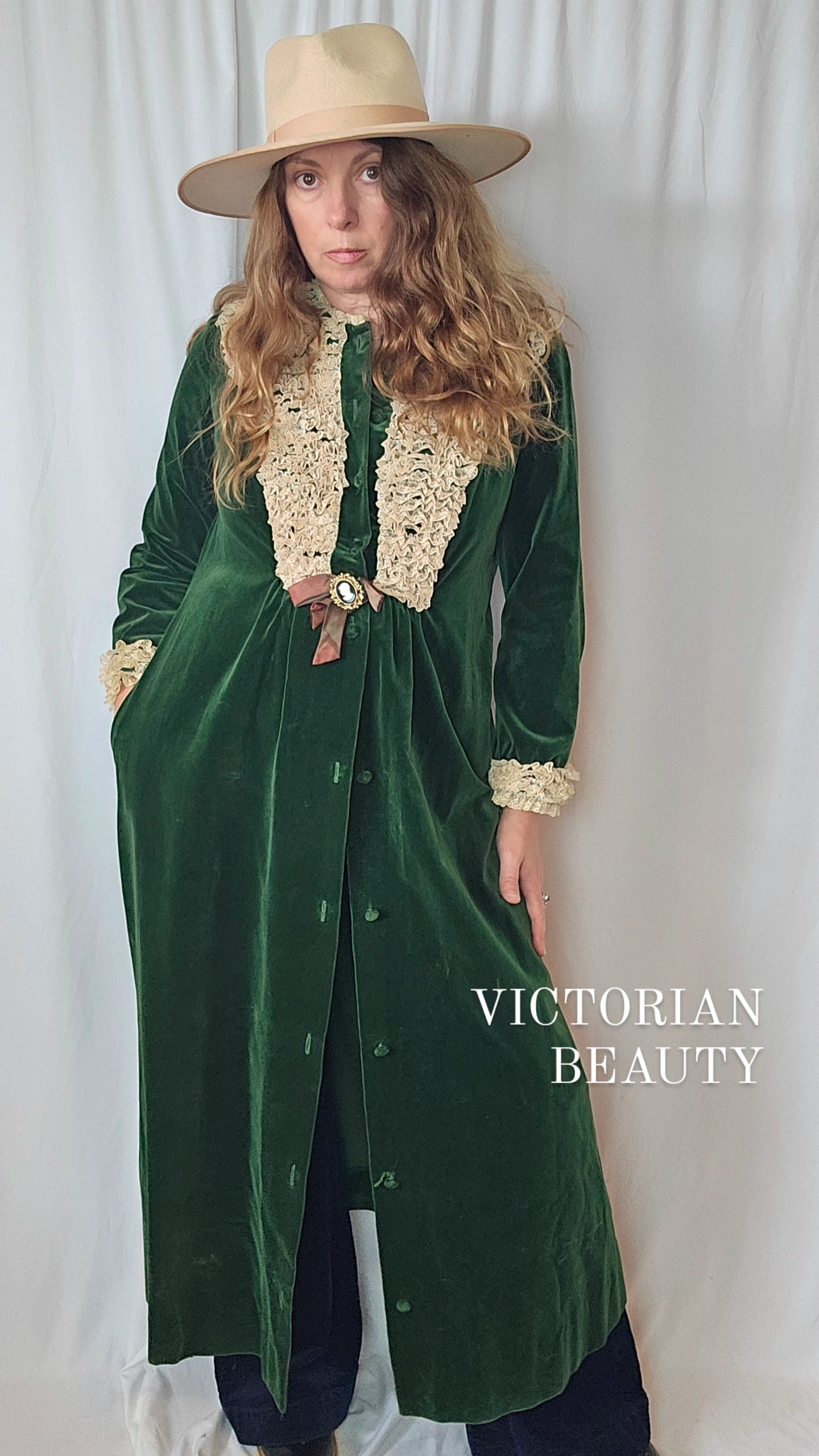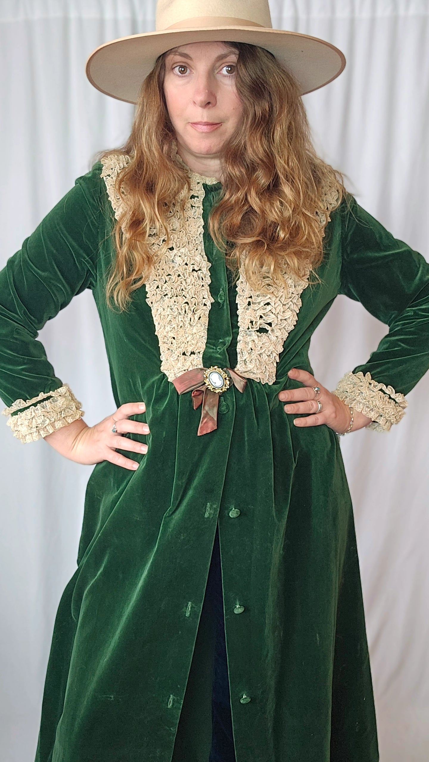 Romantic, theatrical, and dripping in vintage charm—this emerald green velvet duster from the 1970s captures the essence of Victorian elegance with its dramatic lace collar and cuffs. A statement piece that blurs the line between jacket and gown, finished with a detachable cameo brooch and ribbon detail.