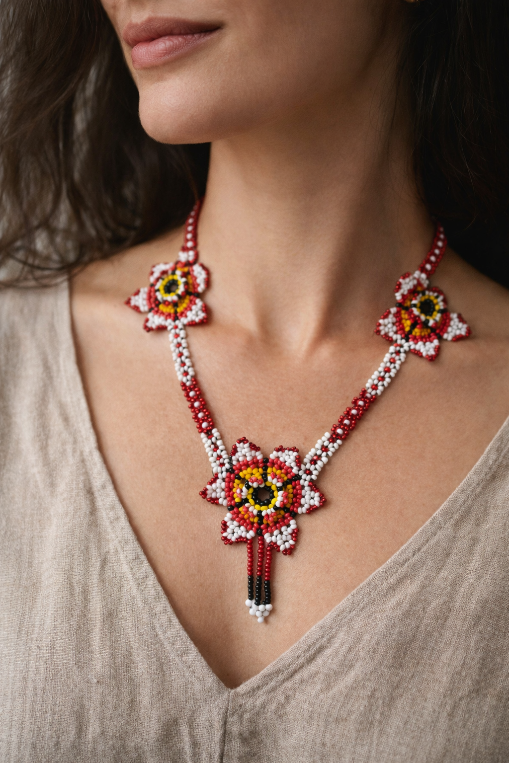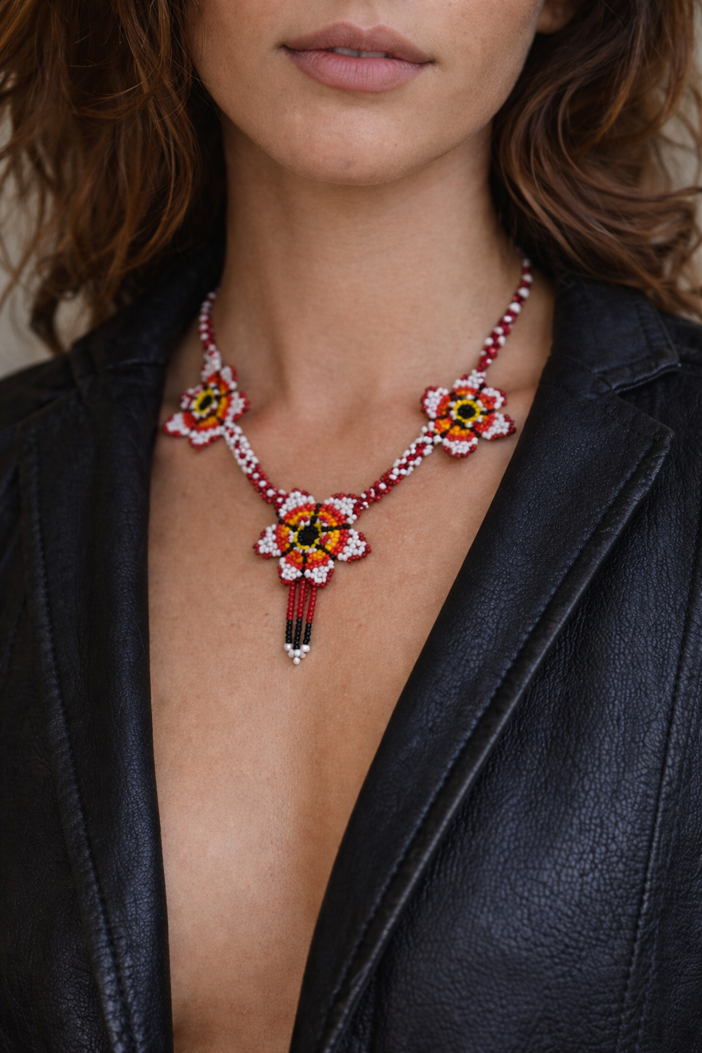 A striking vintage beaded necklace featuring bold floral motifs and intricate hand-beading throughout. Rich tones of red, white, yellow and black come together in a powerful, folk-inspired design that feels earthy, expressive and one of a kind.