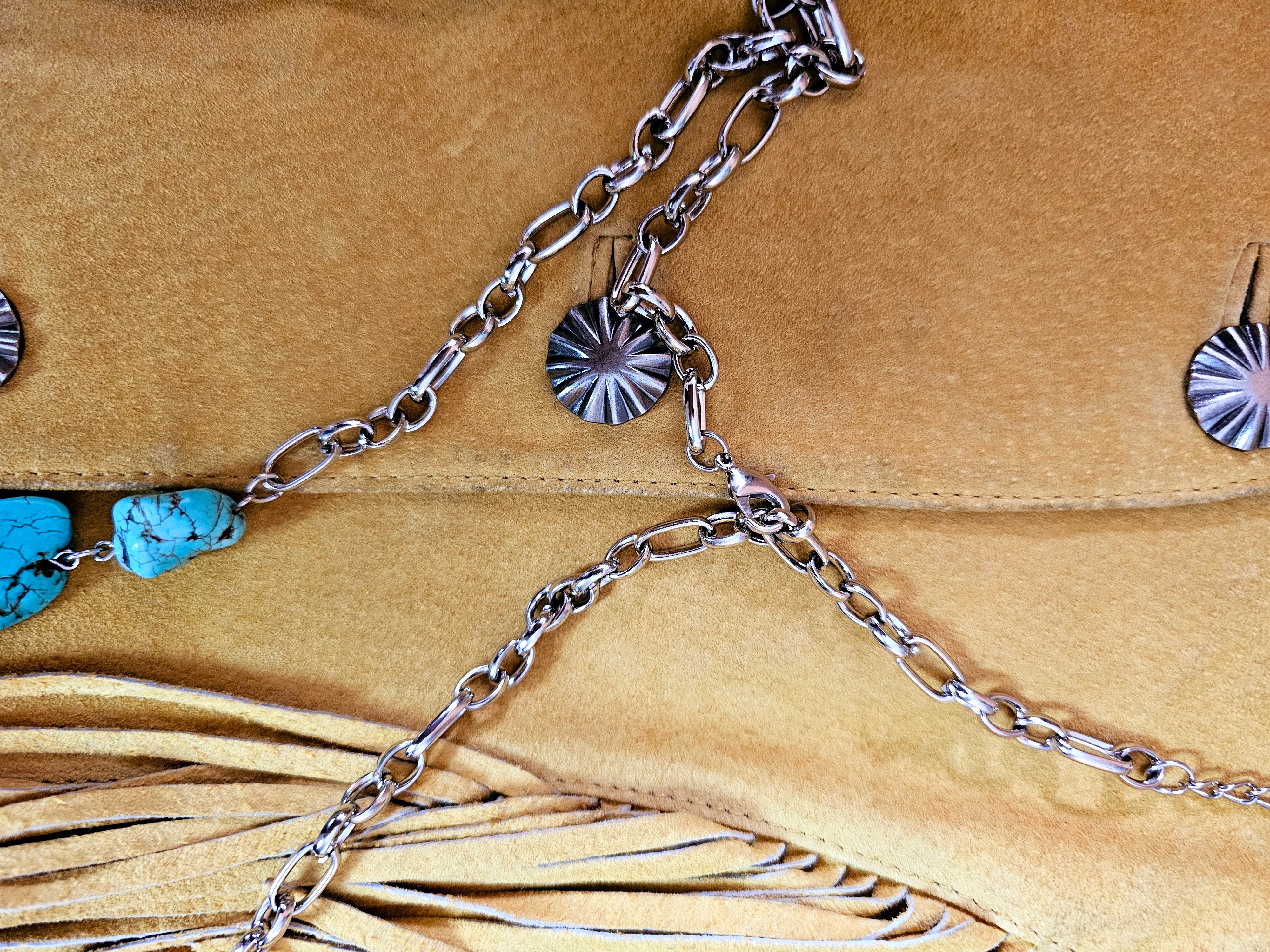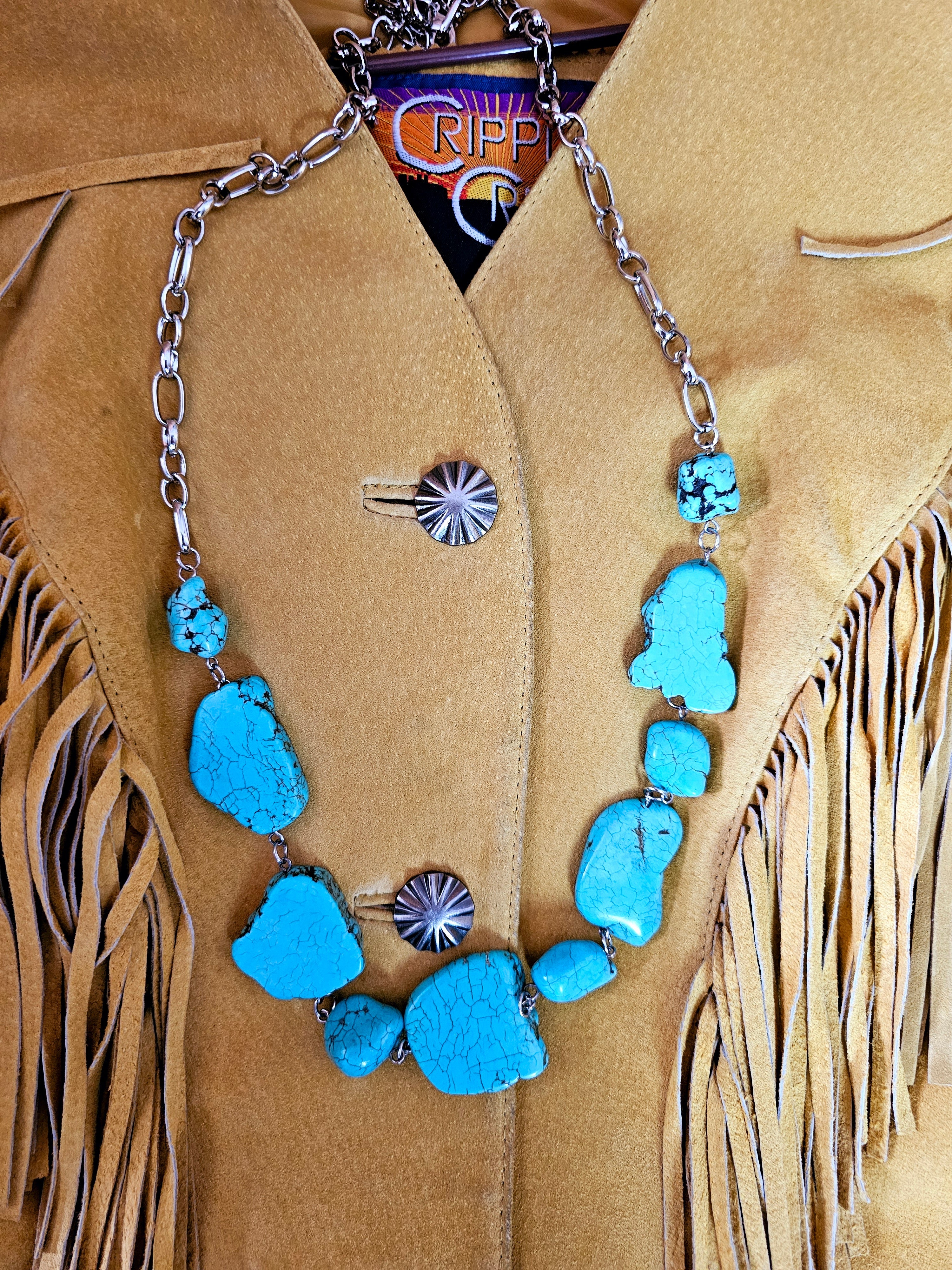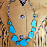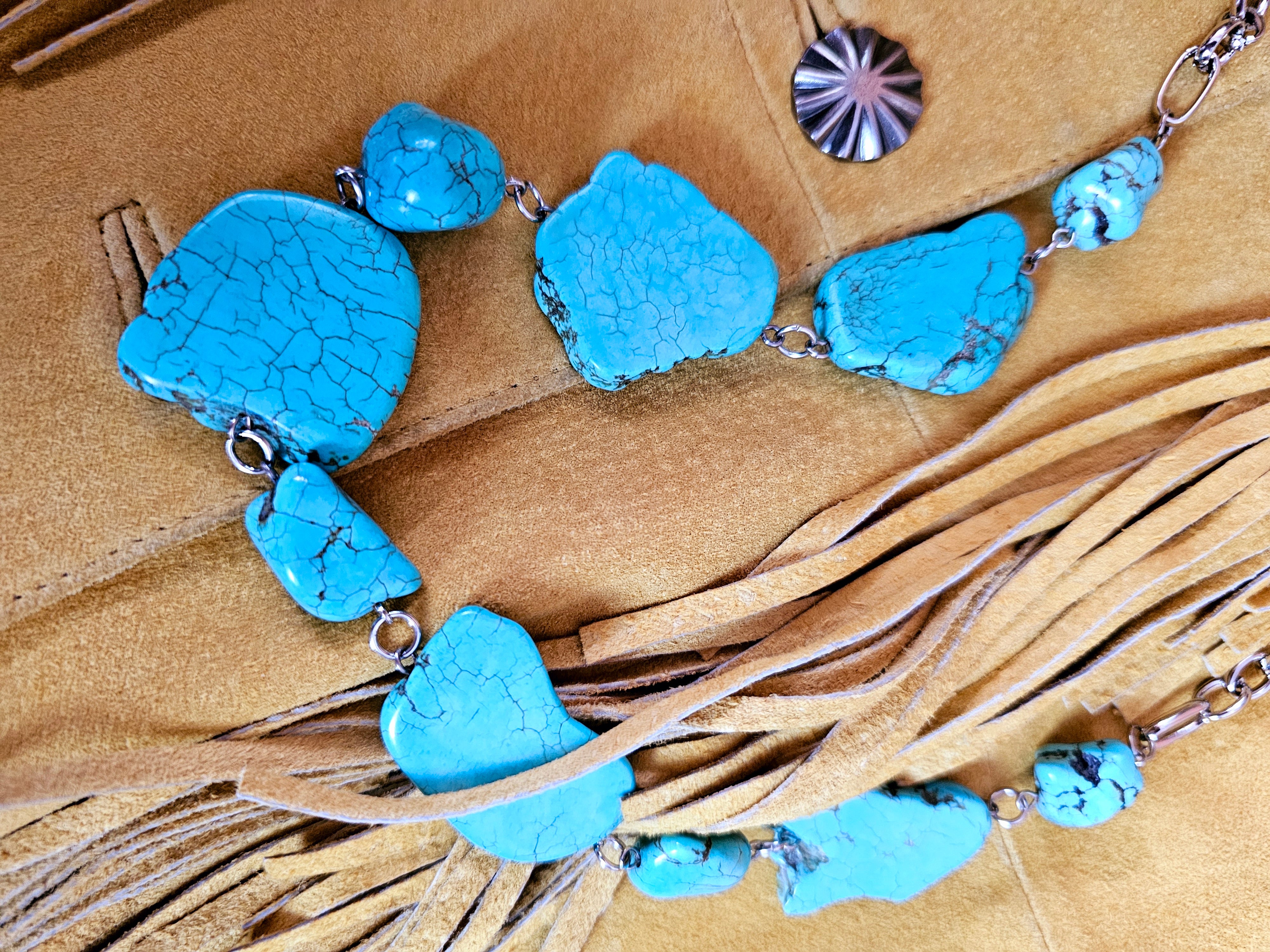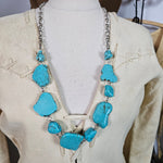This necklace features a striking faux turquoise design, composed of irregularly shaped stones with a natural, veined texture that mimics genuine turquoise. The stones are connected by silver-toned metal links, creating a bold and earthy statement piece. The necklace incorporates a sturdy chain with a lobster clasp for easy wear, and its design exudes a rustic, bohemian charm, perfect for complementing outfits with a Western or vintage aesthetic.