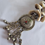 • Pendant Details: The large circular pendant is crafted in mixed tribal alloy with intricate hand-stamped patterns, a small red glass stone at its centre, and a cascade of chain tassels ending in bells. This style of pendant is typical of nomadic jewellery traditions, designed not only to adorn but also to create sound and presence when worn.