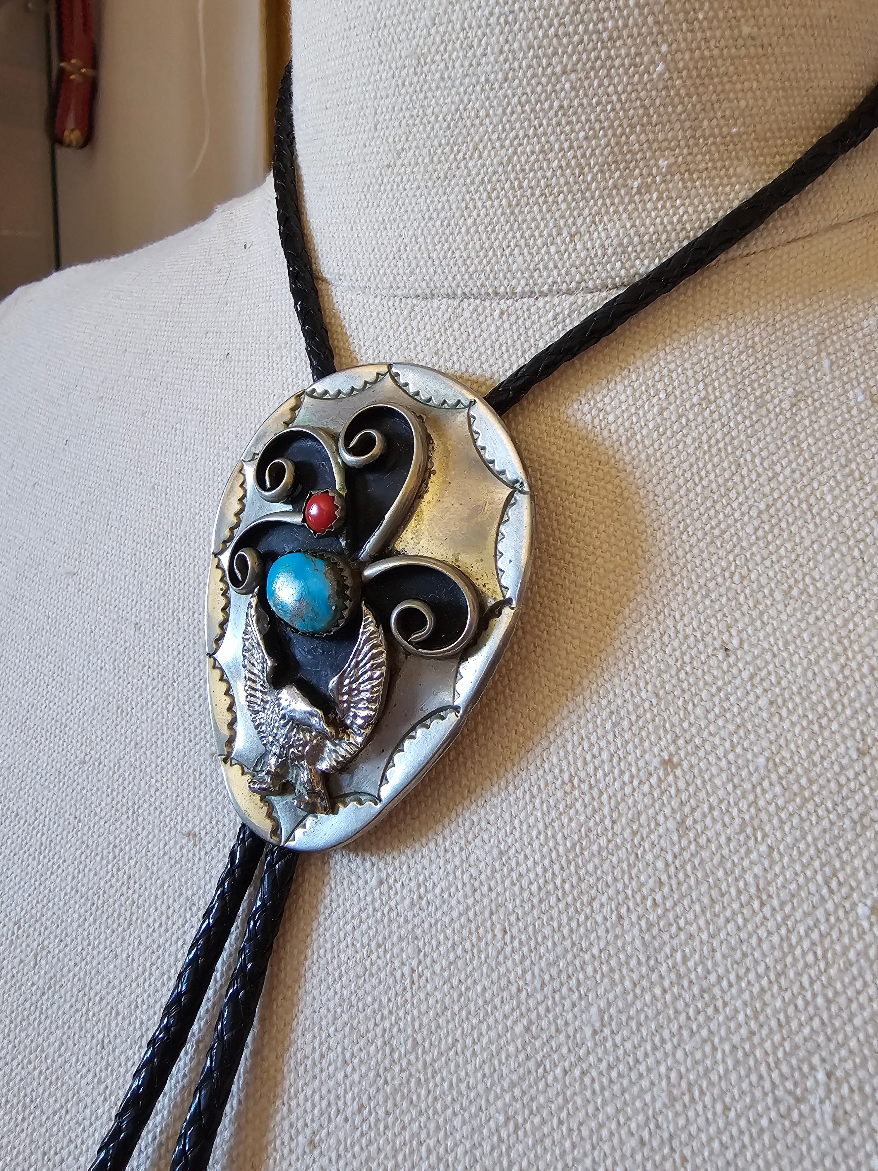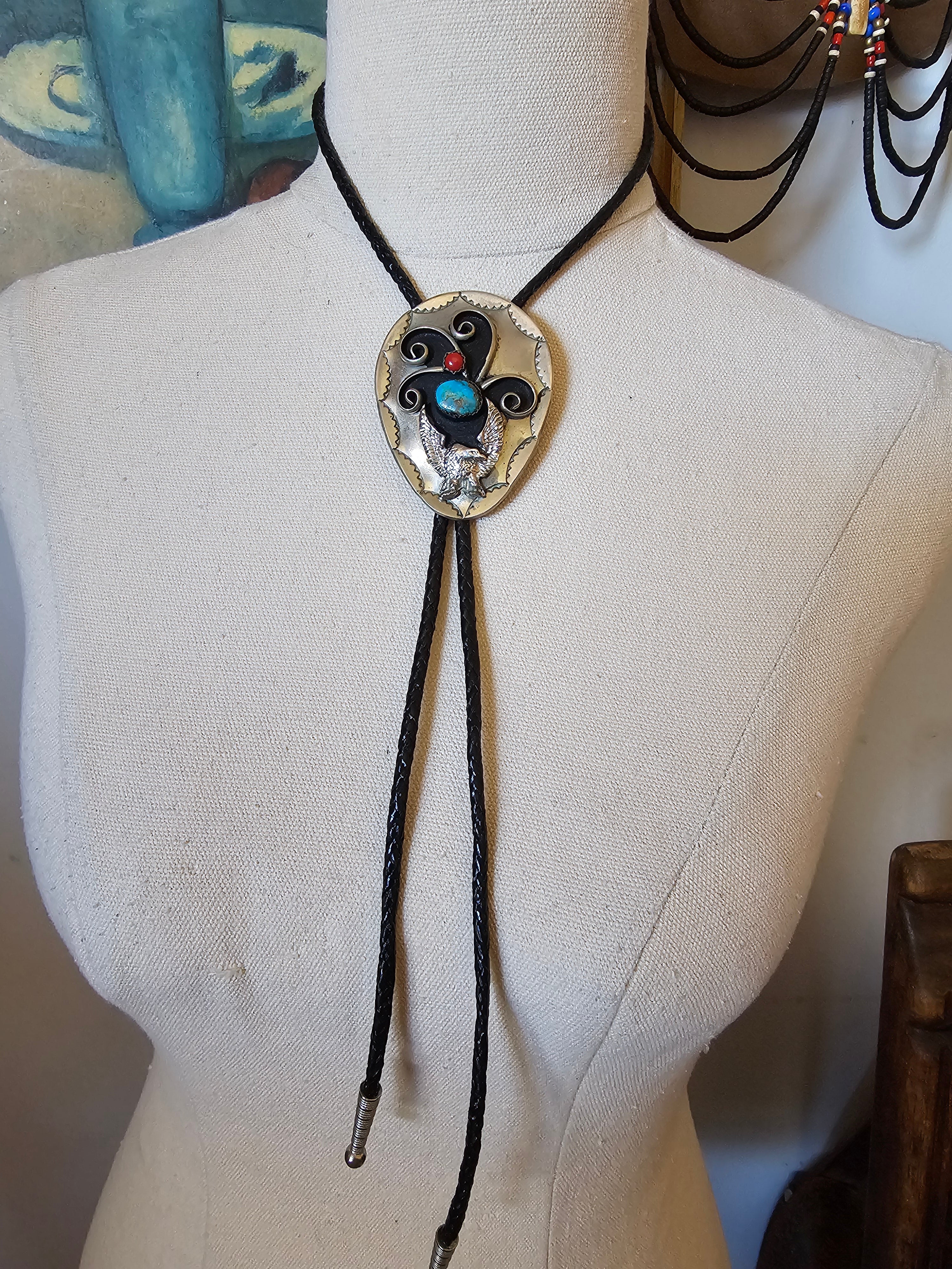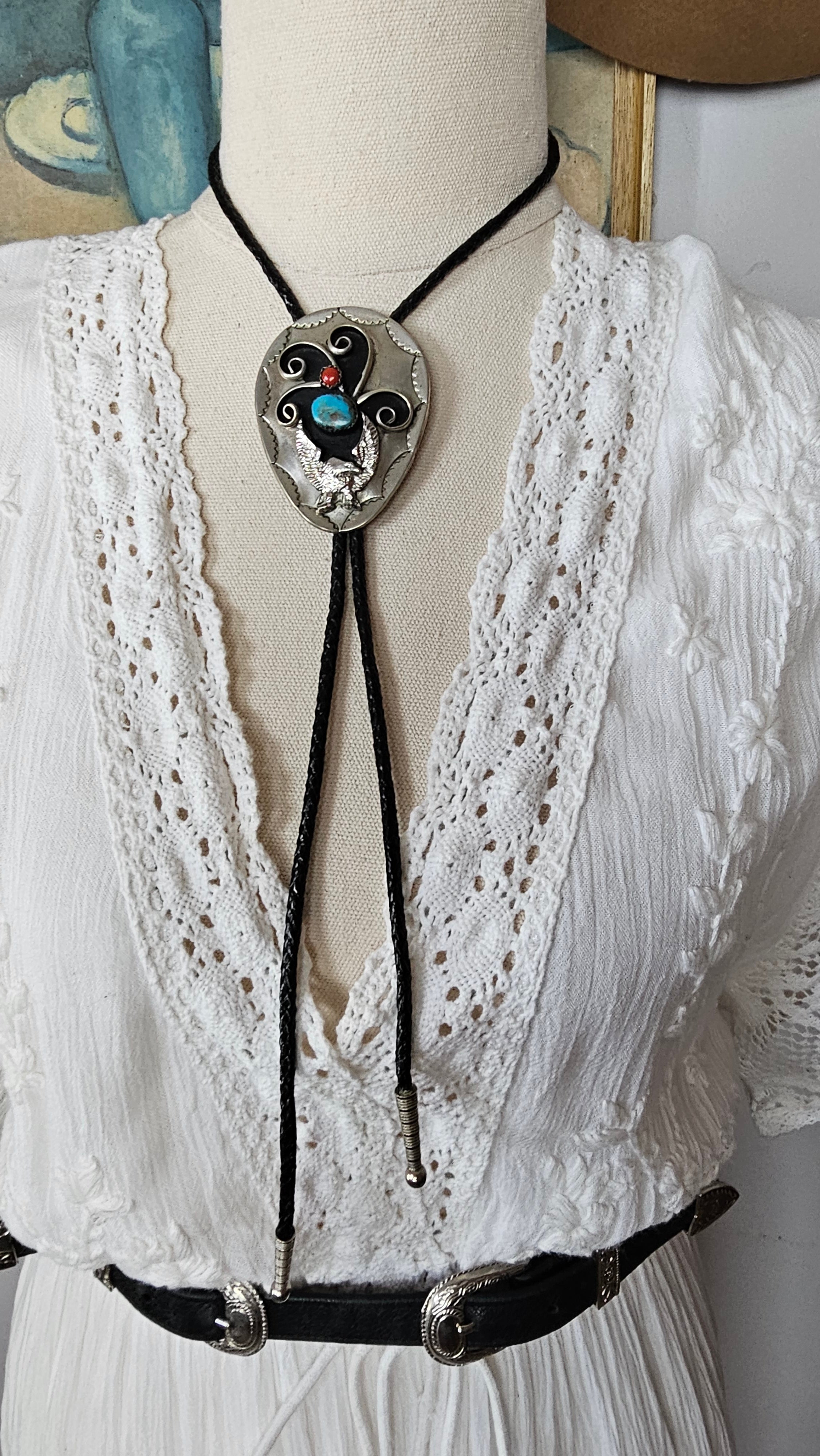 Vintage Navajo Silver Bolo Tie – Eagle, Turquoise & Coral