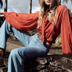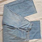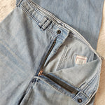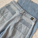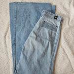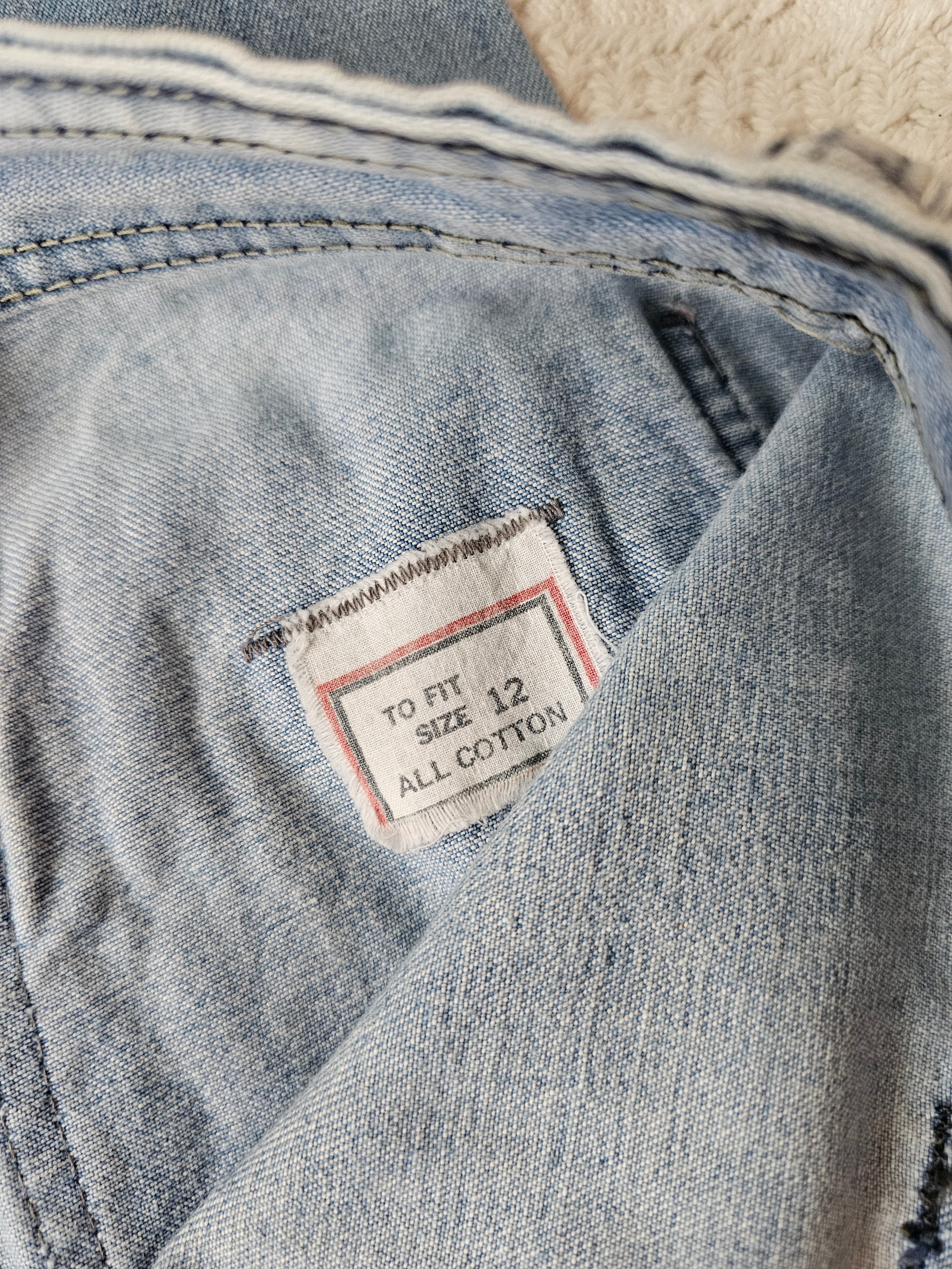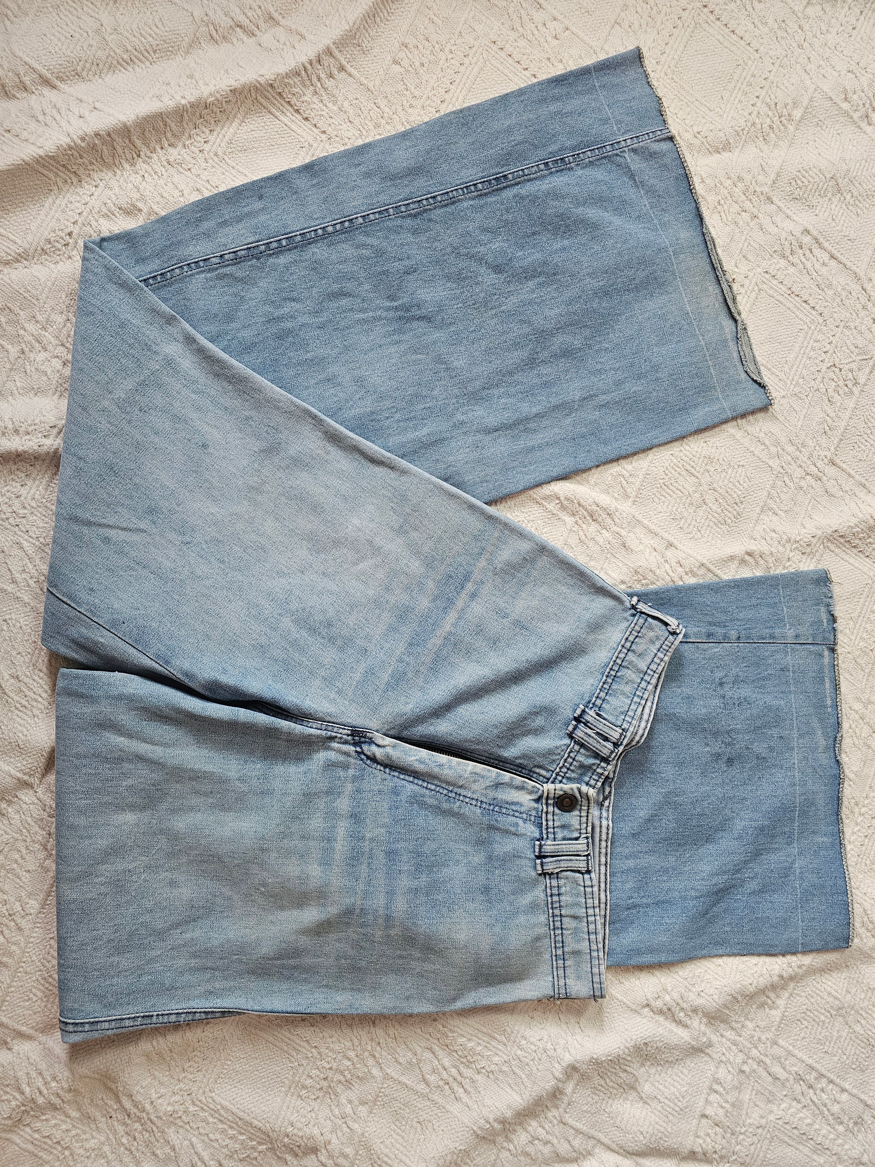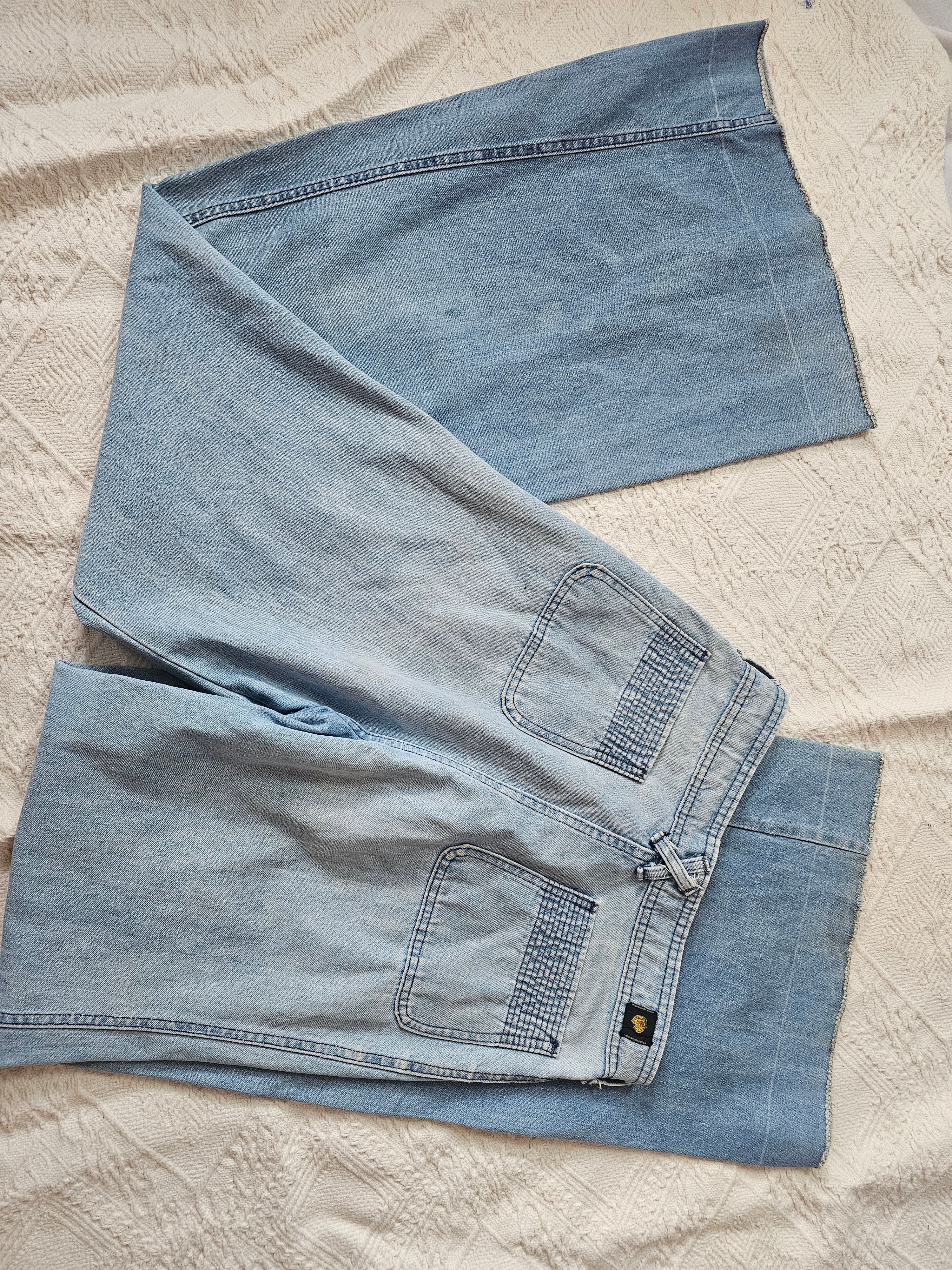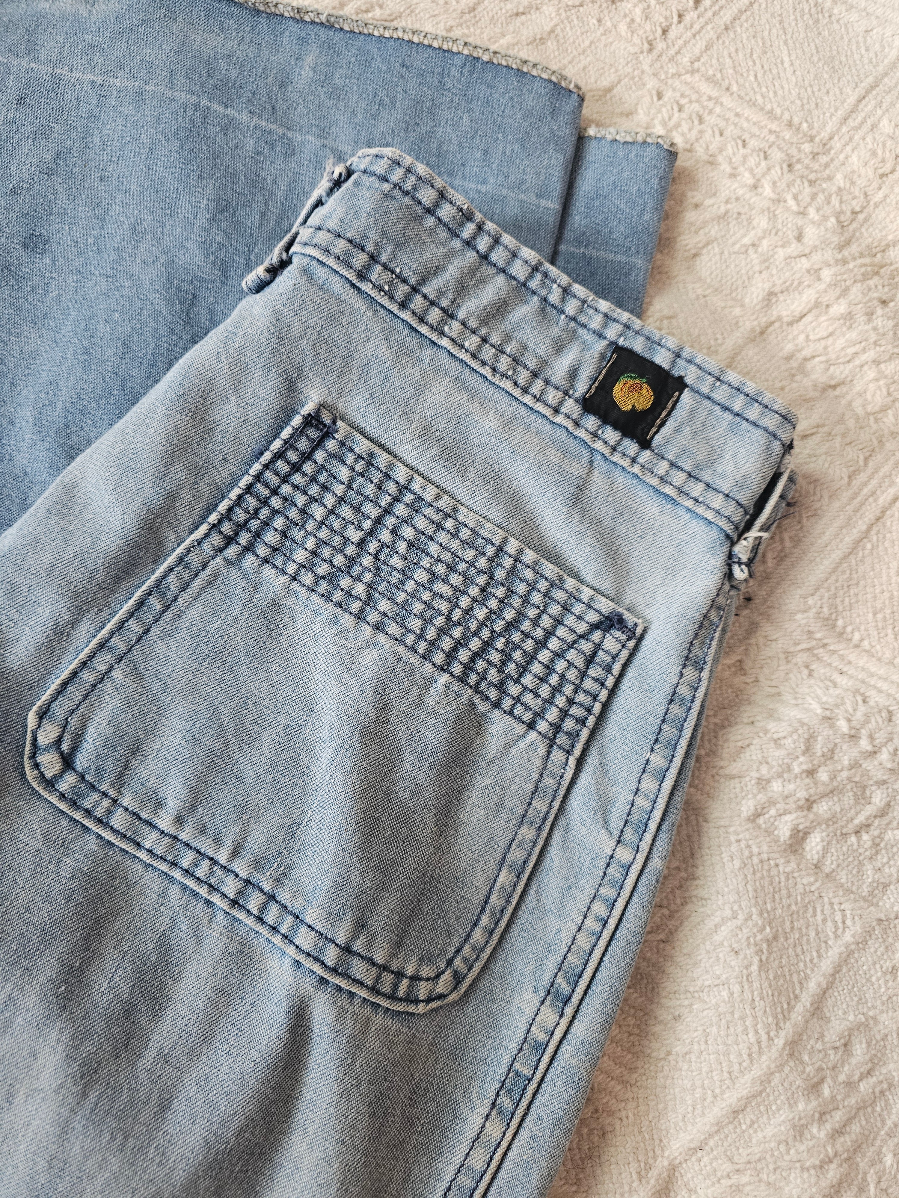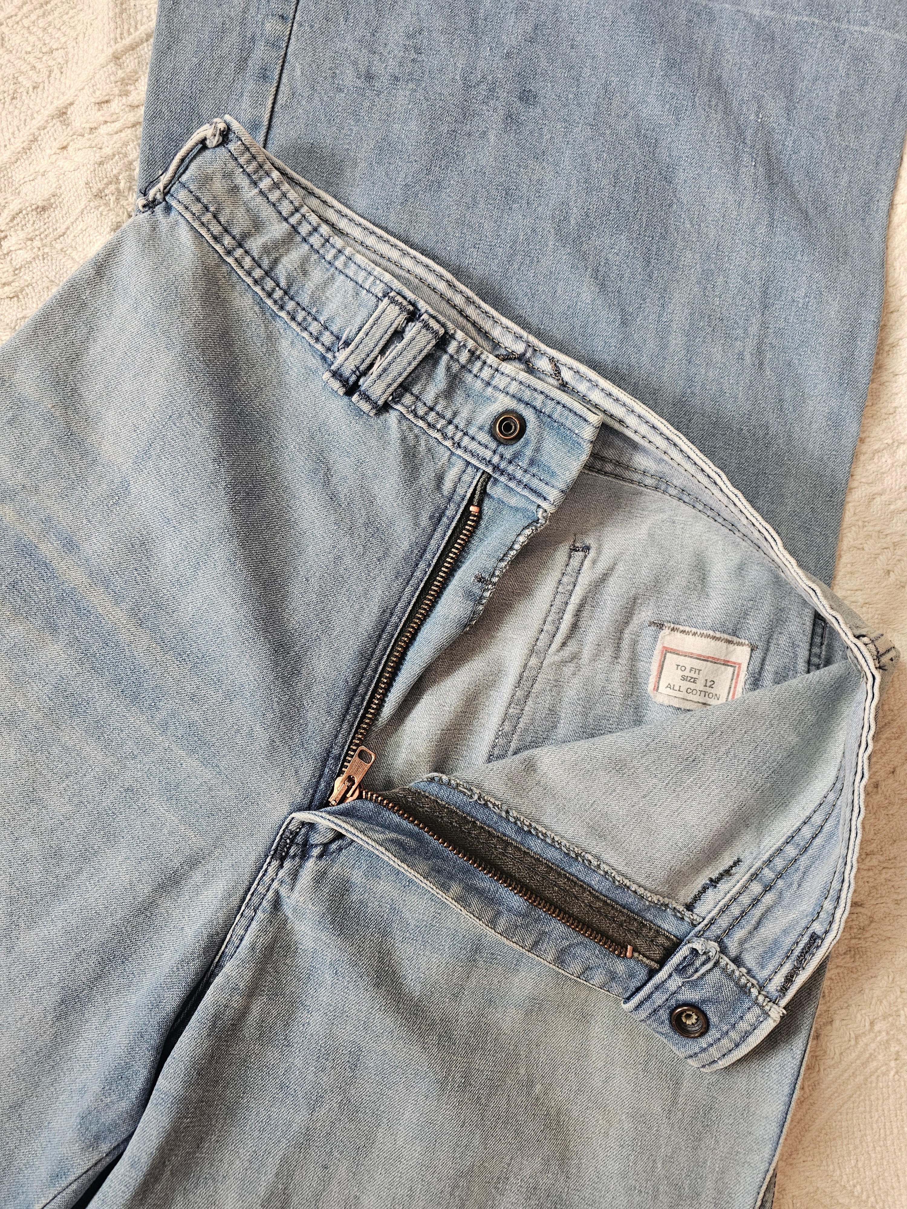 Rare and iconic 70s fashion with our Genuine Vintage 70s Peach high waisted flares! Crafted from comfortable cotton with slight stretch, these flared bell bottom jeans feature a high waisted crotch rise and measure at 75cm waist and 115cm leg length. Seen on Fleetwood mac, these jeans are truly amazing, with a size tag of 12 but fit more like 8