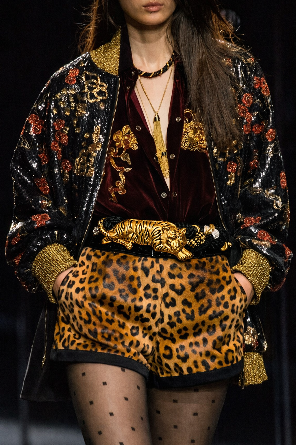Gold and black belt with tiger design on a mannequin against a white background