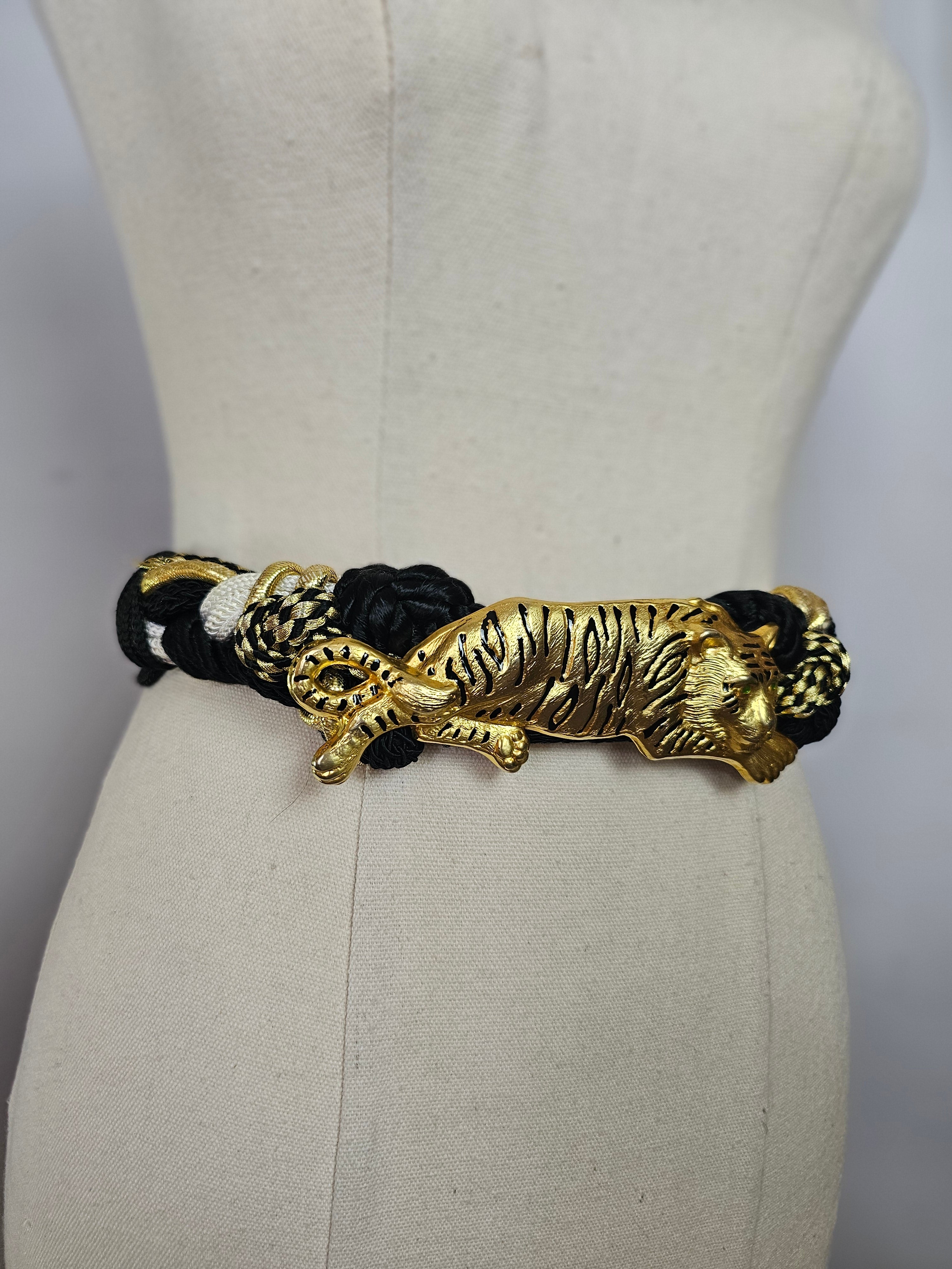 This vintage tiger belt captures that spirit perfectly. The centrepiece features a powerful tiger motif finished in rich gold plating, with vivid green eyes that bring the design to life. Fierce yet elegant, the tiger symbolises strength, independence and fearless style — a motif often embraced in high-fashion jewellery and accessories throughout the late 70s and 80s.