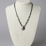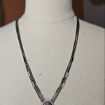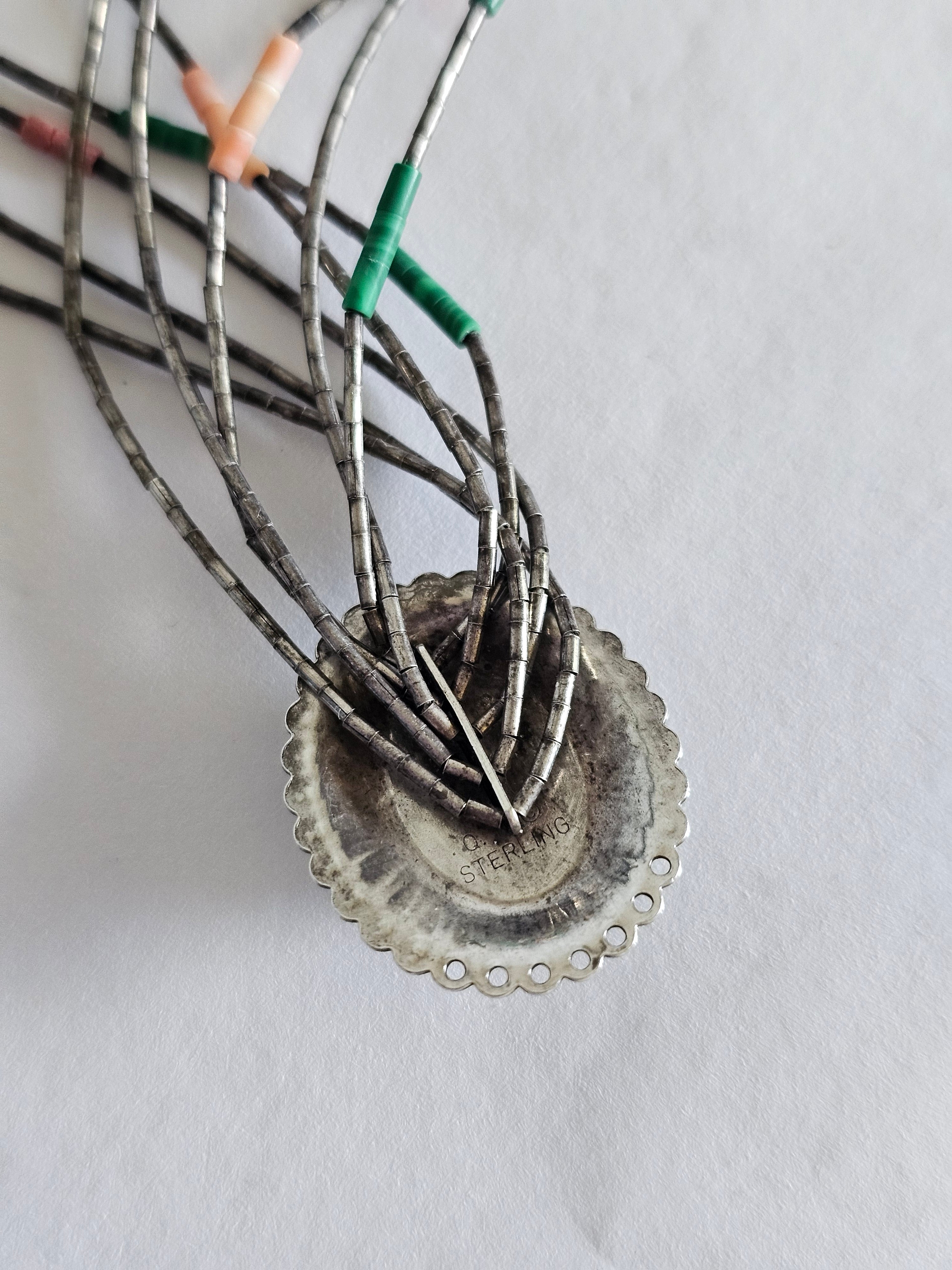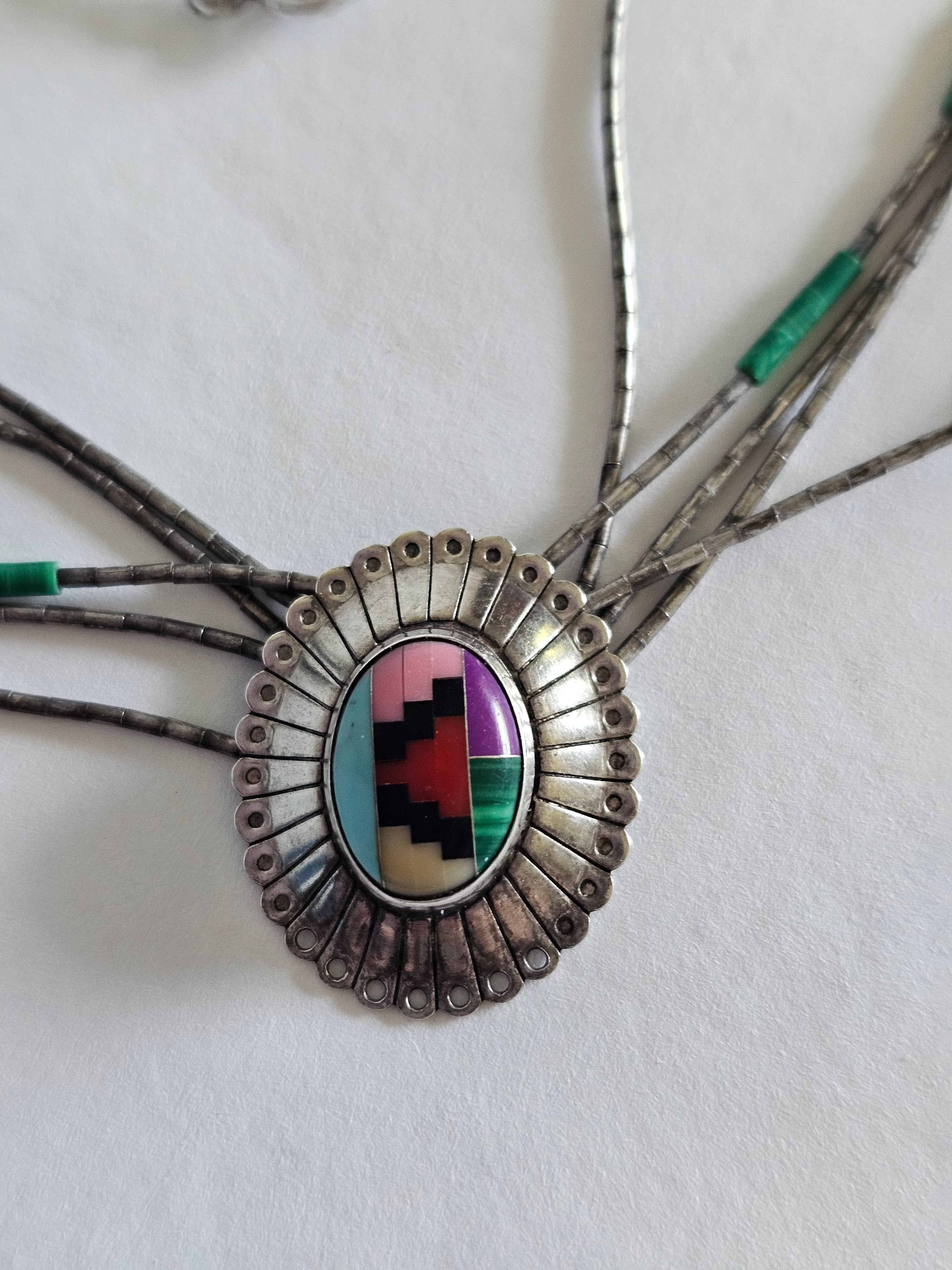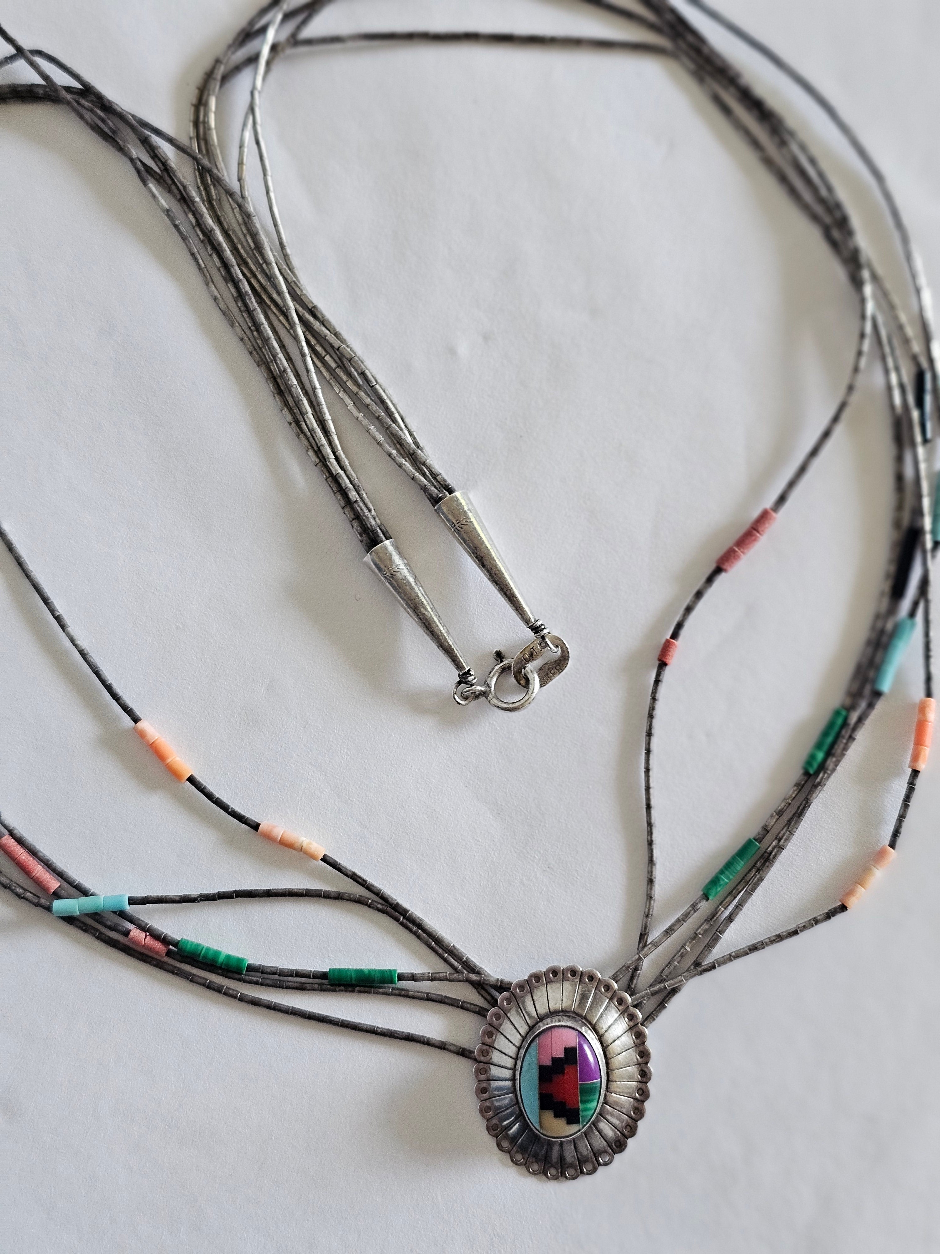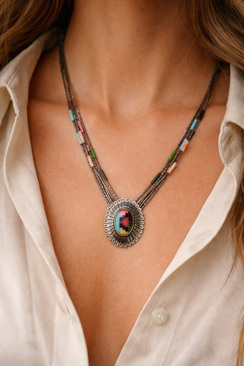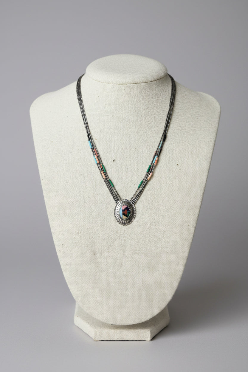 A beautiful piece of Native American artistry, this handcrafted inlay necklace captures the bold geometry and earthy tones traditional to Southwestern jewellery. The striking centre pendant features a vibrant geometric inlay of turquoise, coral, jet and cream stone set within a polished sterling silver sunburst frame. Multiple strands of traditional heishi-style beads complete the piece, creating a layered, authentic look that sits beautifully along the neckline.