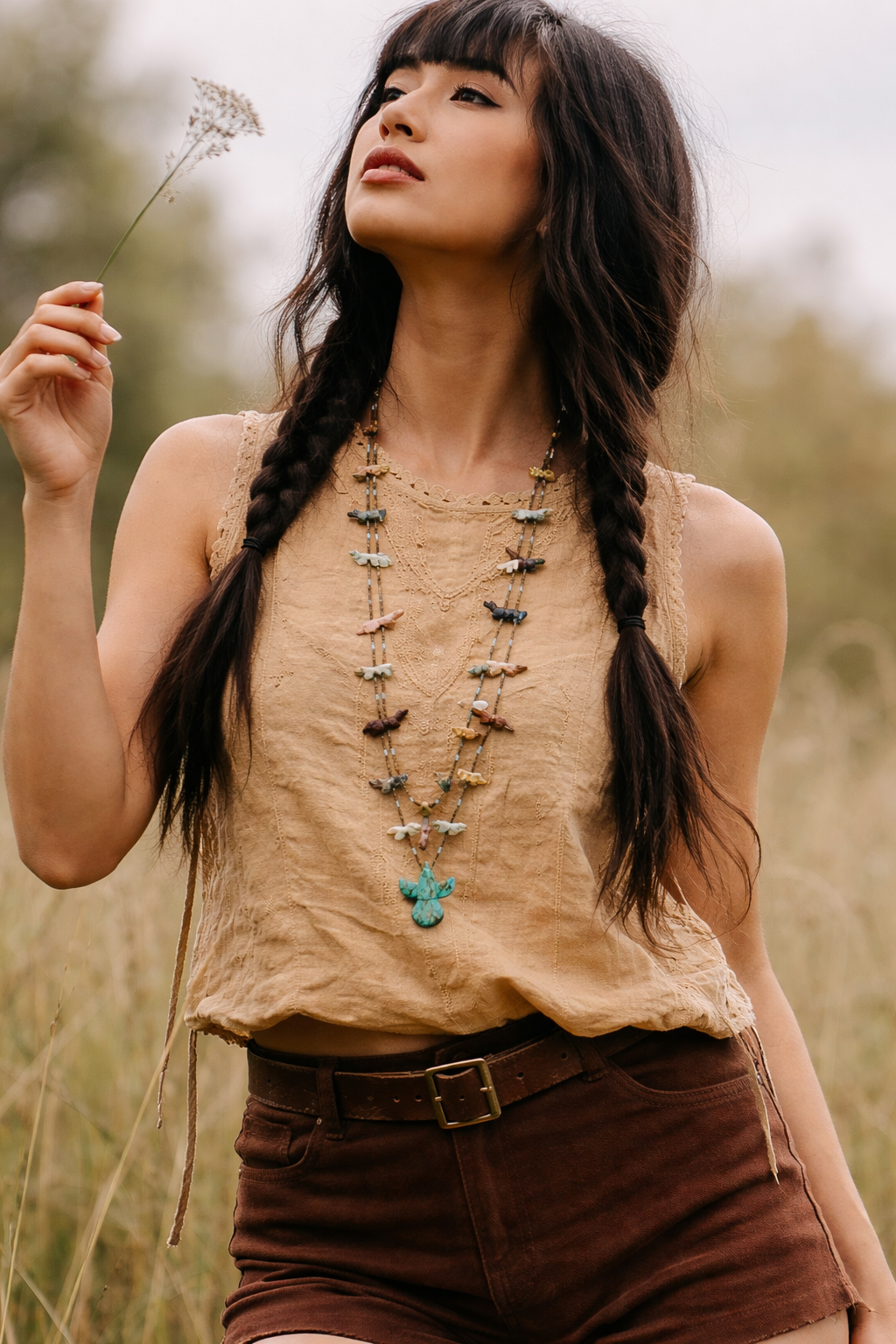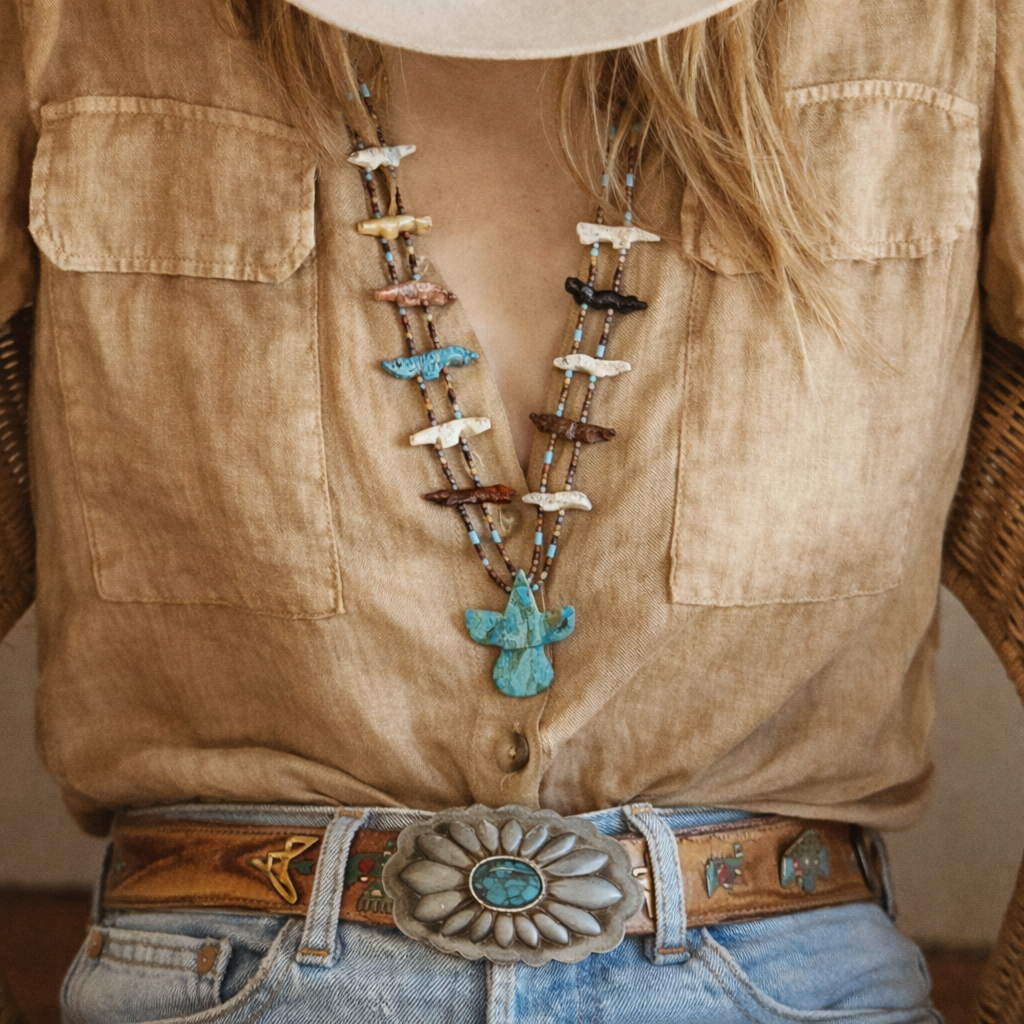 A beautiful piece of Southwest artistry, this hand-carved Zuni fetish necklace tells a story of tradition, symbolism, and craftsmanship. Each tiny animal figure is carefully carved from natural stone and strung along two delicate strands, creating a layered piece rich with meaning and texture. At the centre sits a striking turquoise Thunderbird, a powerful symbol in Native American culture representing strength, protection, and the spirit of the sky.