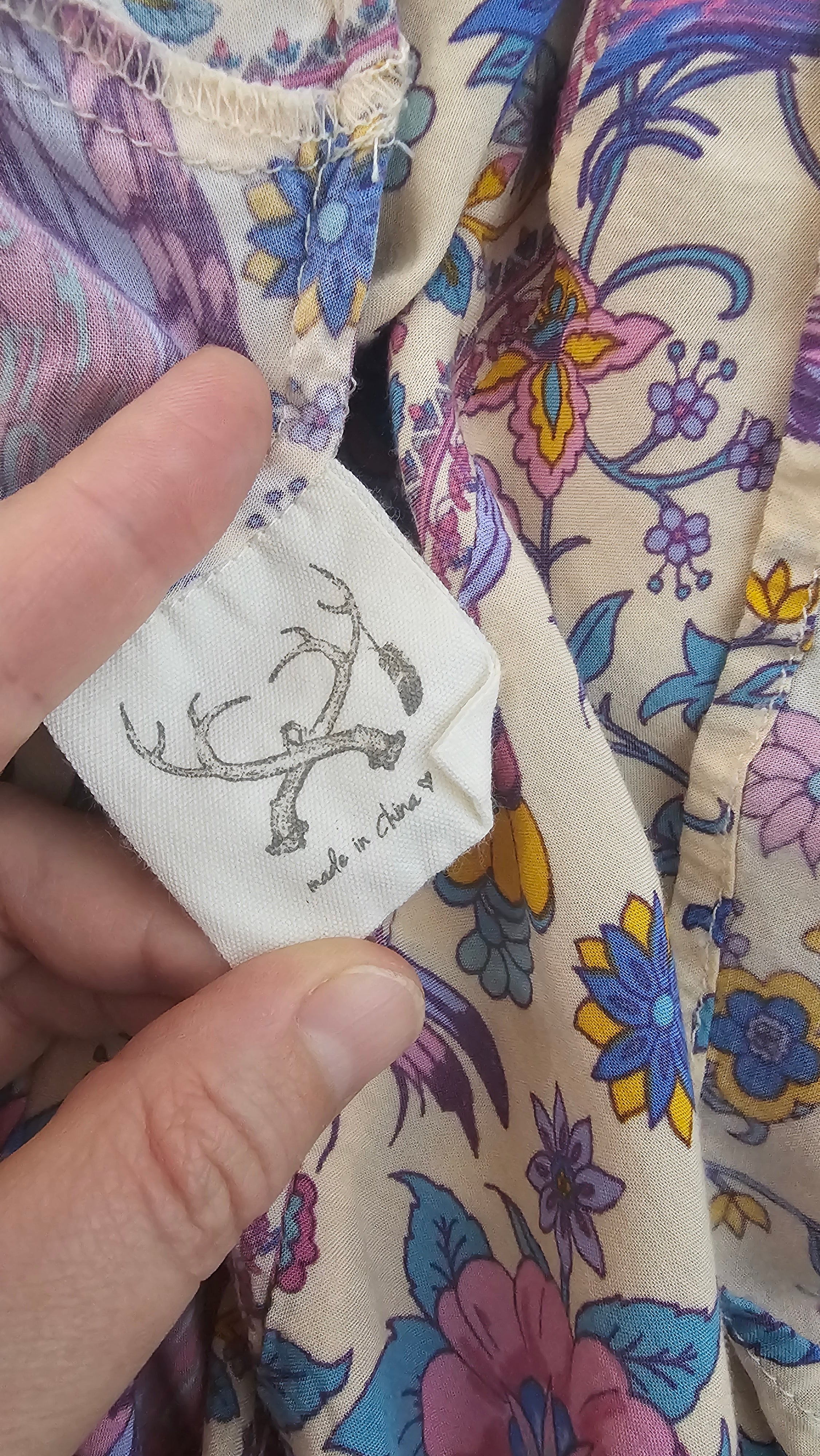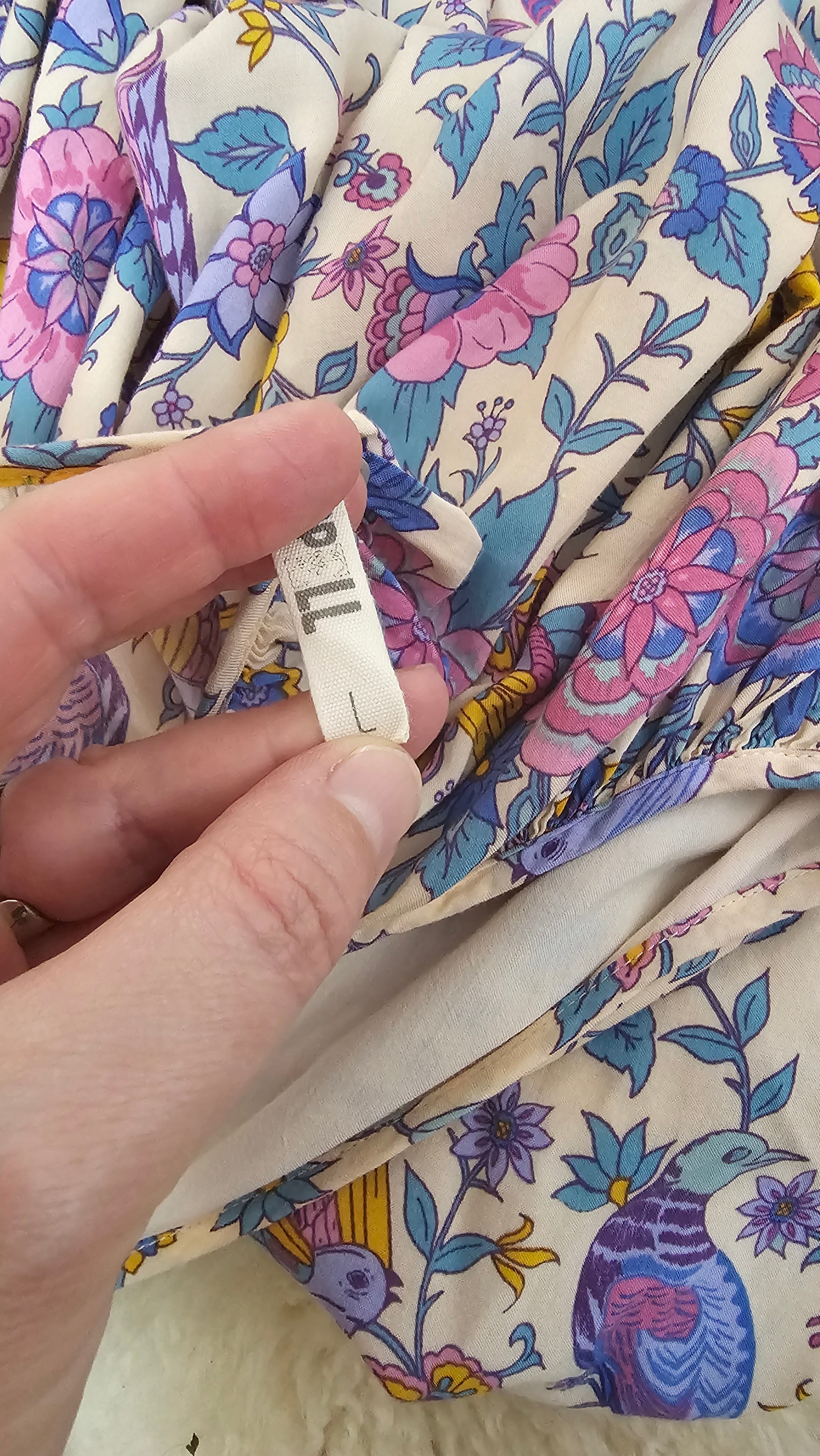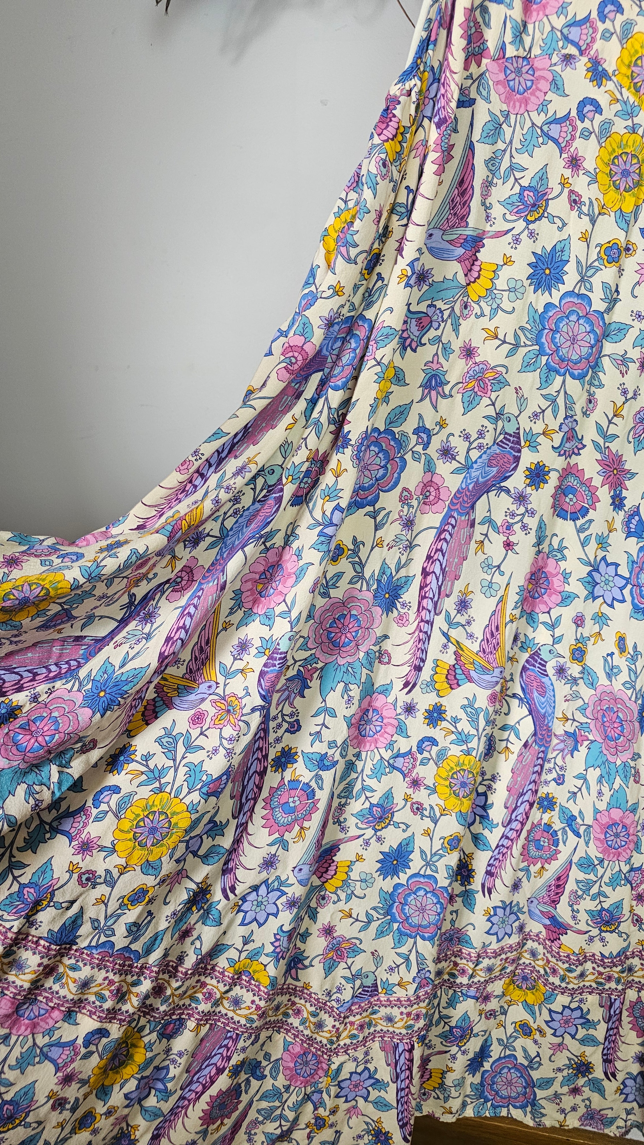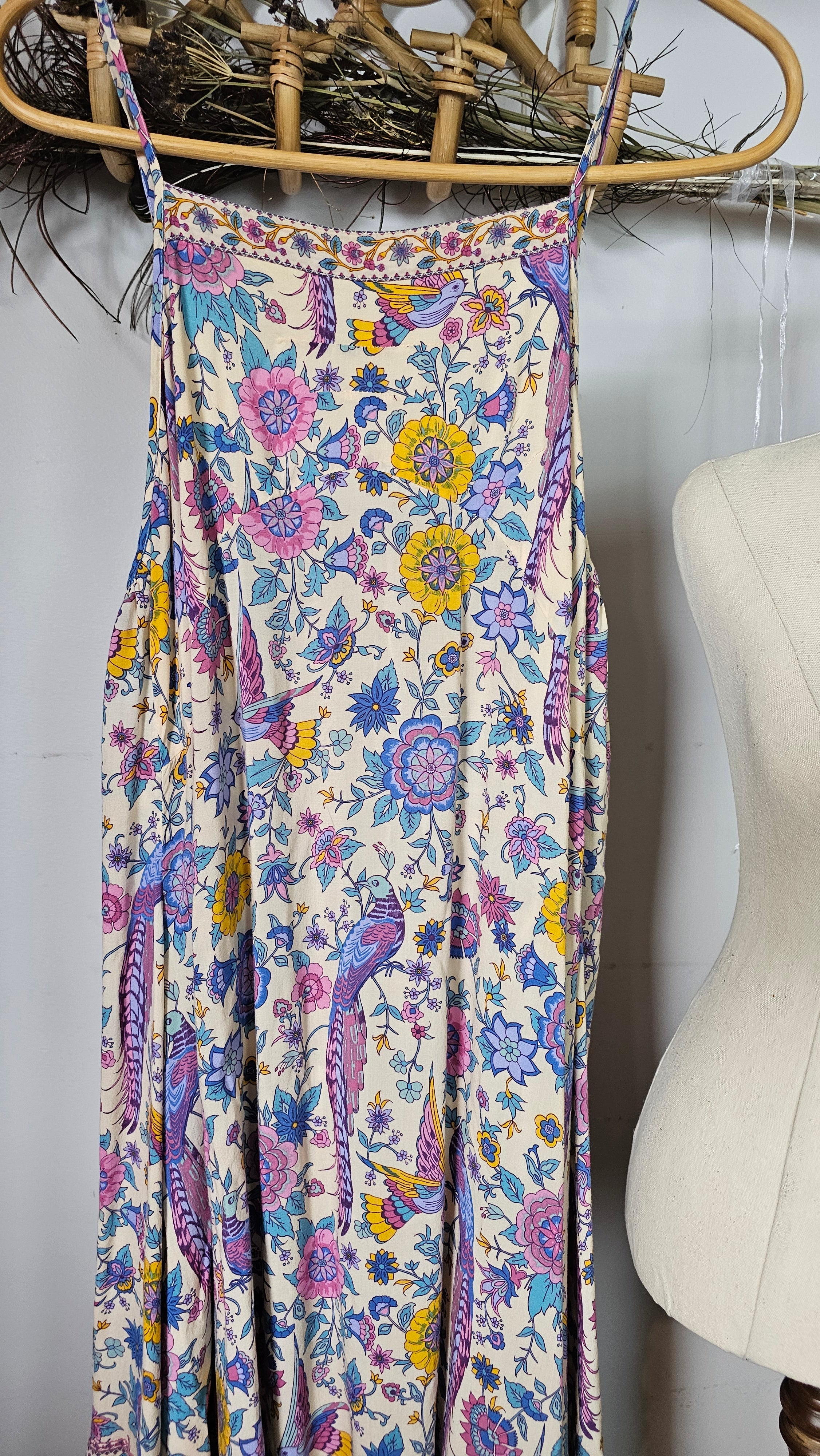 From Spell’s iconic Lovebird 2016 collection, this unforgettable collector piece captures the true free-spirit era of the brand – the hand-drawn floral and peacock print made famous in the Santorini campaign. Floaty, romantic and instantly recognisable, this is the kind of archival Spell that rarely surfaces.