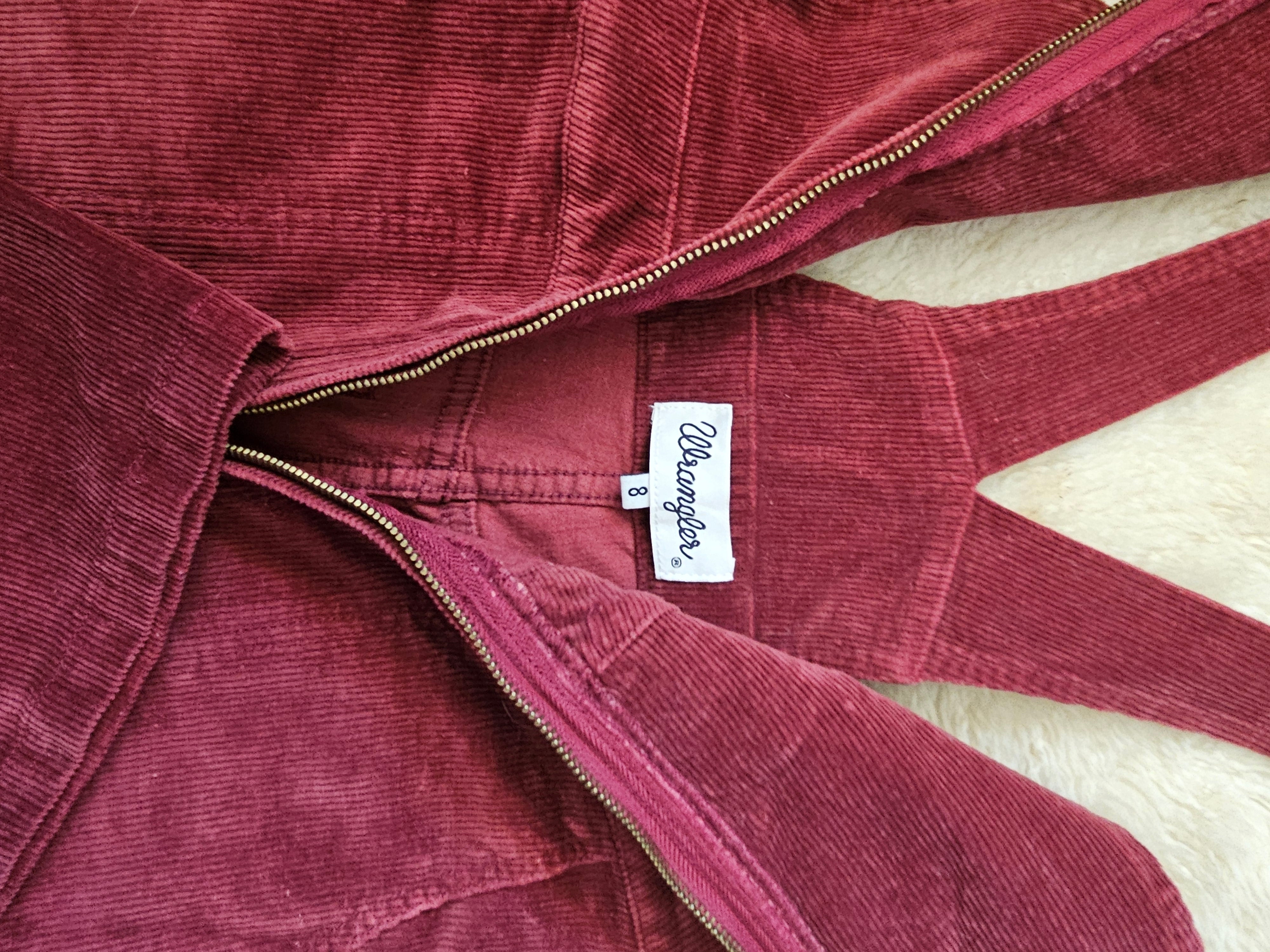 Deep berry corduroy overalls with that true vintage-meets-Western Wrangler vibe. Soft stretch through the waistband and a flattering high waist cut.