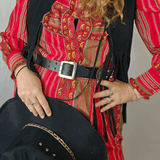 Sits beautifully on waists or hips, fastening securely with a square silver buckle. Perfect for cinching prairie dresses or adding fire to denim—this one’s not just worn, it’s lived.