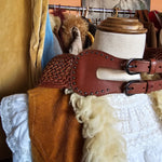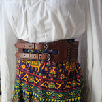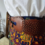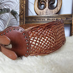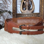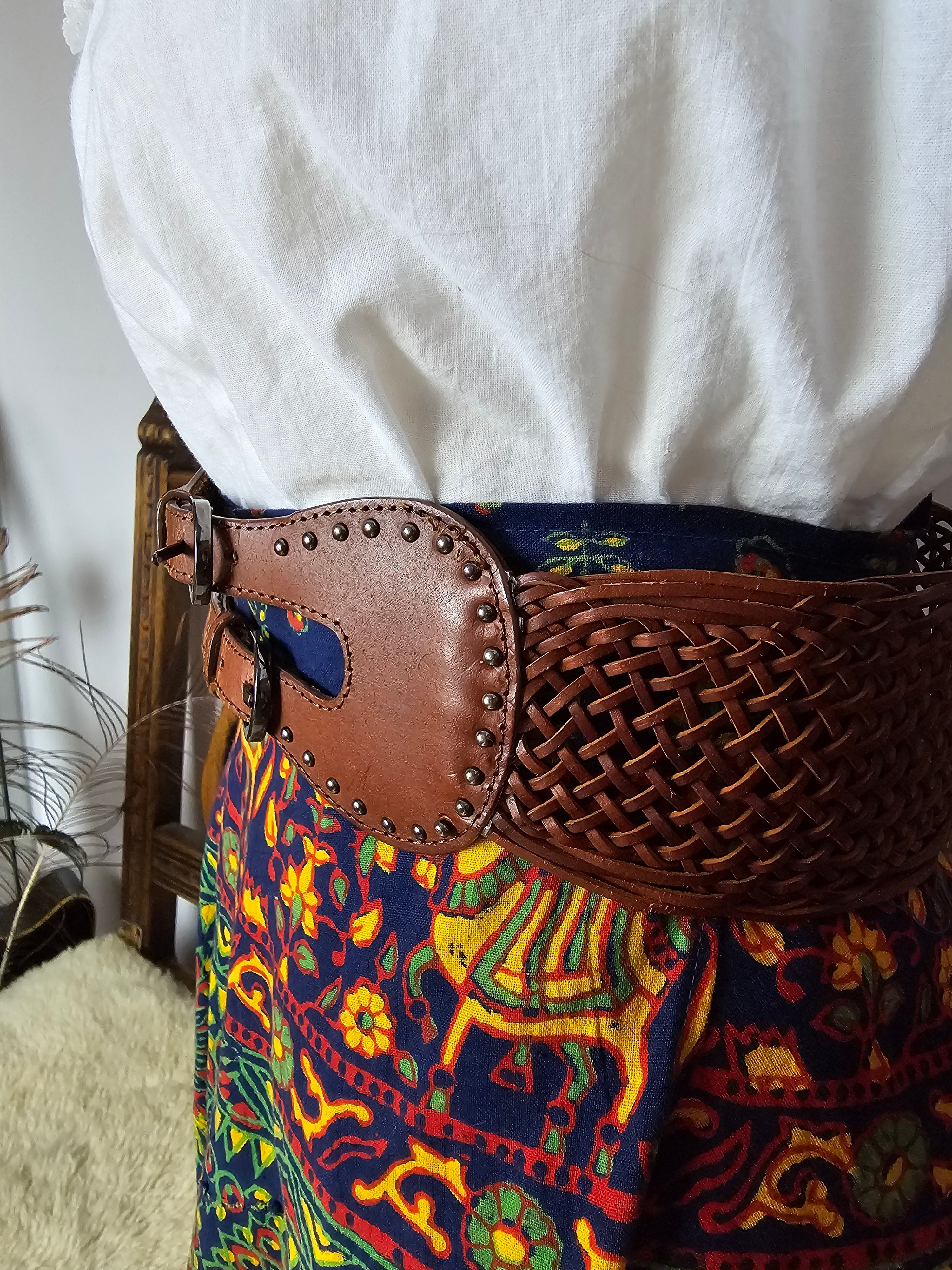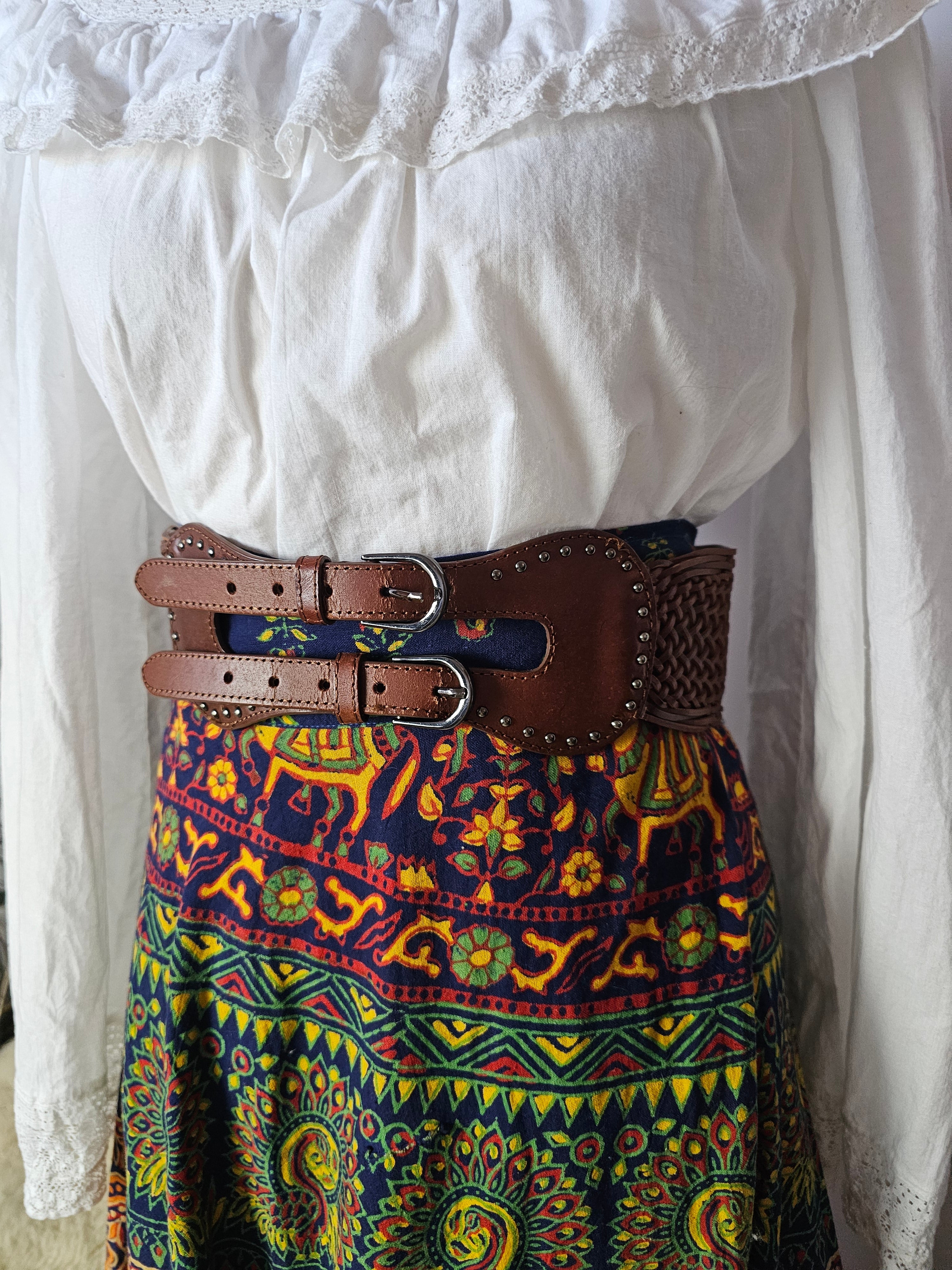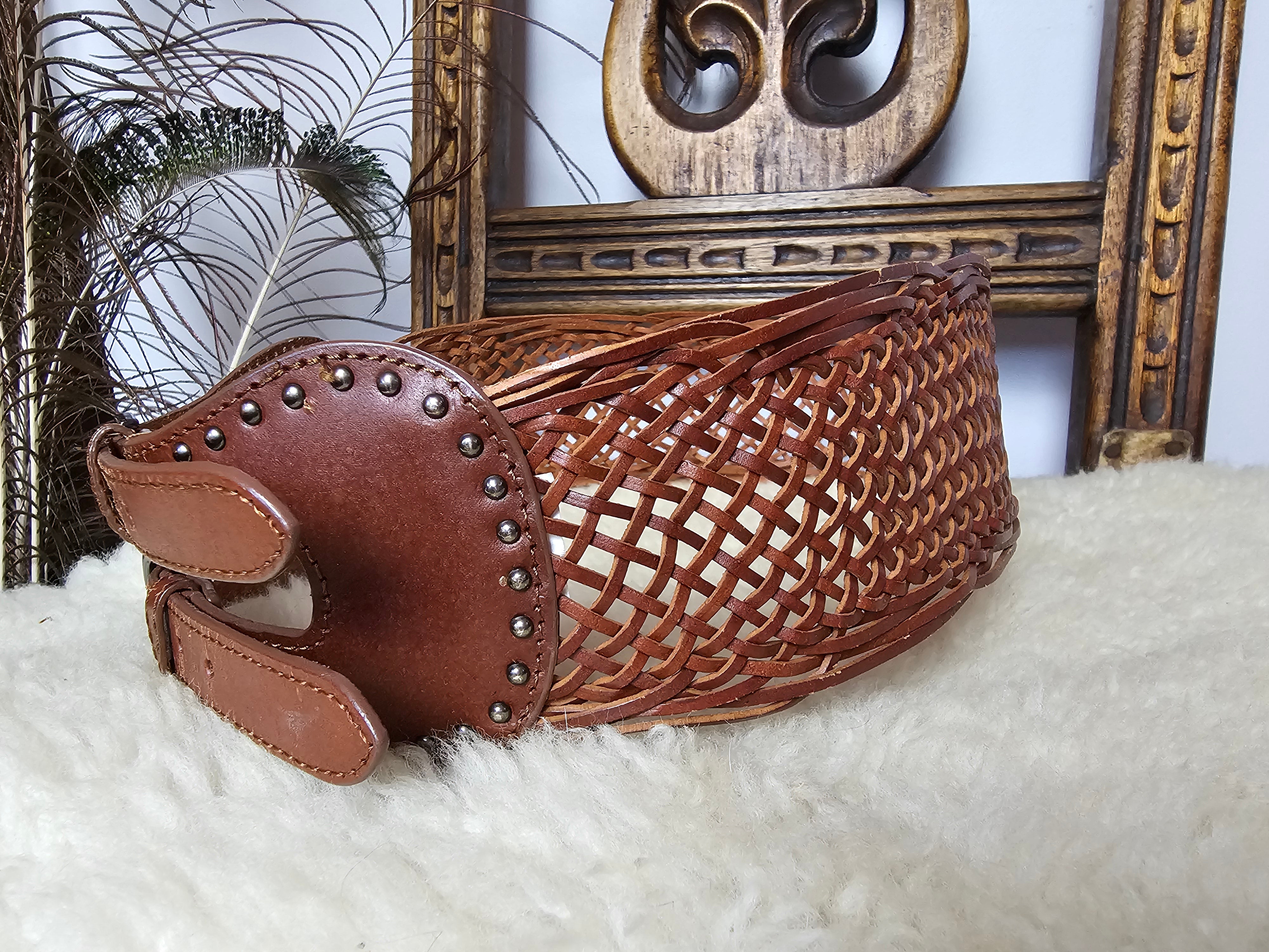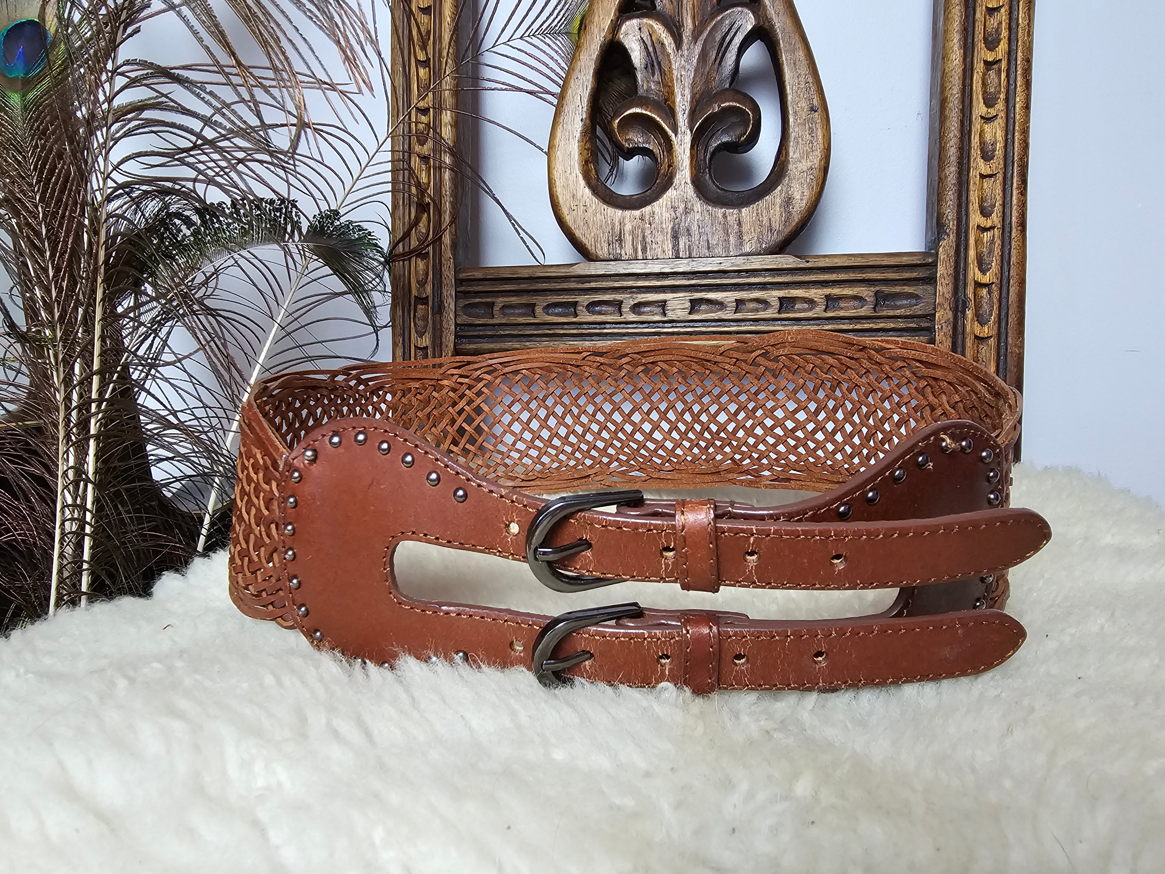 Beautifully boho with a Western twist — this wide vintage belt is made from genuine woven leather and features a unique double buckle front and silver-tone stud accents. The intricate basket weave hugs your waist perfectly, adding texture and shape to flowy dresses or oversized shirts. A rare find with loads of styling potential.