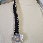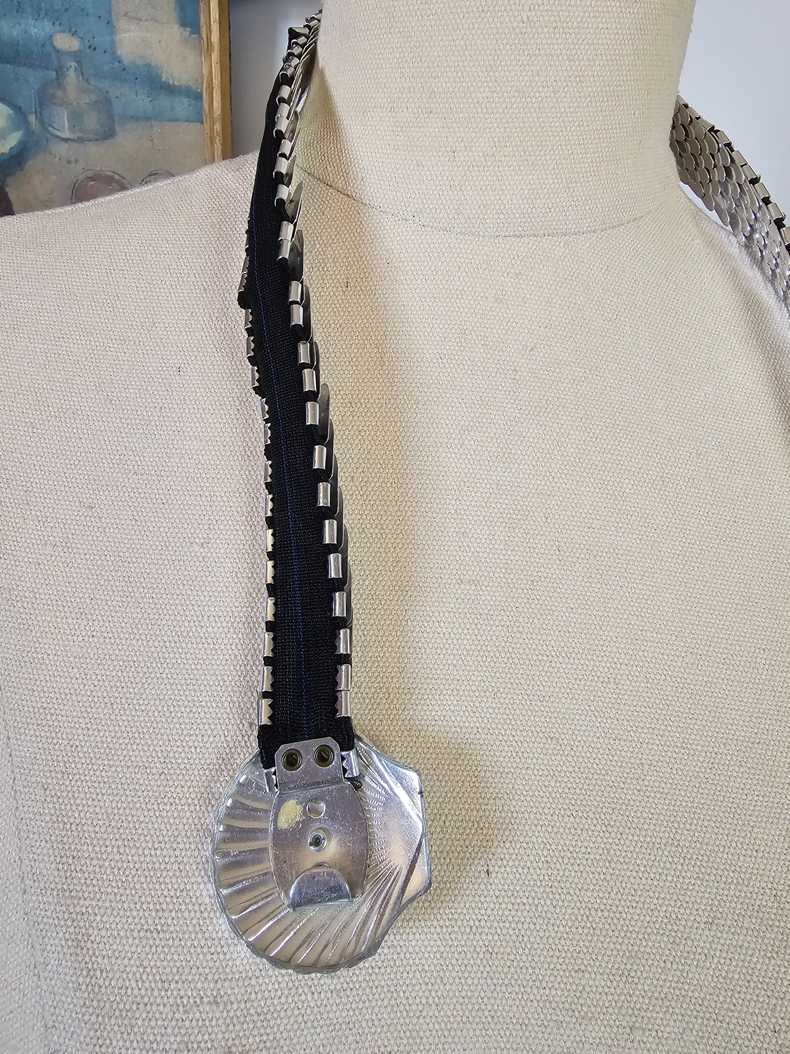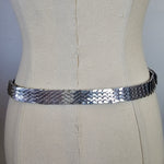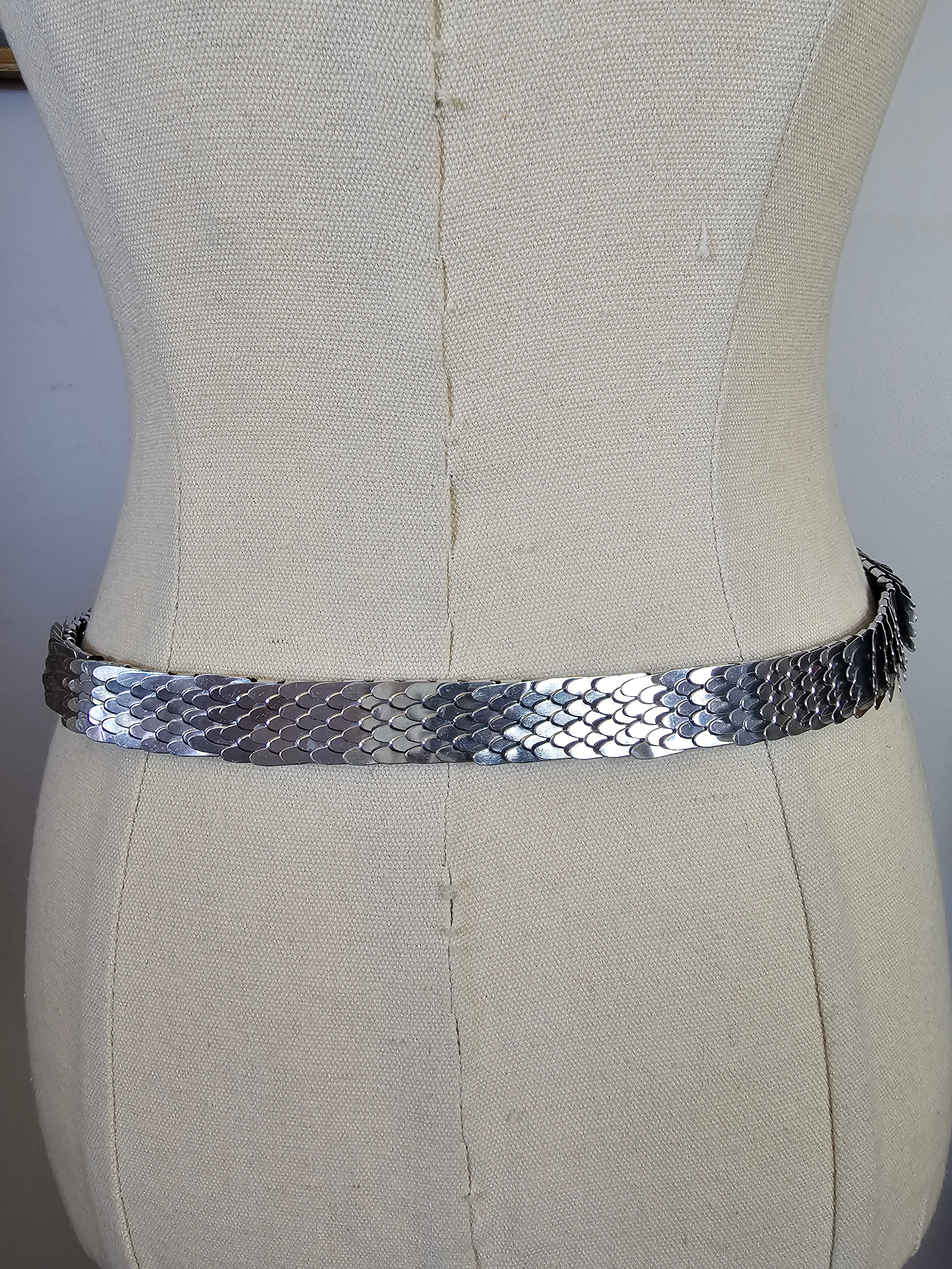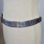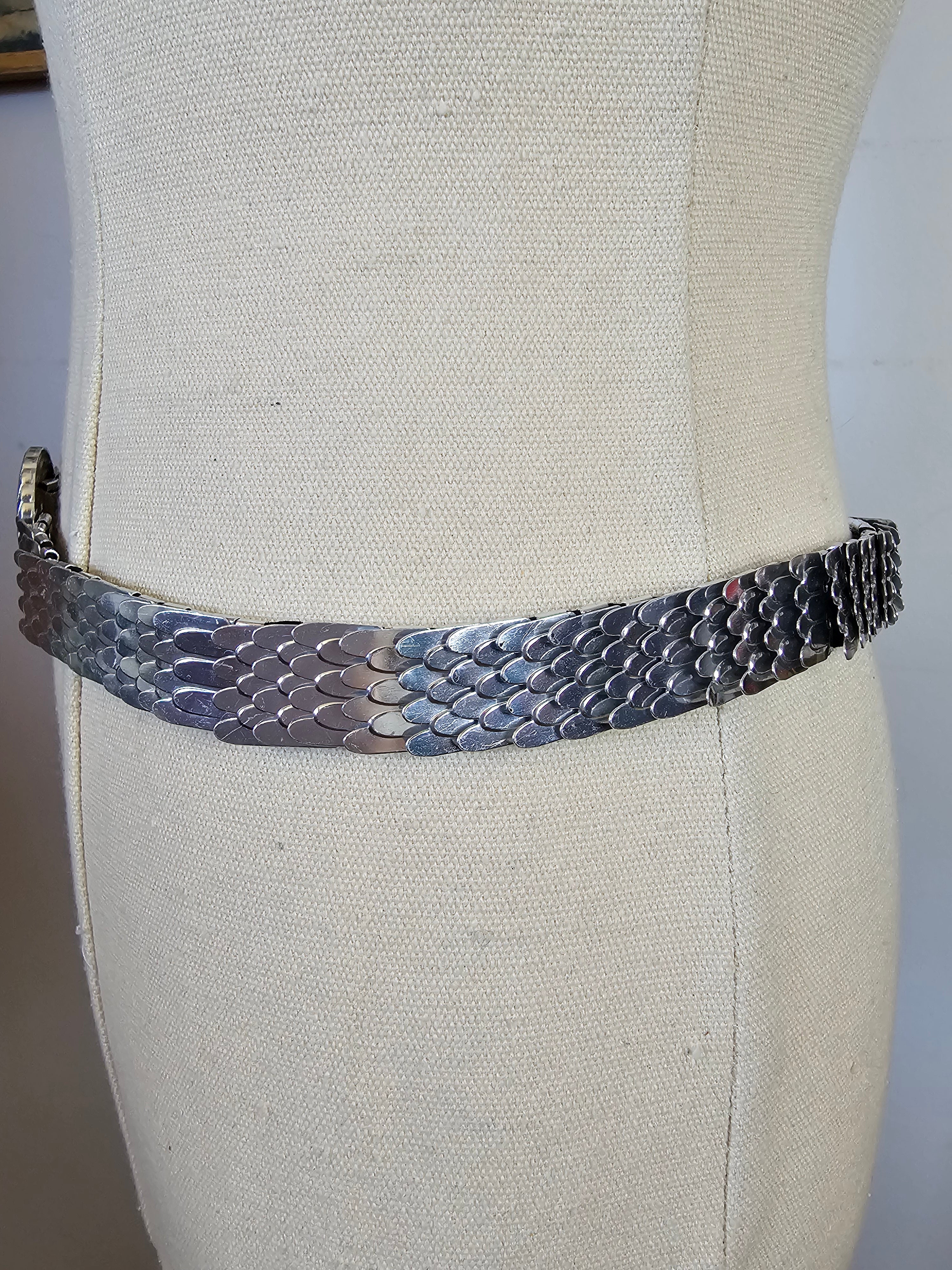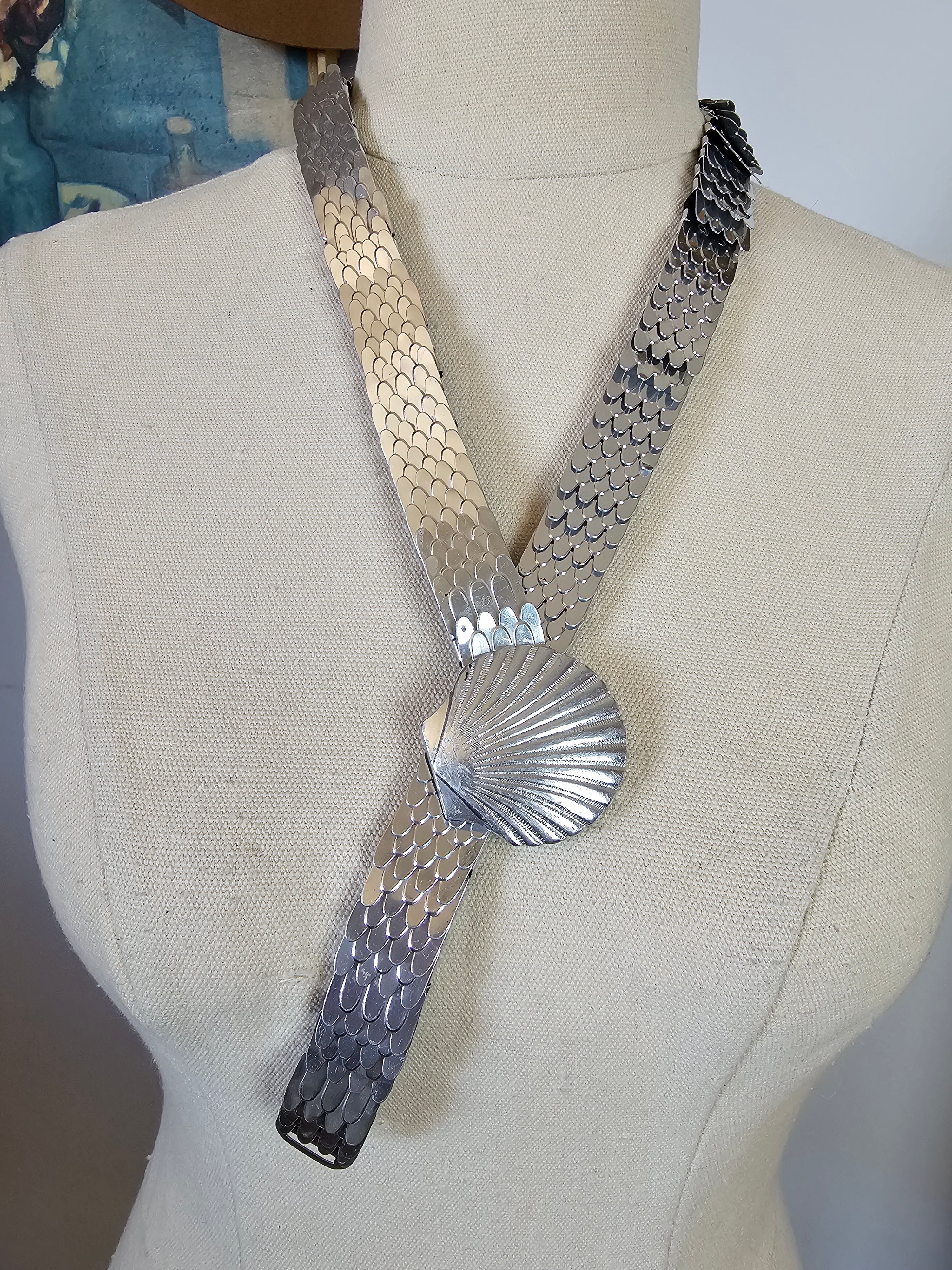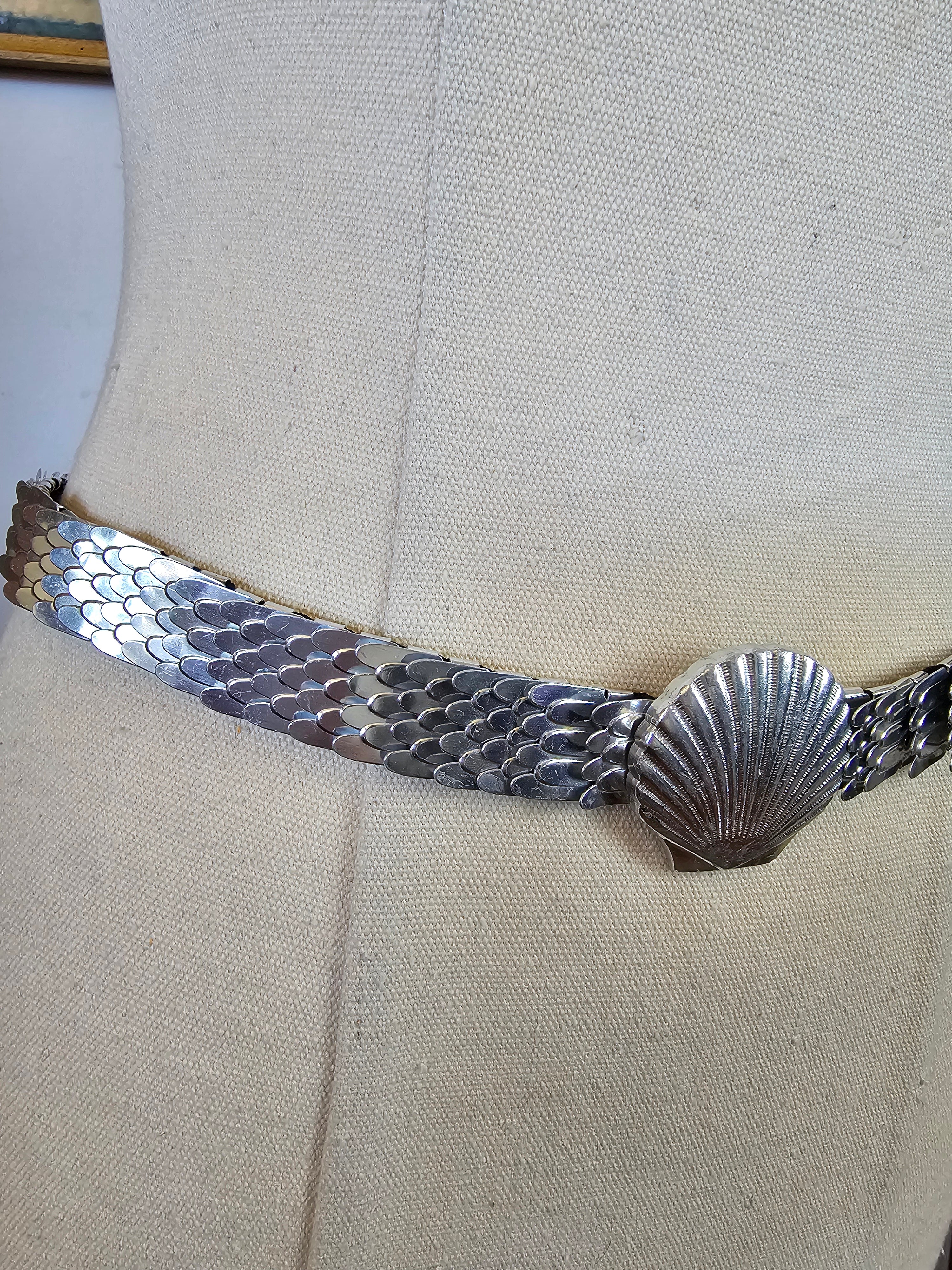 Channel coastal boho vibes with this vintage silver-tone stretch belt, featuring a bold seashell buckle. Its unique fish-scale patterned stretch band adds texture and comfort, making it a standout piece for cinching dresses, blouses, or jumpsuits. Perfect for lovers of ocean-inspired fashion and retro accessories.