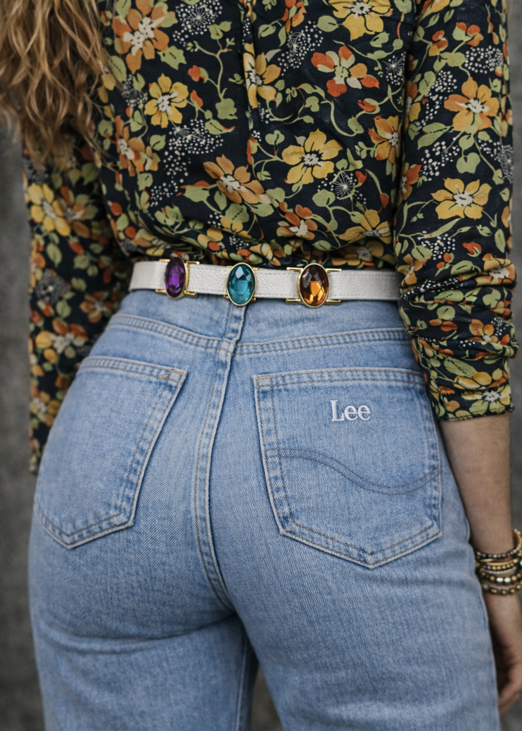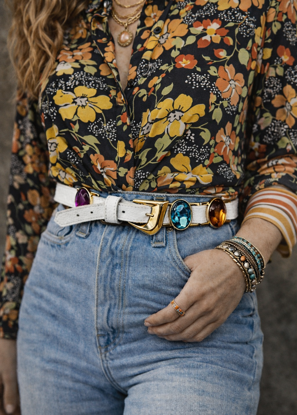 Vintage White Leather Belt with Jewel Tones – 80s Glam Vibes