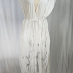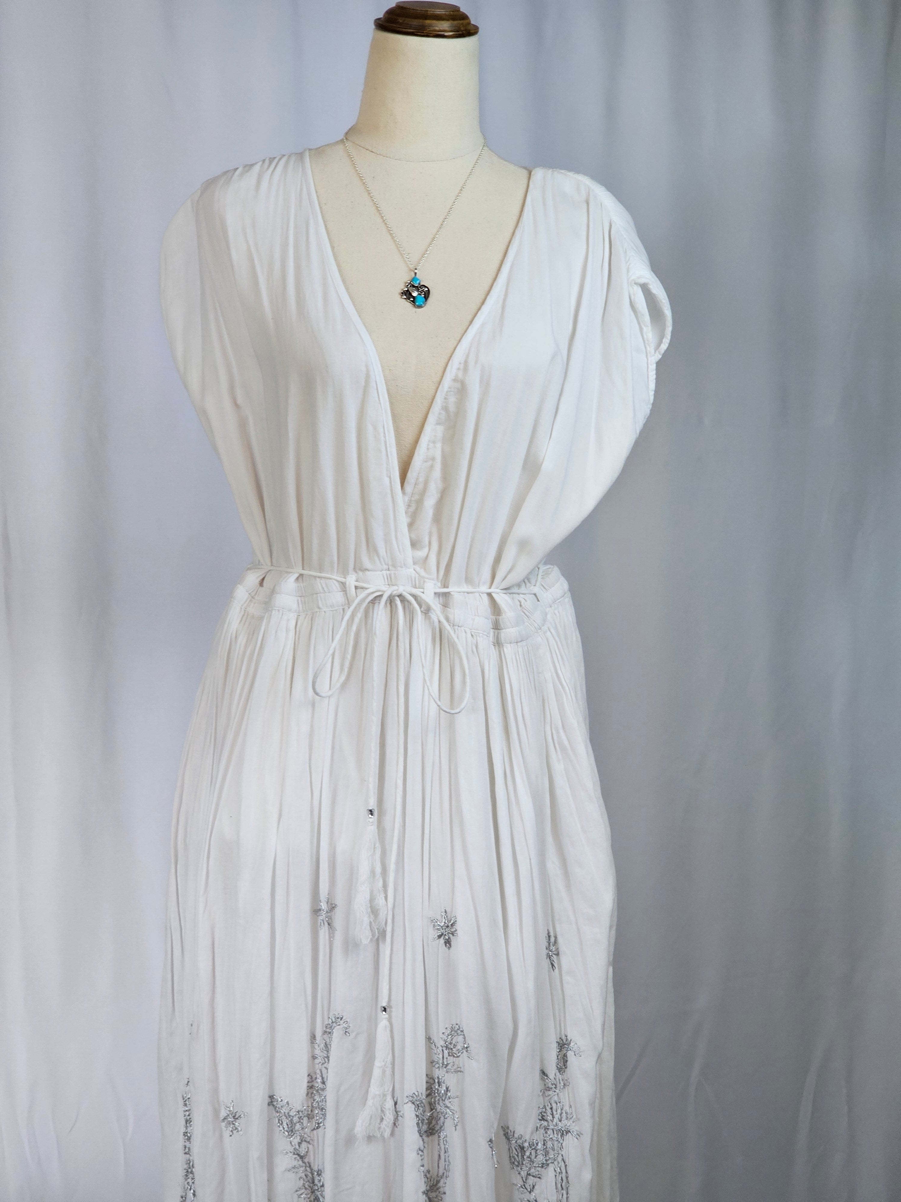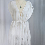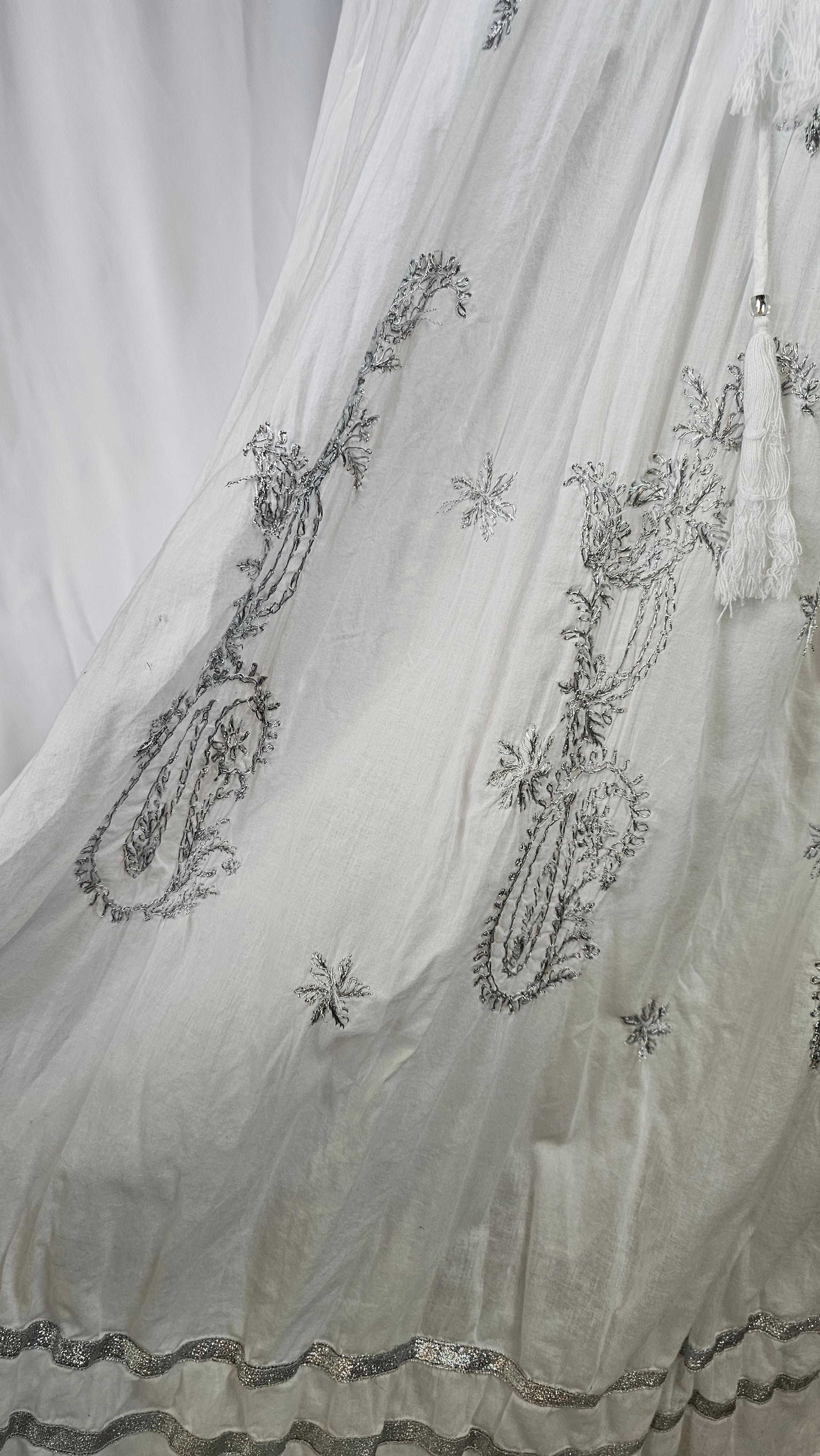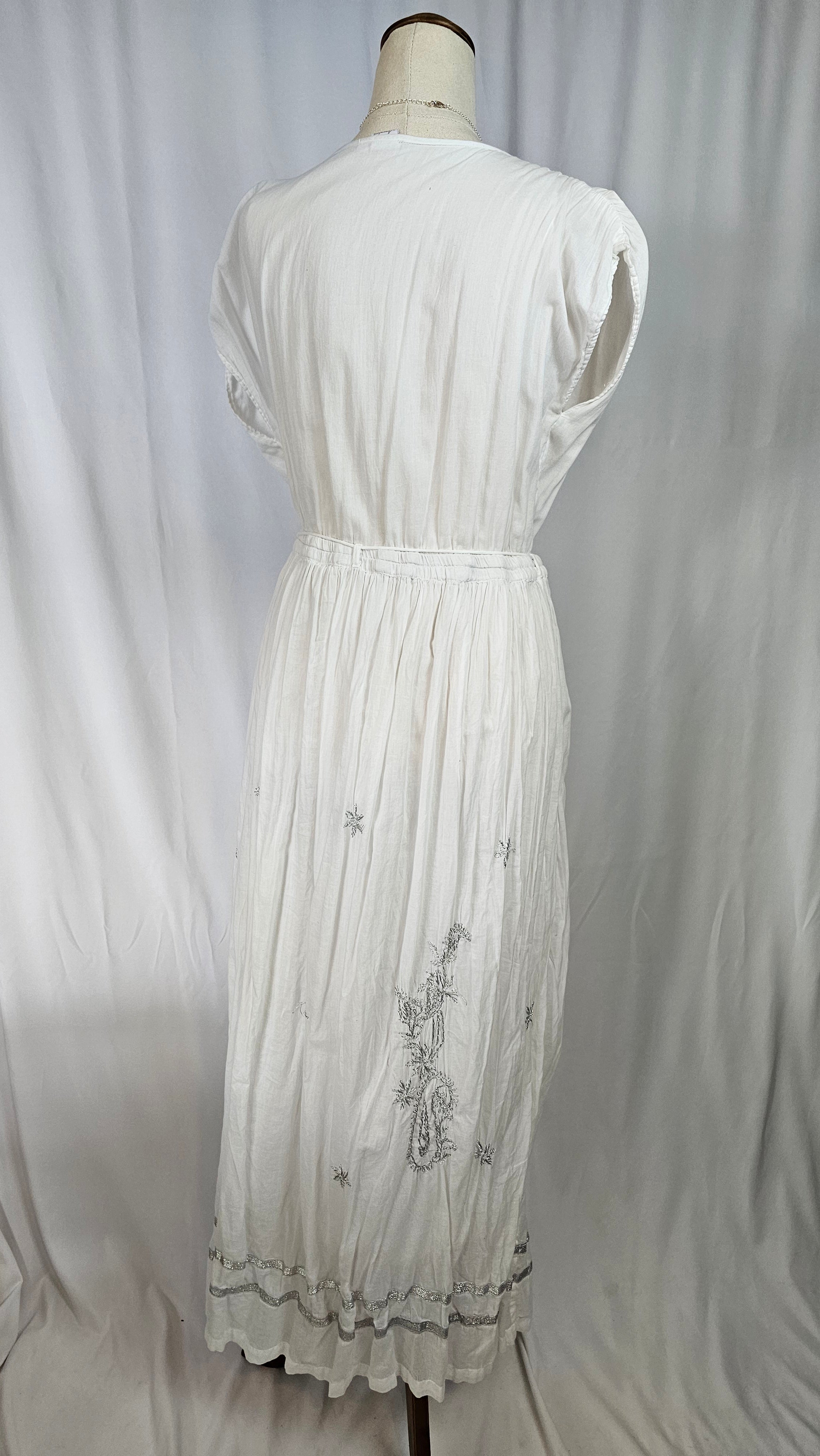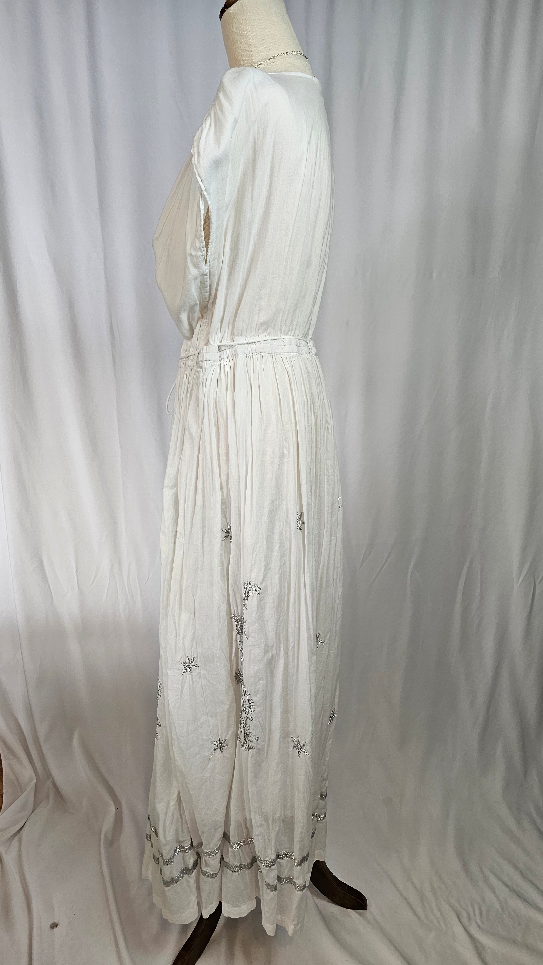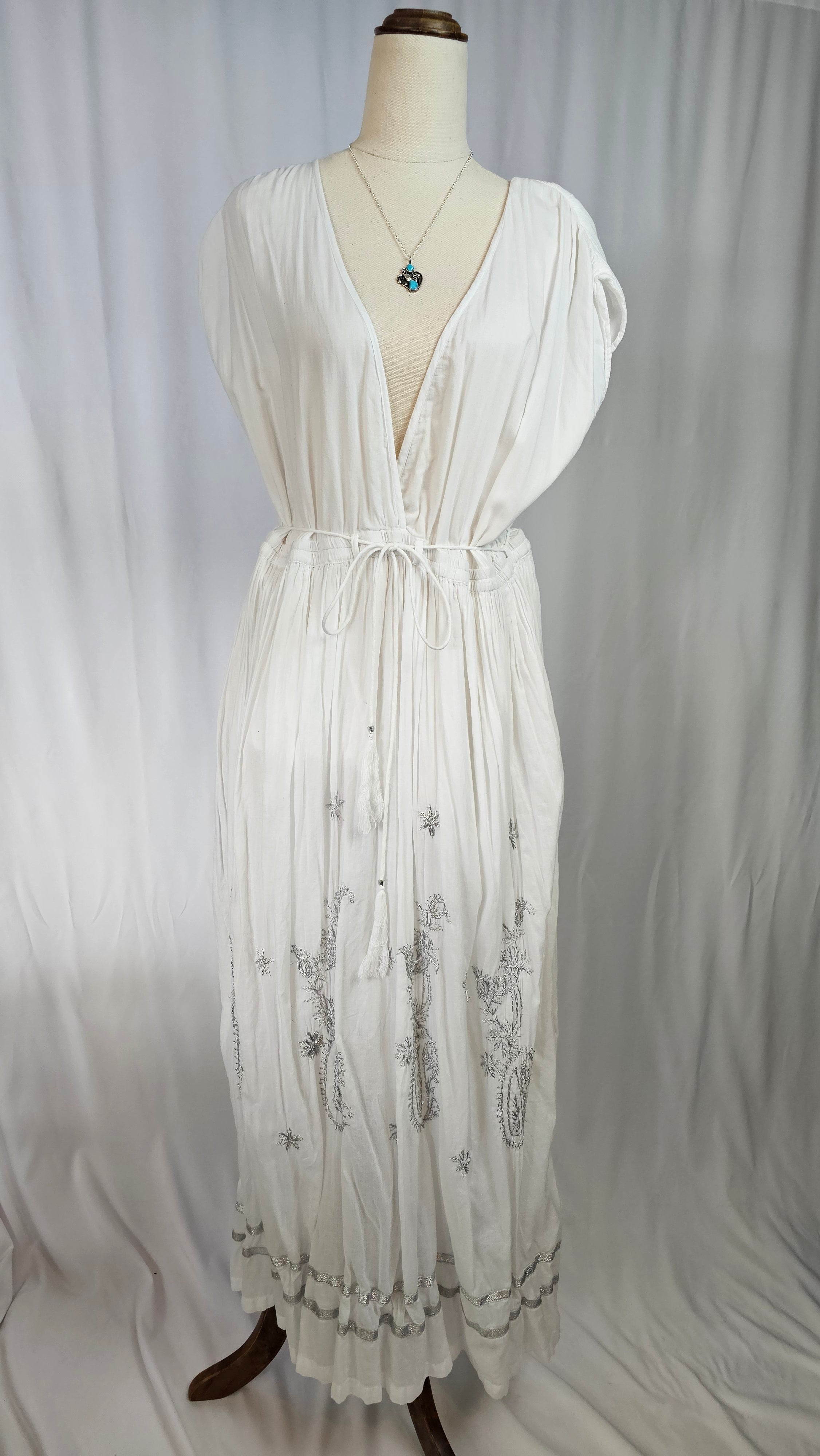 Step into timeless elegance with this boho-inspired maxi dress by Amanda Leya, crafted with care in India. The dress features a lightweight, breathable cotton fabric with delicate silver embroidery, including intricate star and floral patterns that add a touch of understated glamour. The cinched waist tie ensures a flattering fit, while the deep V-neckline and flowing skirt embody effortless style. L/XL
