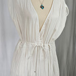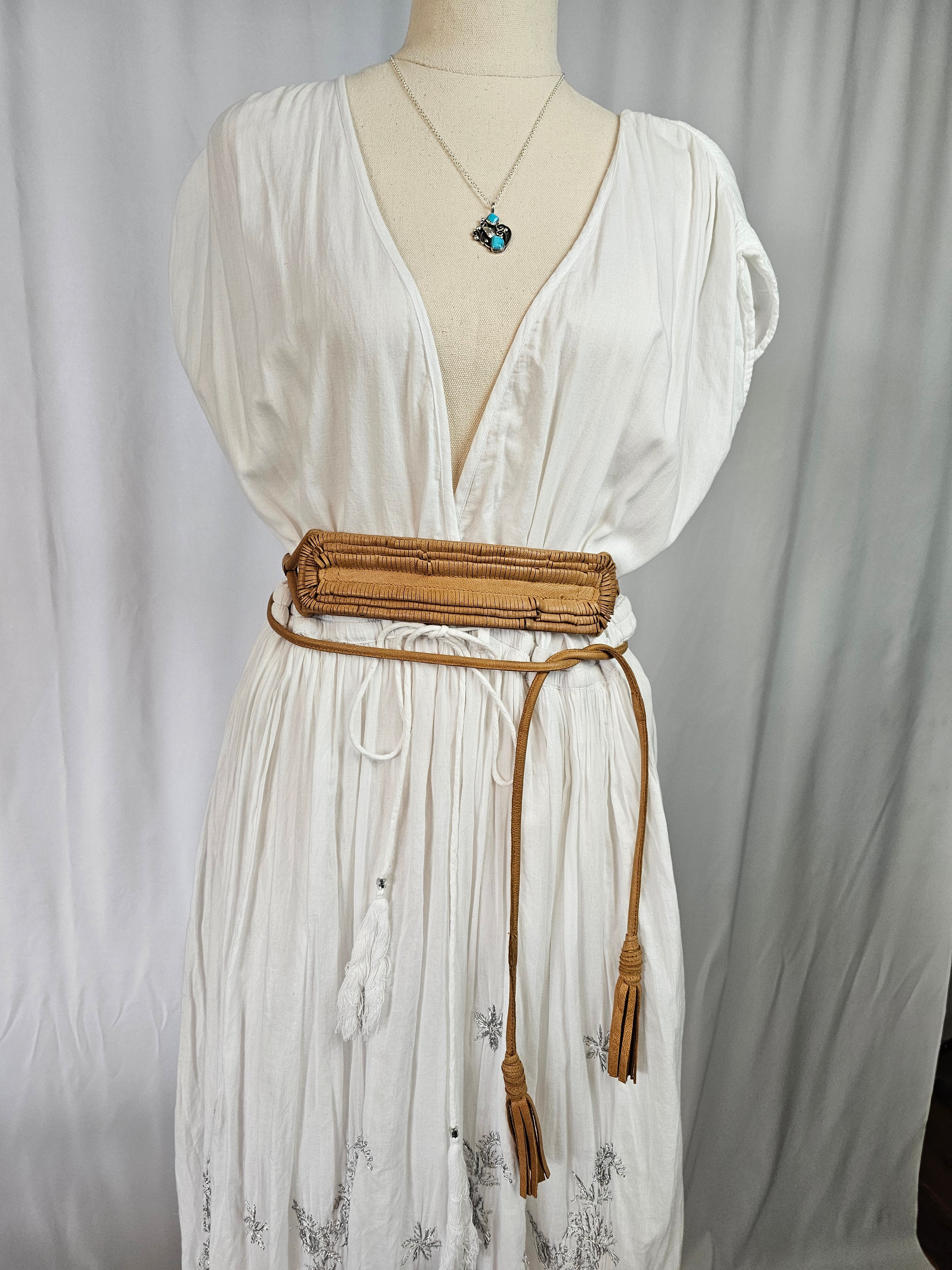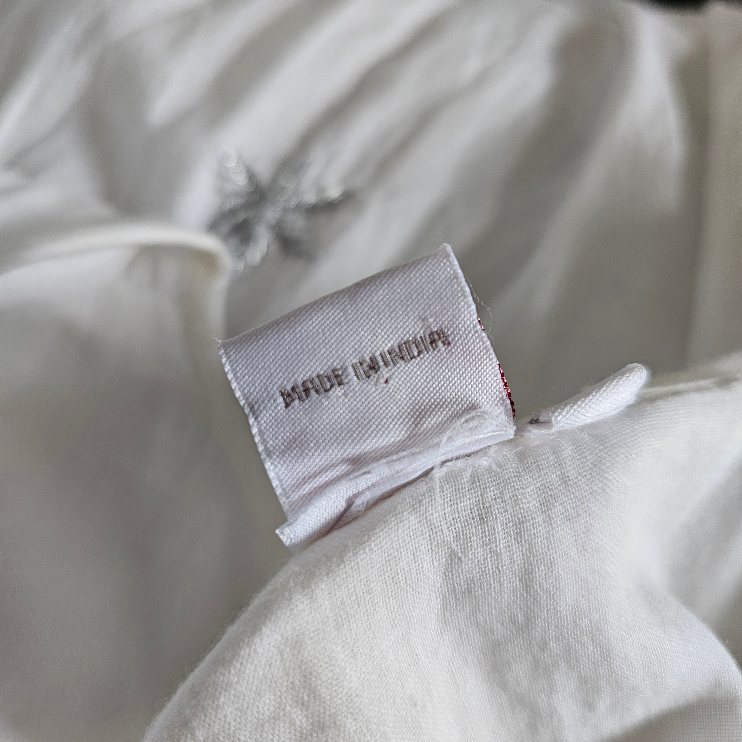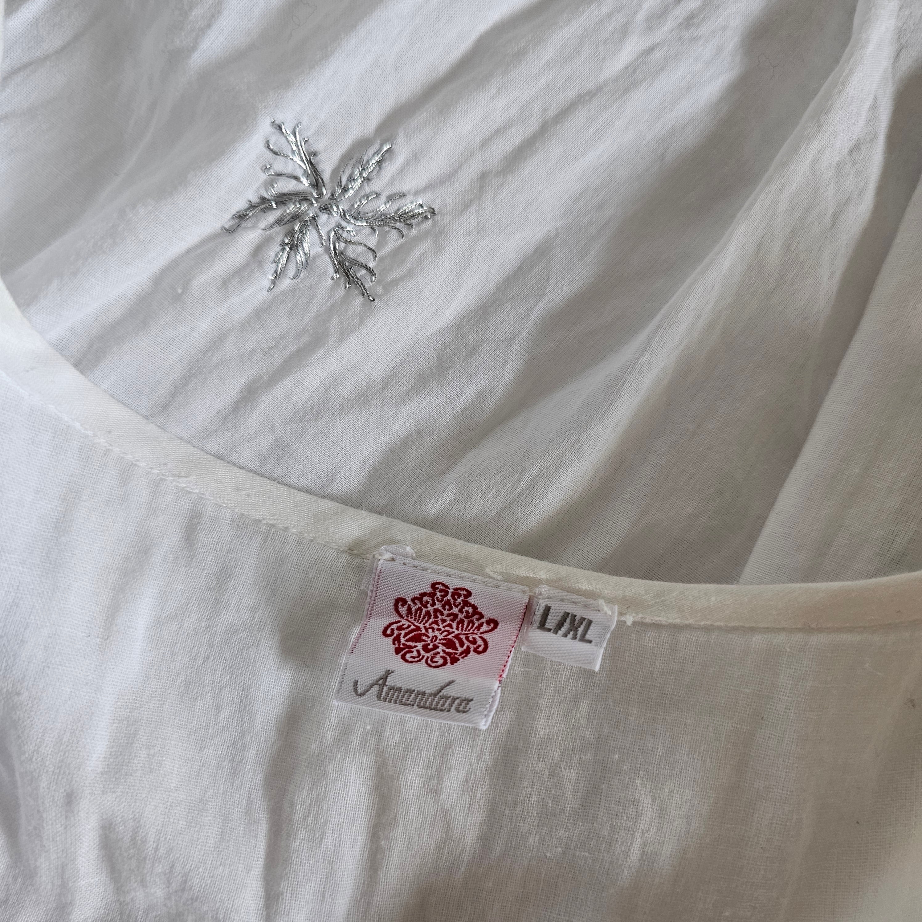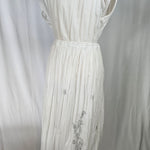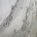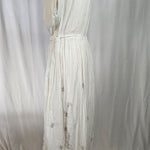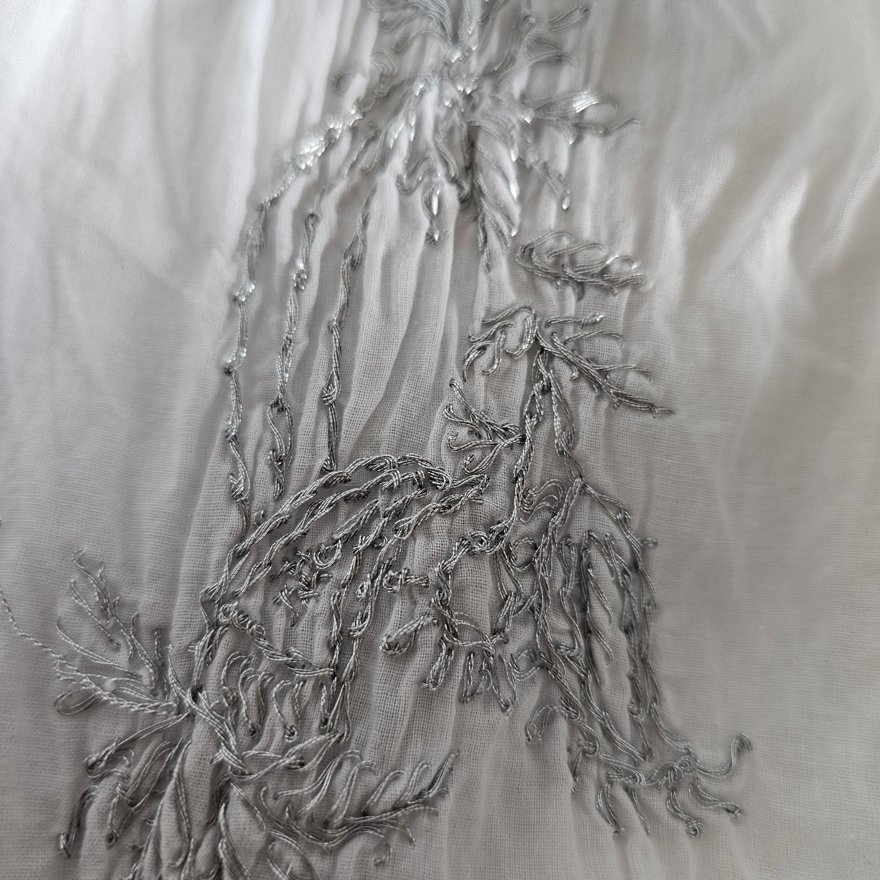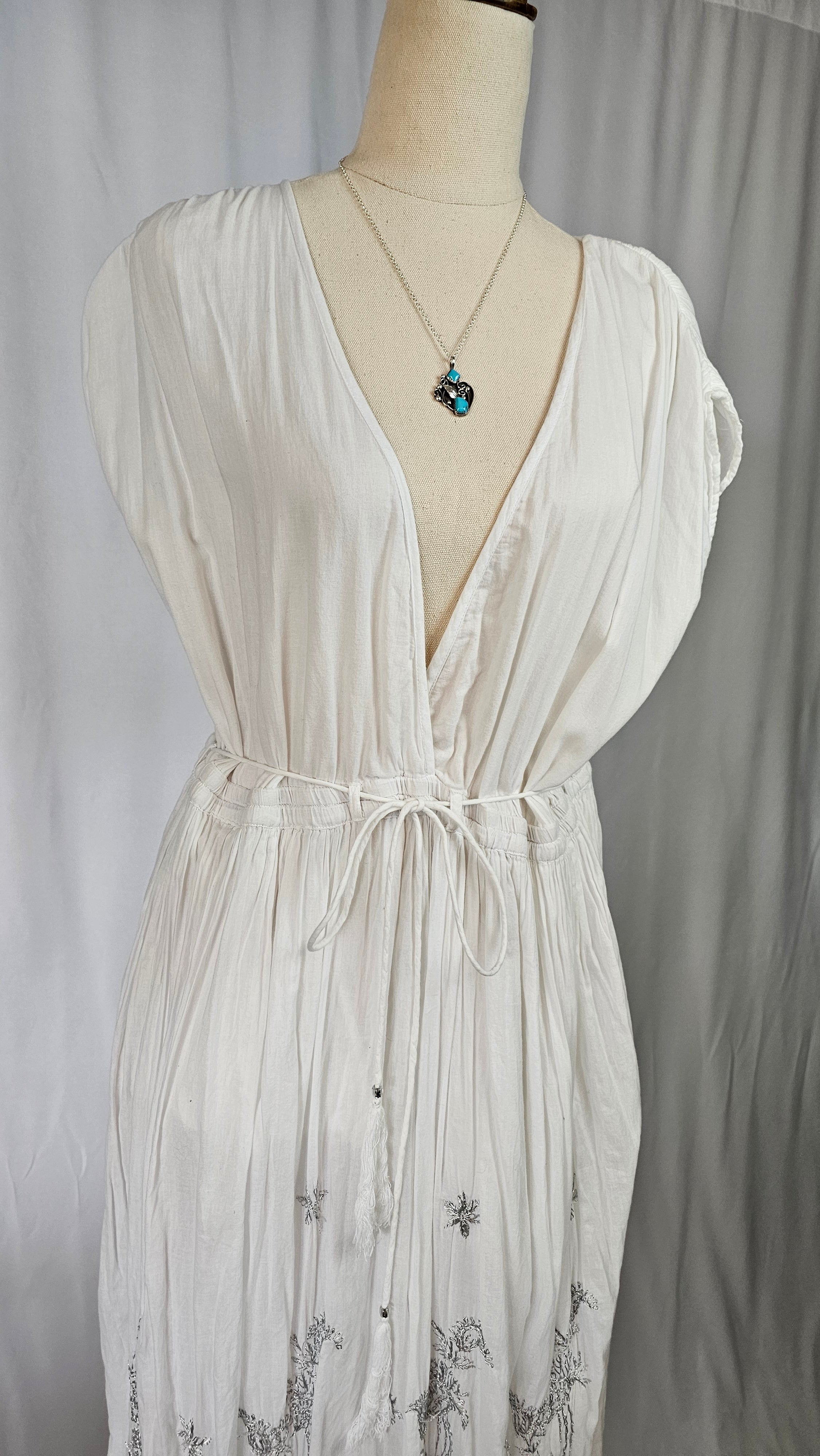 Step into timeless elegance with this boho-inspired maxi dress by Amanda Leya, crafted with care in India. The dress features a lightweight, breathable cotton fabric with delicate silver embroidery, including intricate star and floral patterns that add a touch of understated glamour. The cinched waist tie ensures a flattering fit, while the deep V-neckline and flowing skirt embody effortless style. L/XL