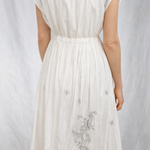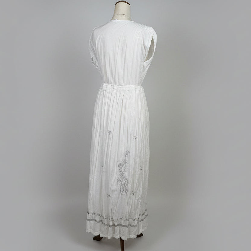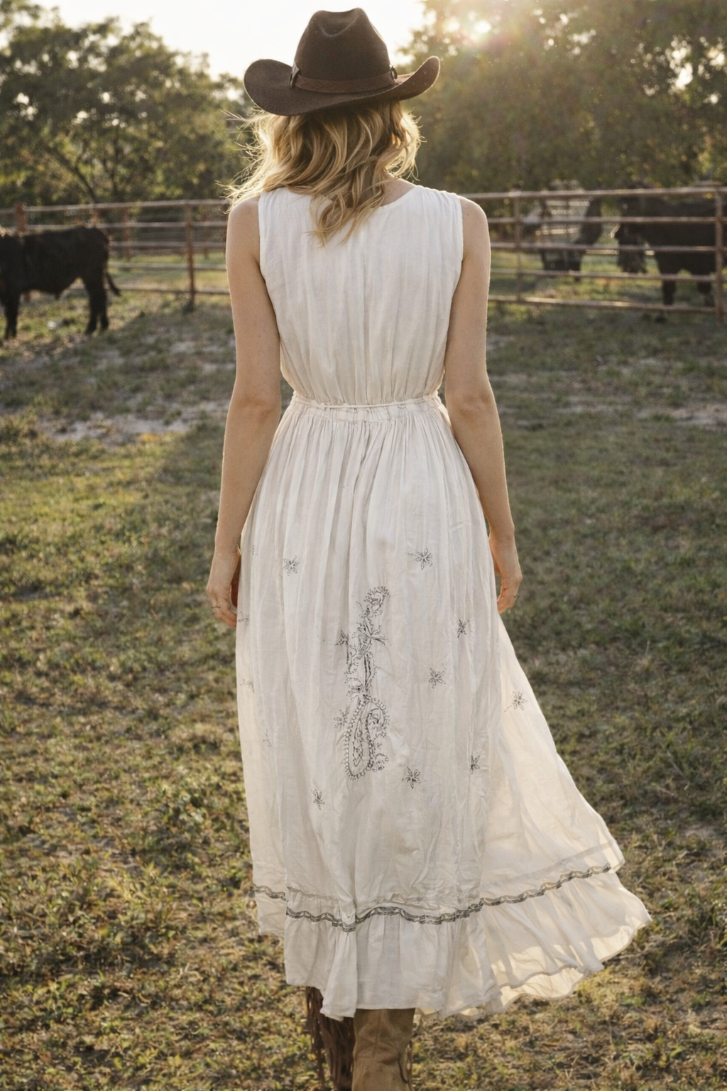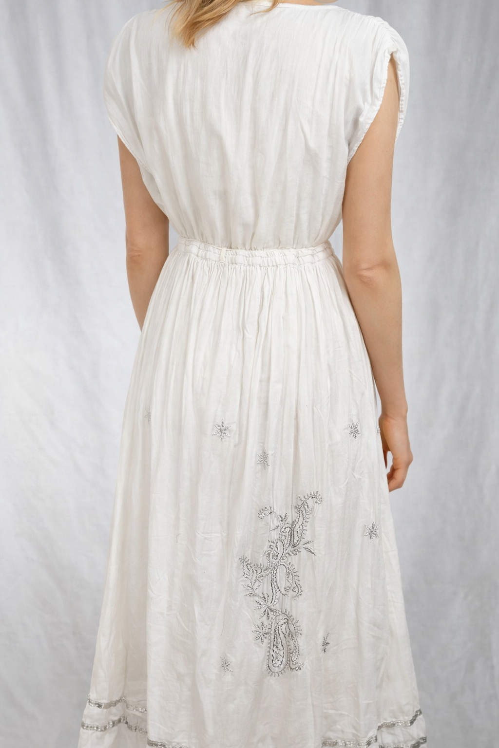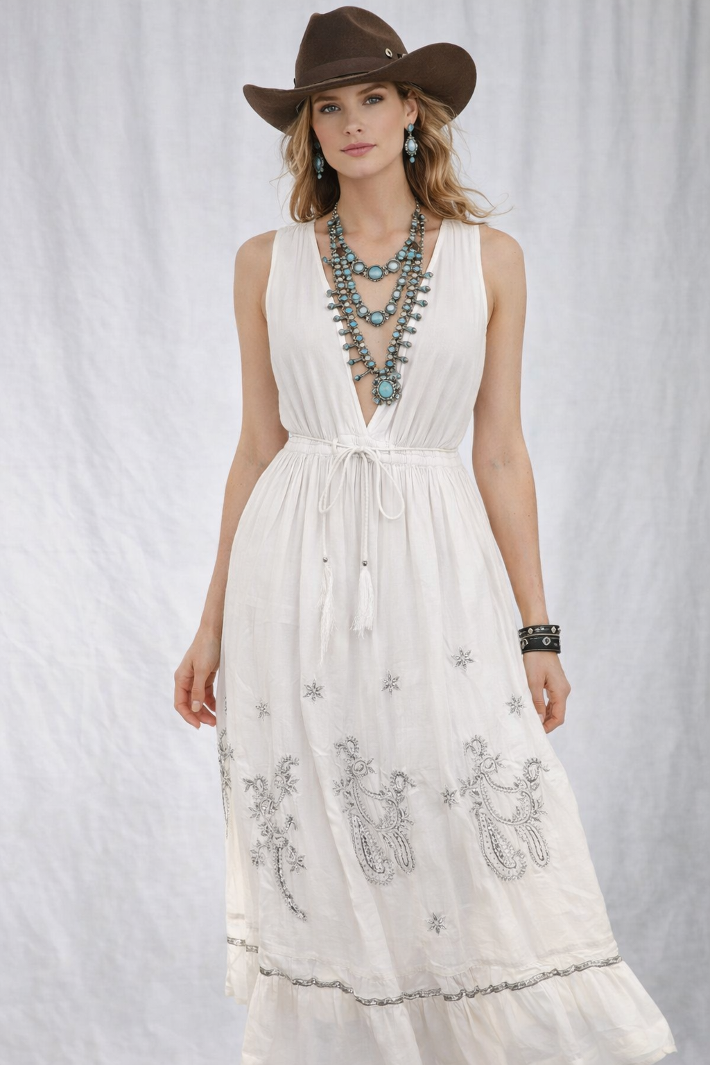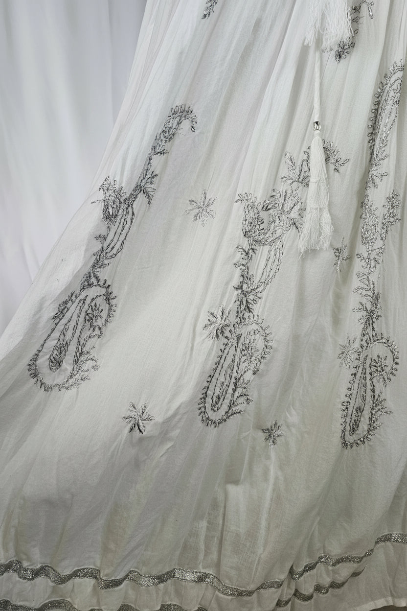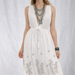 Step into timeless bohemian elegance with this Amanda Leya maxi dress, beautifully crafted in India from lightweight, breathable cotton. Delicate silver embroidery — featuring intricate star and floral motifs — adds a subtle shimmer and artisanal charm. The deep V neckline and adjustable waist tie create a flattering, feminine silhouette, while the flowing skirt moves with effortless grace.