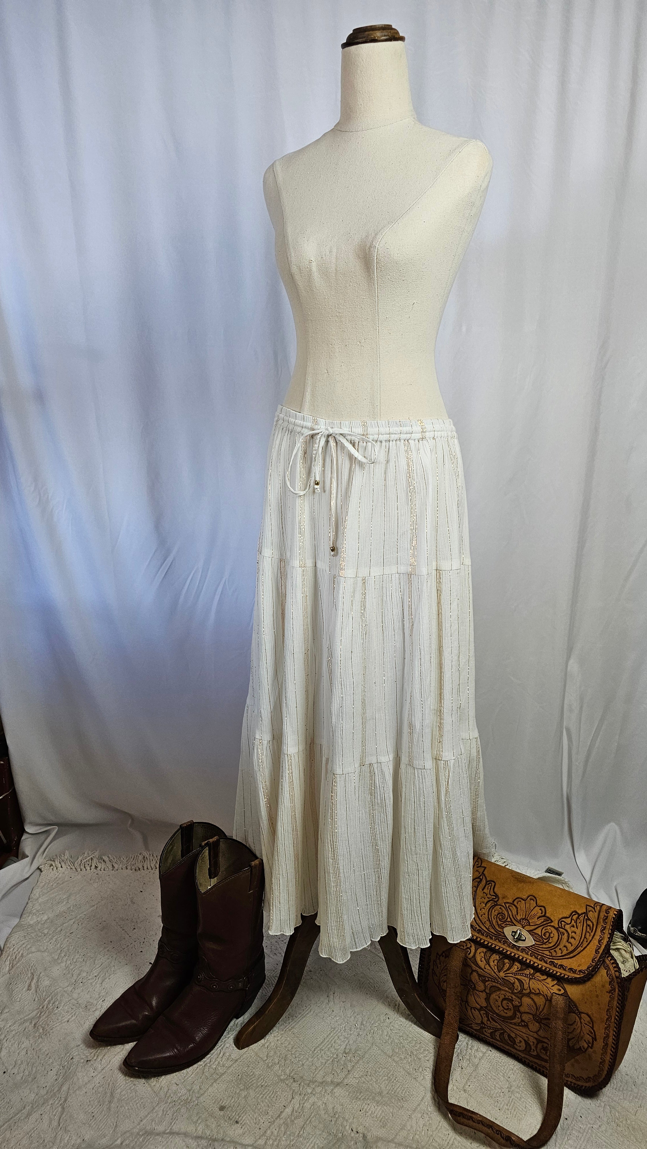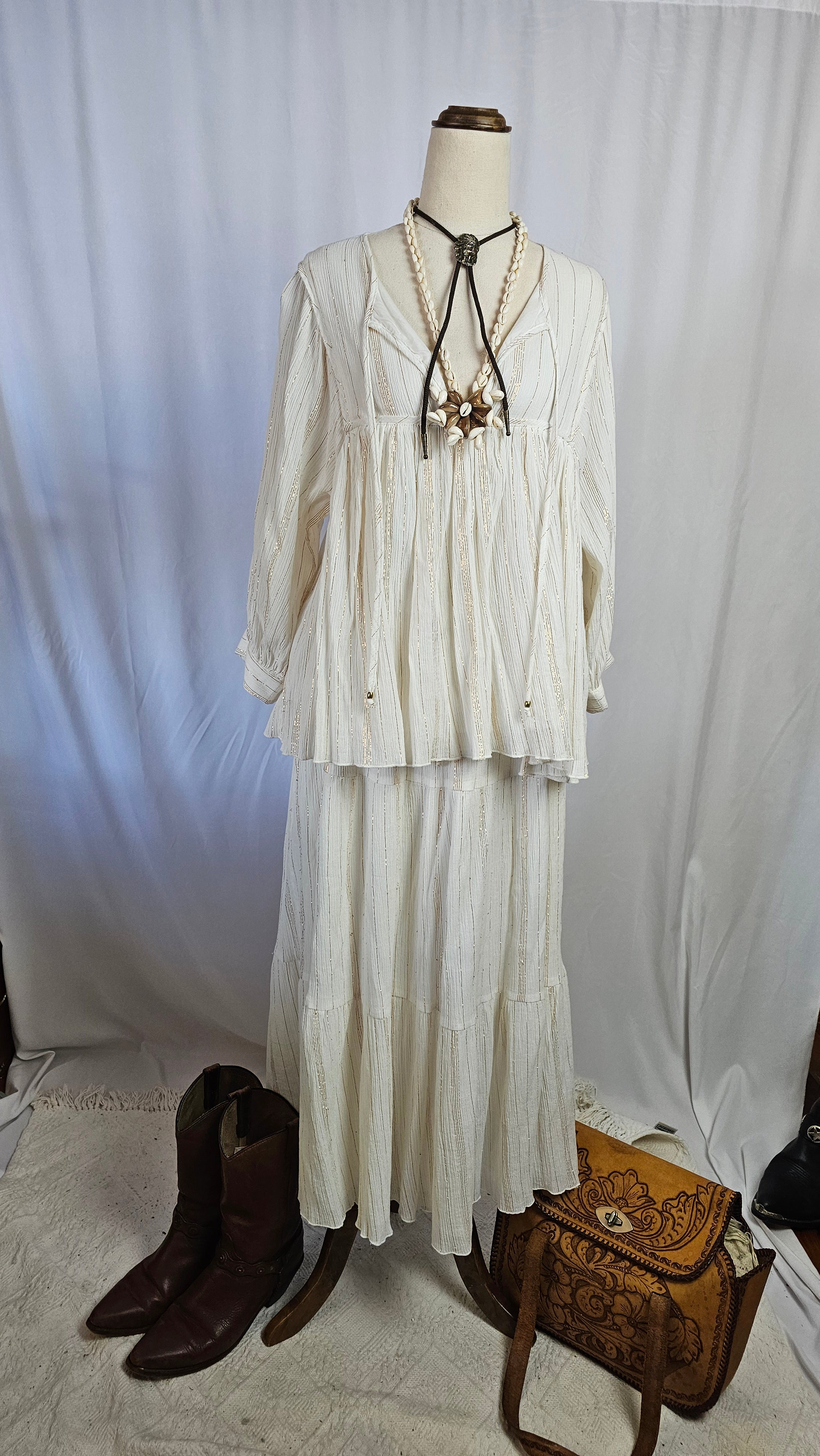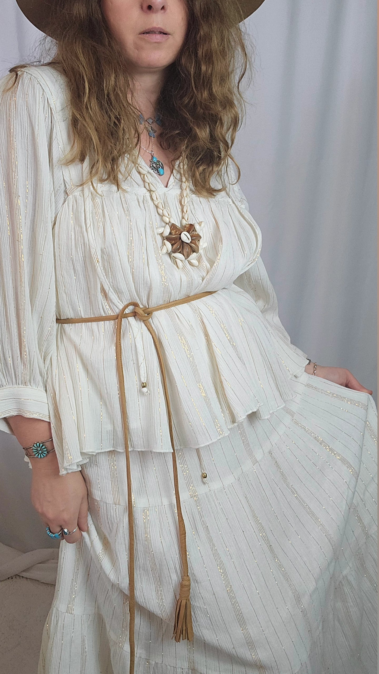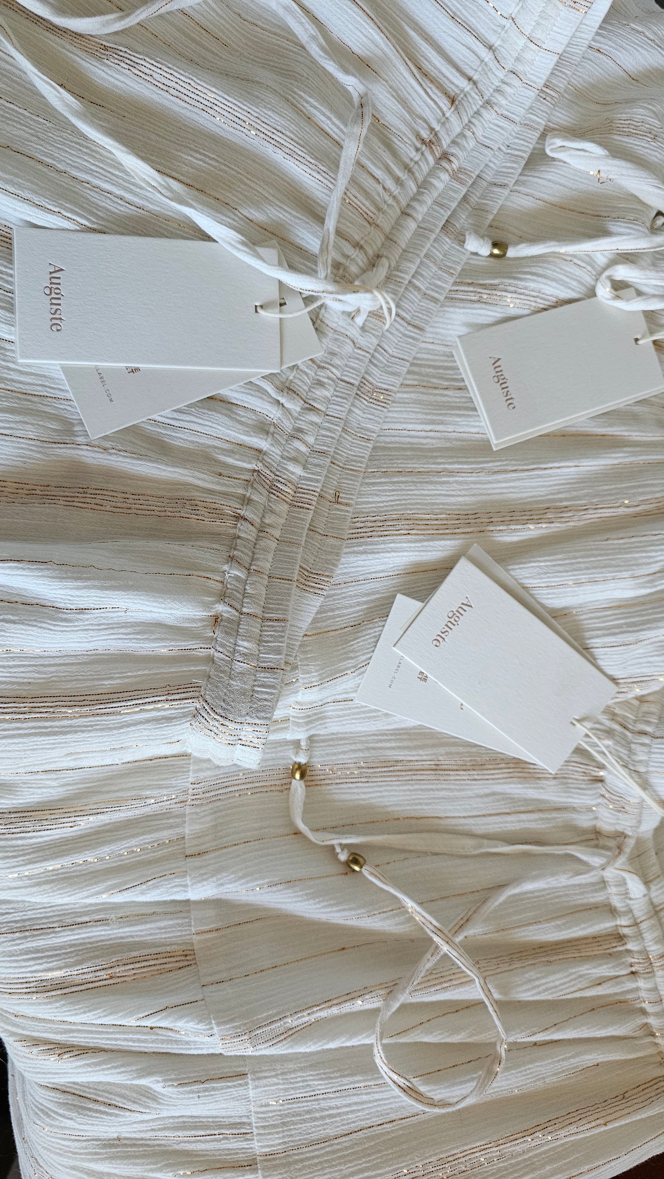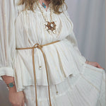 Add a touch of effortless elegance to your wardrobe with this beautiful Auguste Liesel blouse. Designed in a soft ivory tone with shimmering gold thread accents, this blouse is perfect for a bohemian-chic look. Features include: