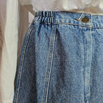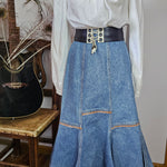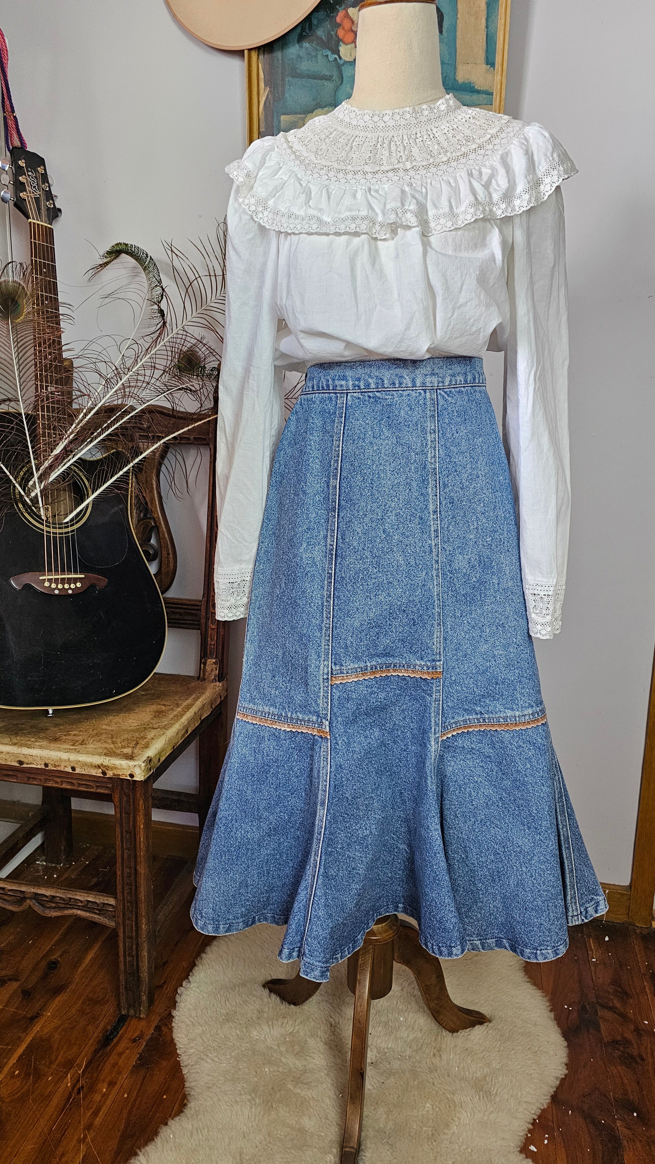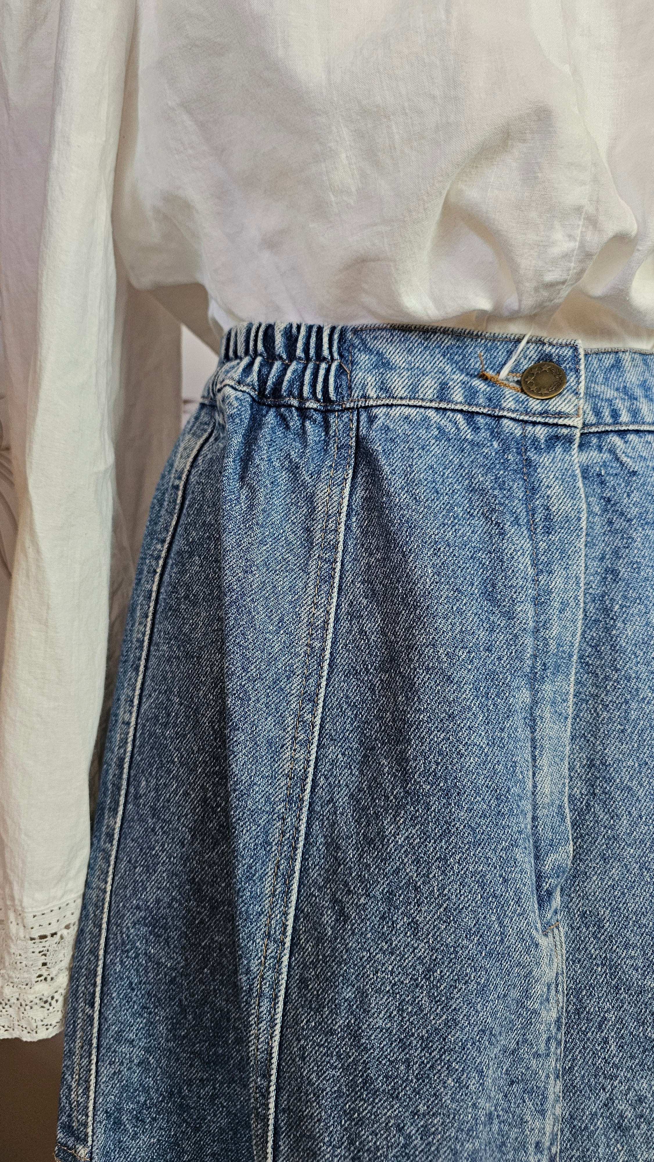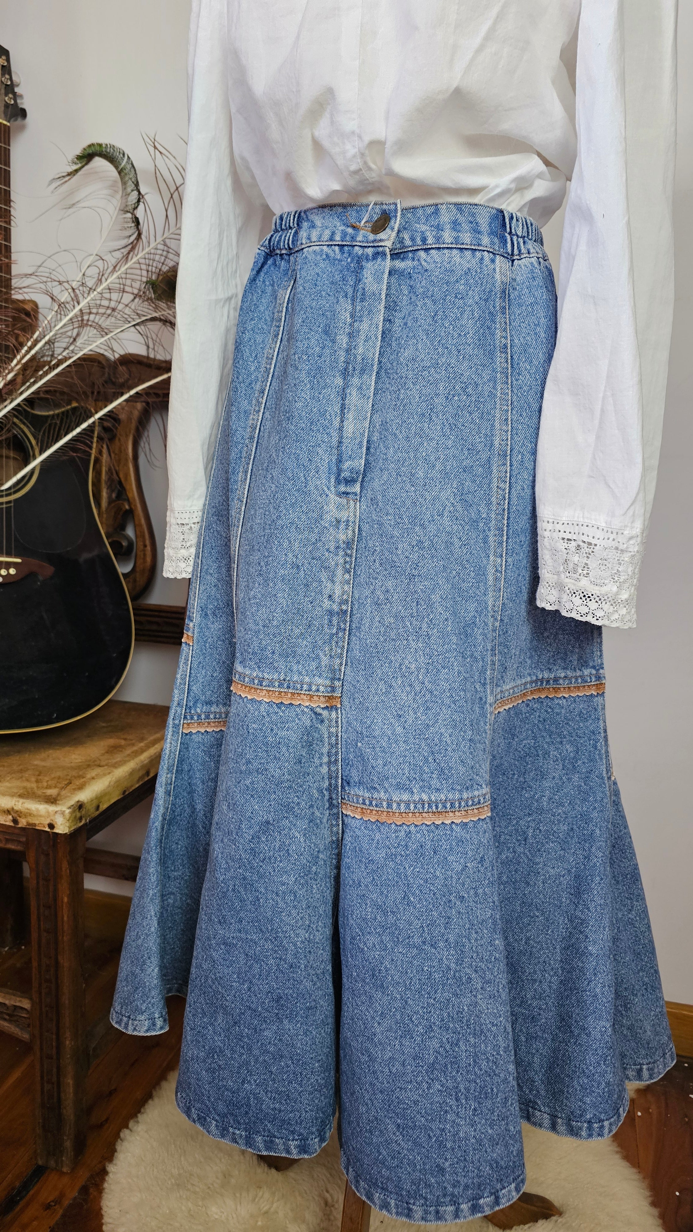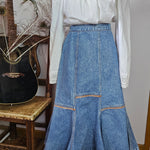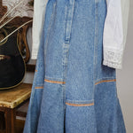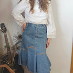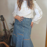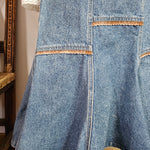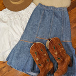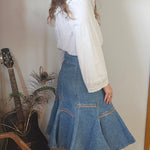 A rare Aussie-made gem from Calypso of Melbourne, this vintage denim skirt brings flirty prairie flair with a structured edge. Featuring contrast panel seams, a softly flared hem, and an elasticised back waistband for comfort, it’s a timeless staple with just the right amount of vintage charm.